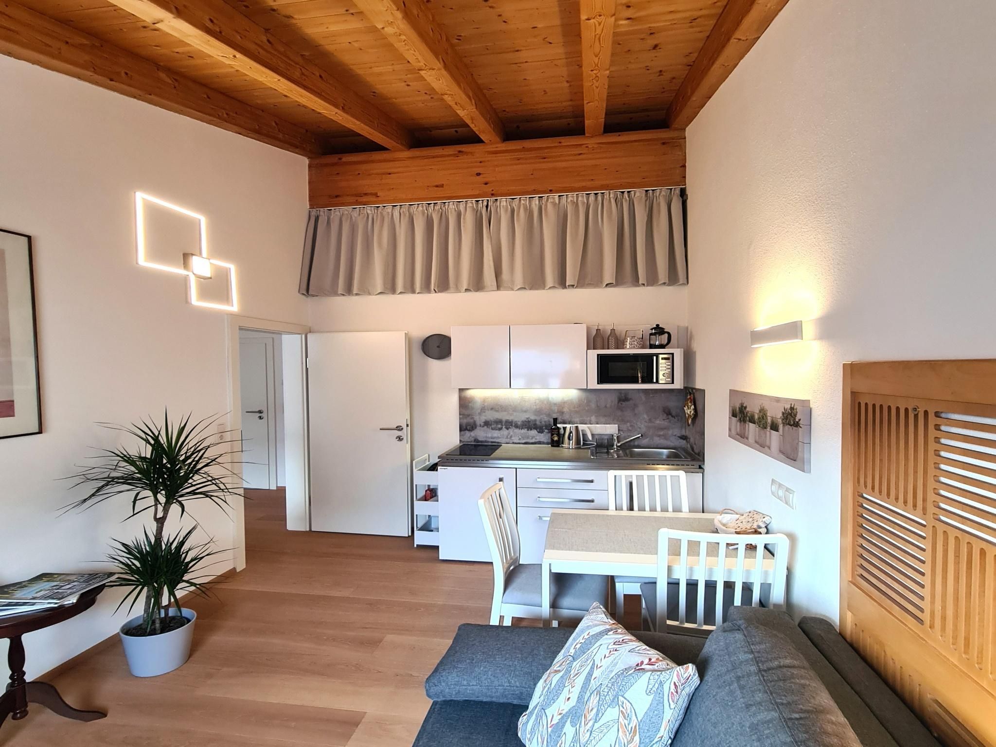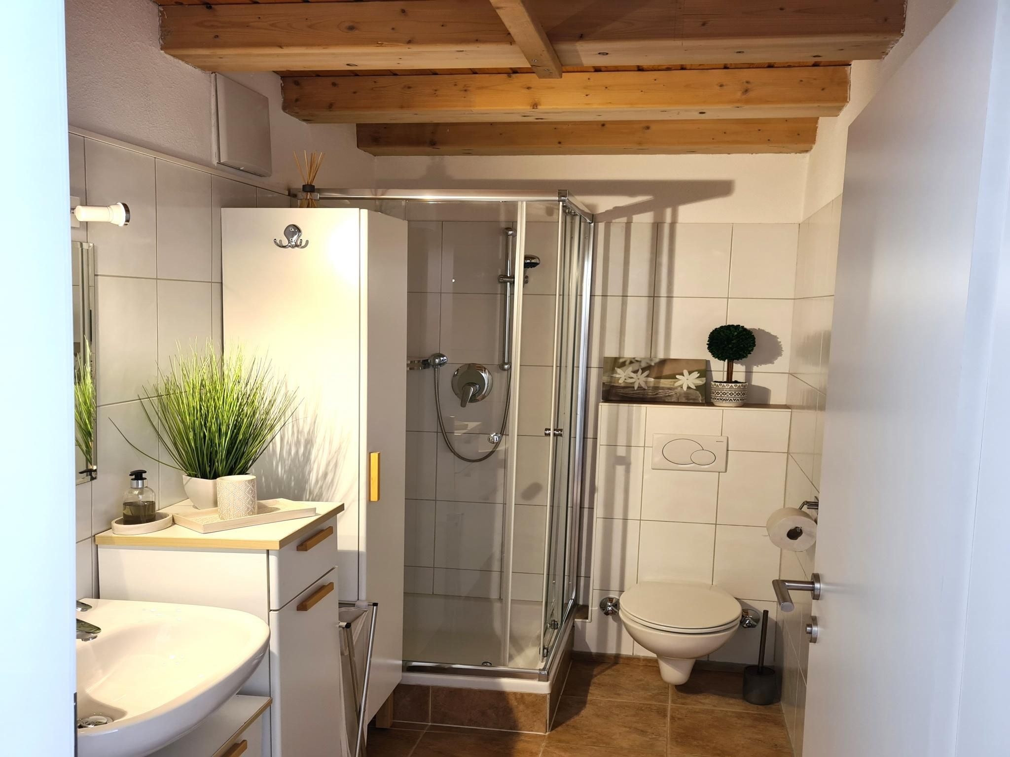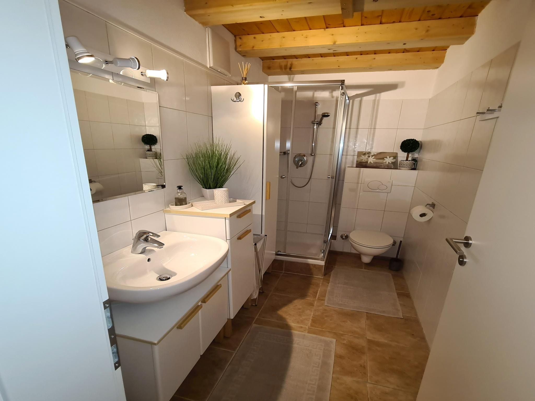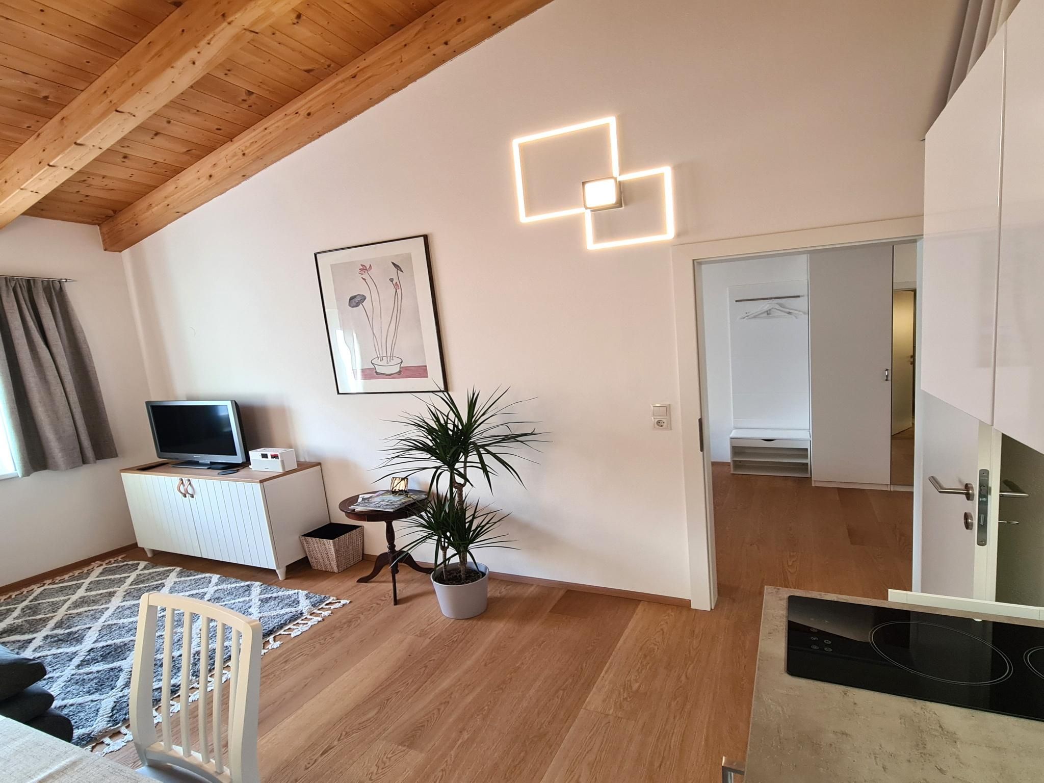 The apartment is 30 m² and has a bedroom, a living room with a kitchen and a sofa bed, and a bathroom with a shower and toilet. The apartment is on the 1st floor of a two-family house and was completely refurbished in early 2023 (oak parquet floors, doors, shower, electrics, LED lighting, fittings, furniture, etc.), including a new mini designer kitchen. The high ceilings (up to 4 metres) reach up to the rafters and give the apartment a special flair.