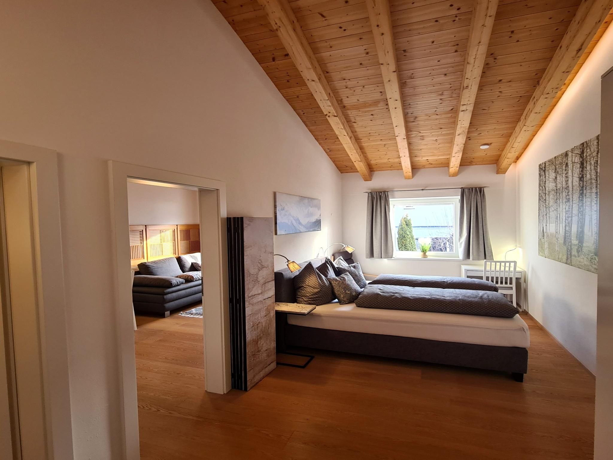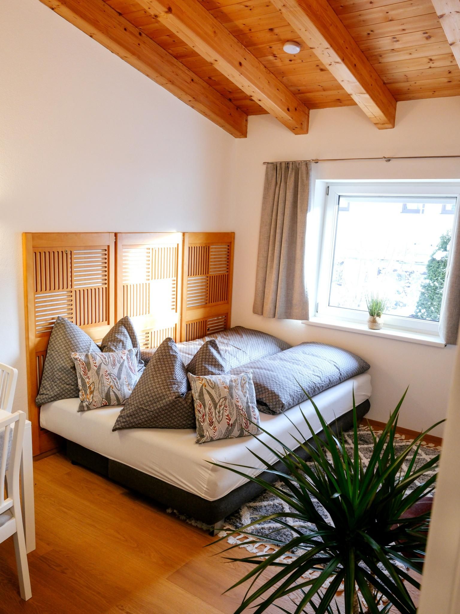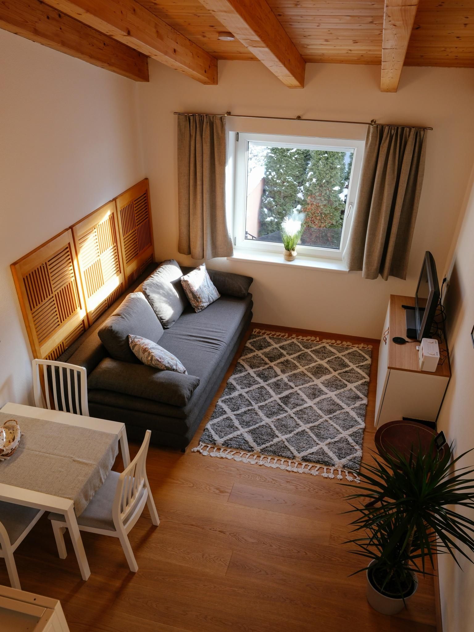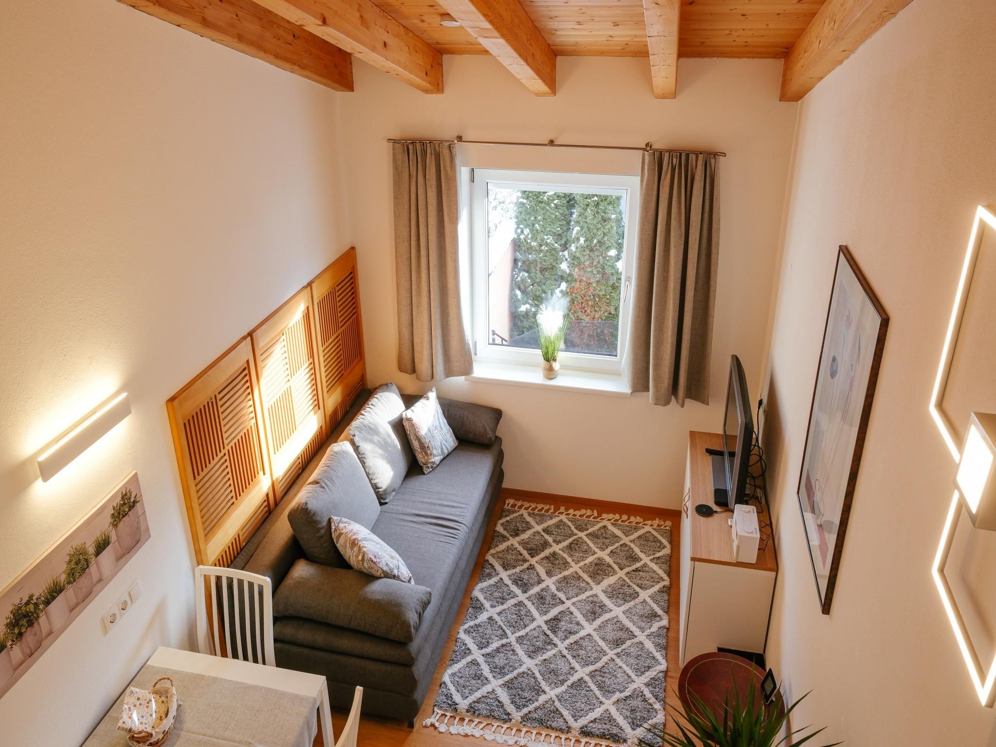 The apartment is 30 m² and has a bedroom, a living room with a kitchen and a sofa bed, and a bathroom with a shower and toilet. The apartment is on the 1st floor of a two-family house and was completely refurbished in early 2023 (oak parquet floors, doors, shower, electrics, LED lighting, fittings, furniture, etc.), including a new mini designer kitchen. The high ceilings (up to 4 metres) reach up to the rafters and give the apartment a special flair.