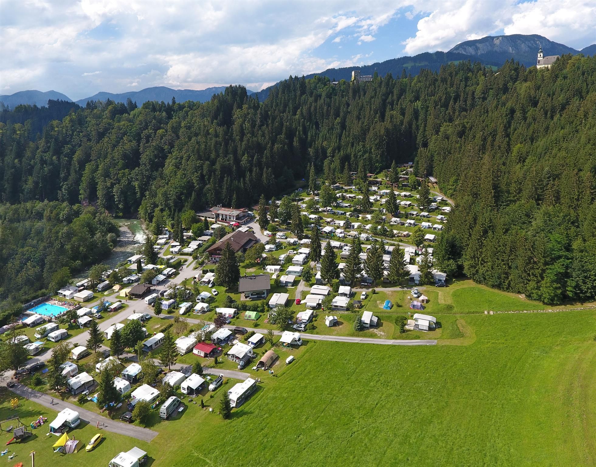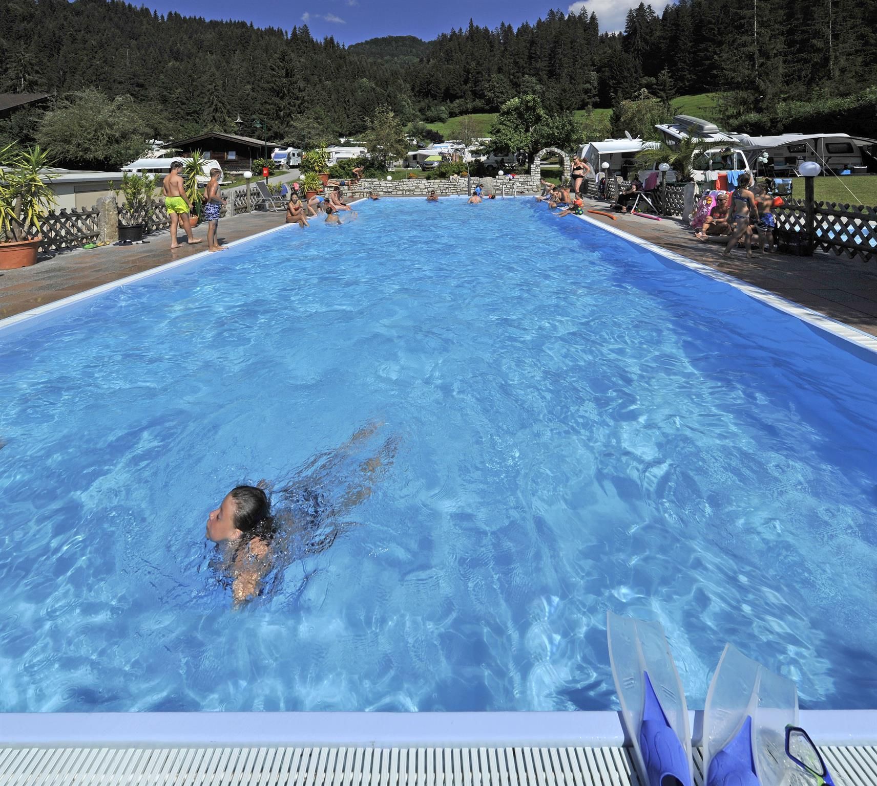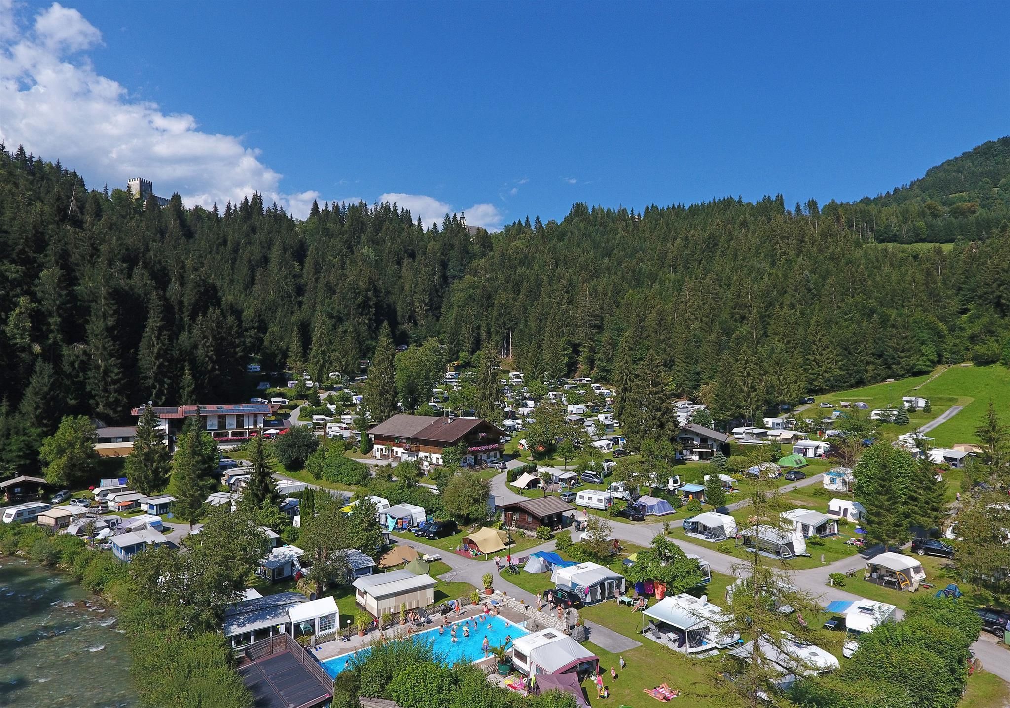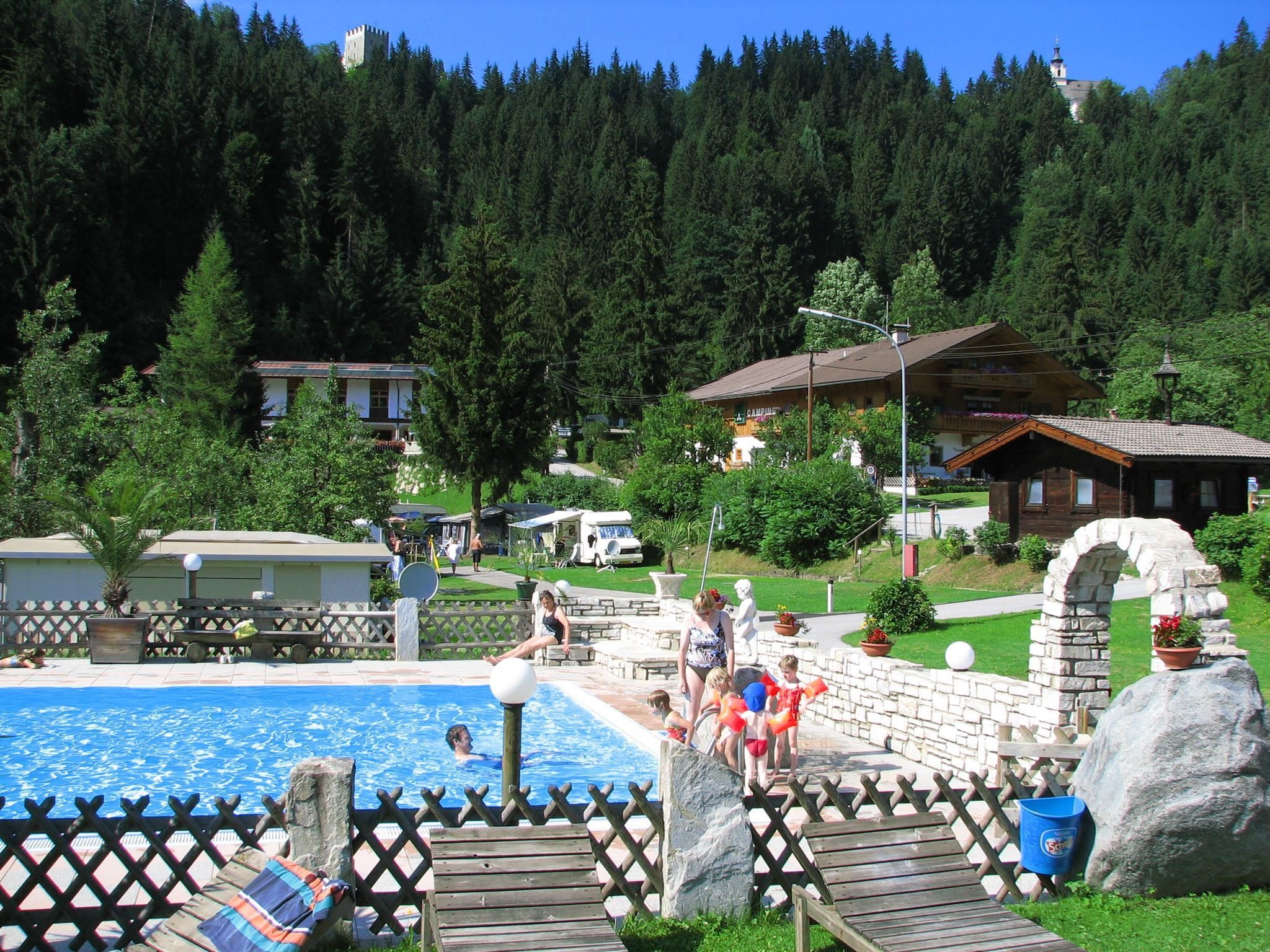 The ideal holiday resort for the whole family 200 sites on a terraced meadow terrain with electricity-, TV-, Internet-, water- and wastewater connections. Wi-Fi available. There is a large children’s playground, ping-pong, volleyball and a solar heated outdoor pool with a paddling pool. Austria’s 1st "washing country" and "body-wash". Camping comfort "par excellence". After a hiking tour or skiing day relax in the sauna, steam bath, infra red booth, solarium and whirl pool. Illuminated toboggan run, free ski bus, storage and drying facilities for ski gear