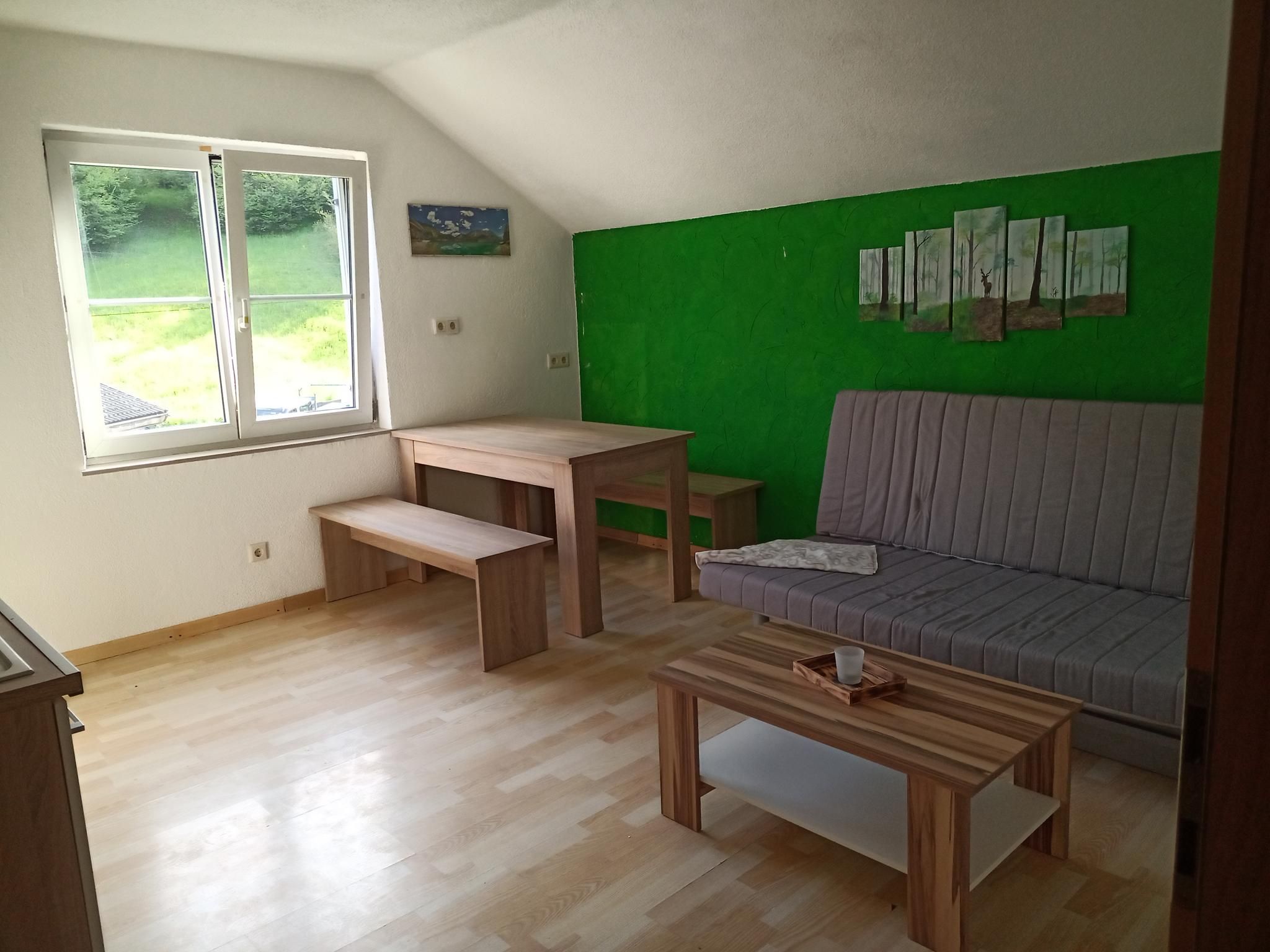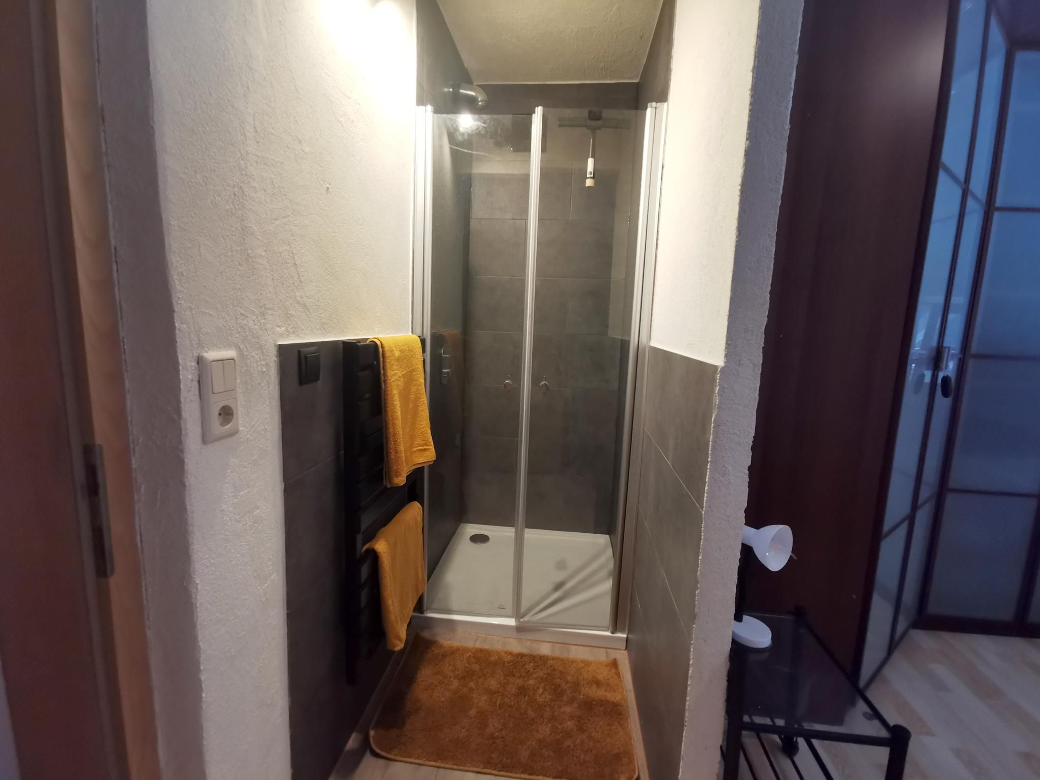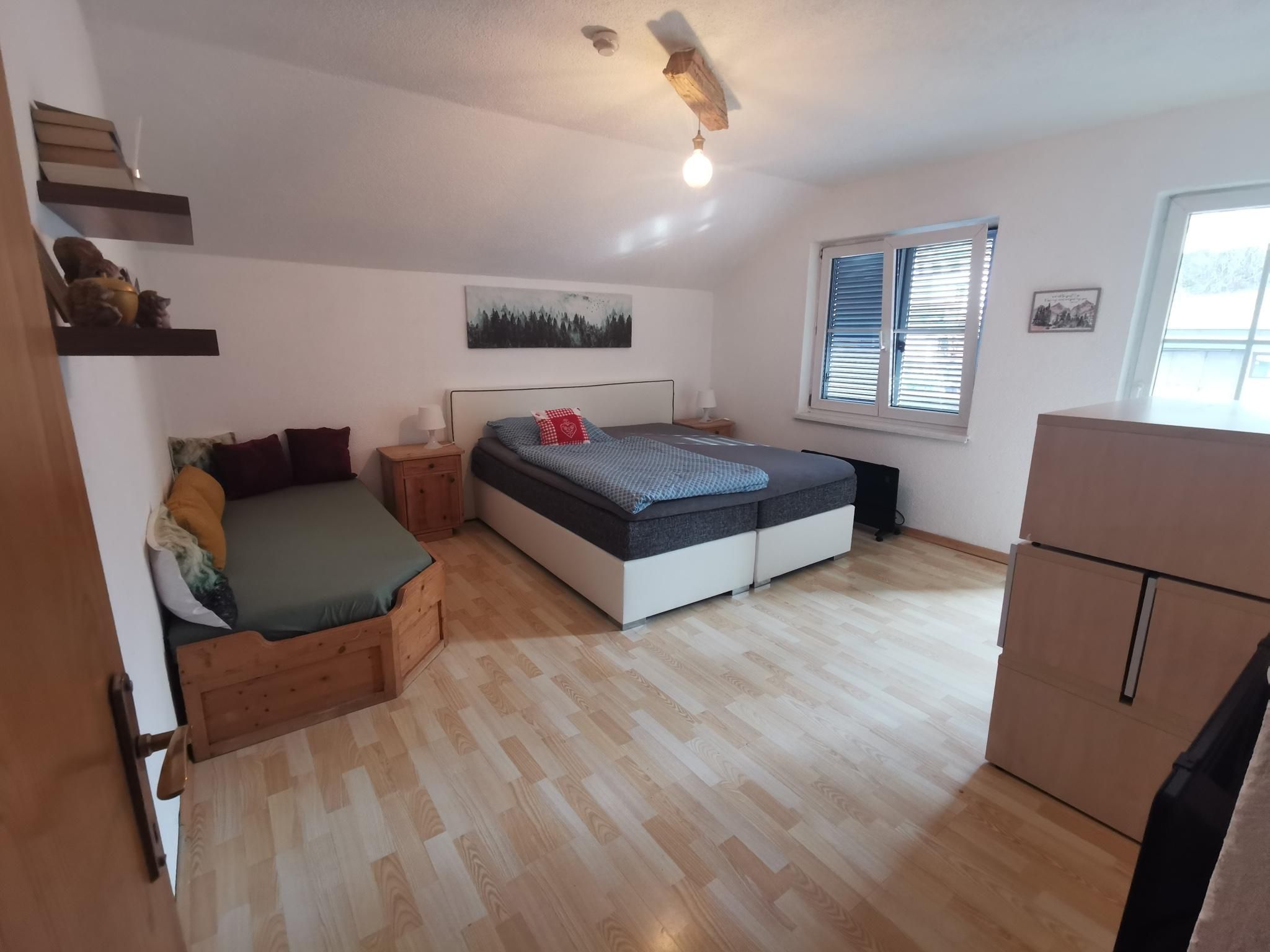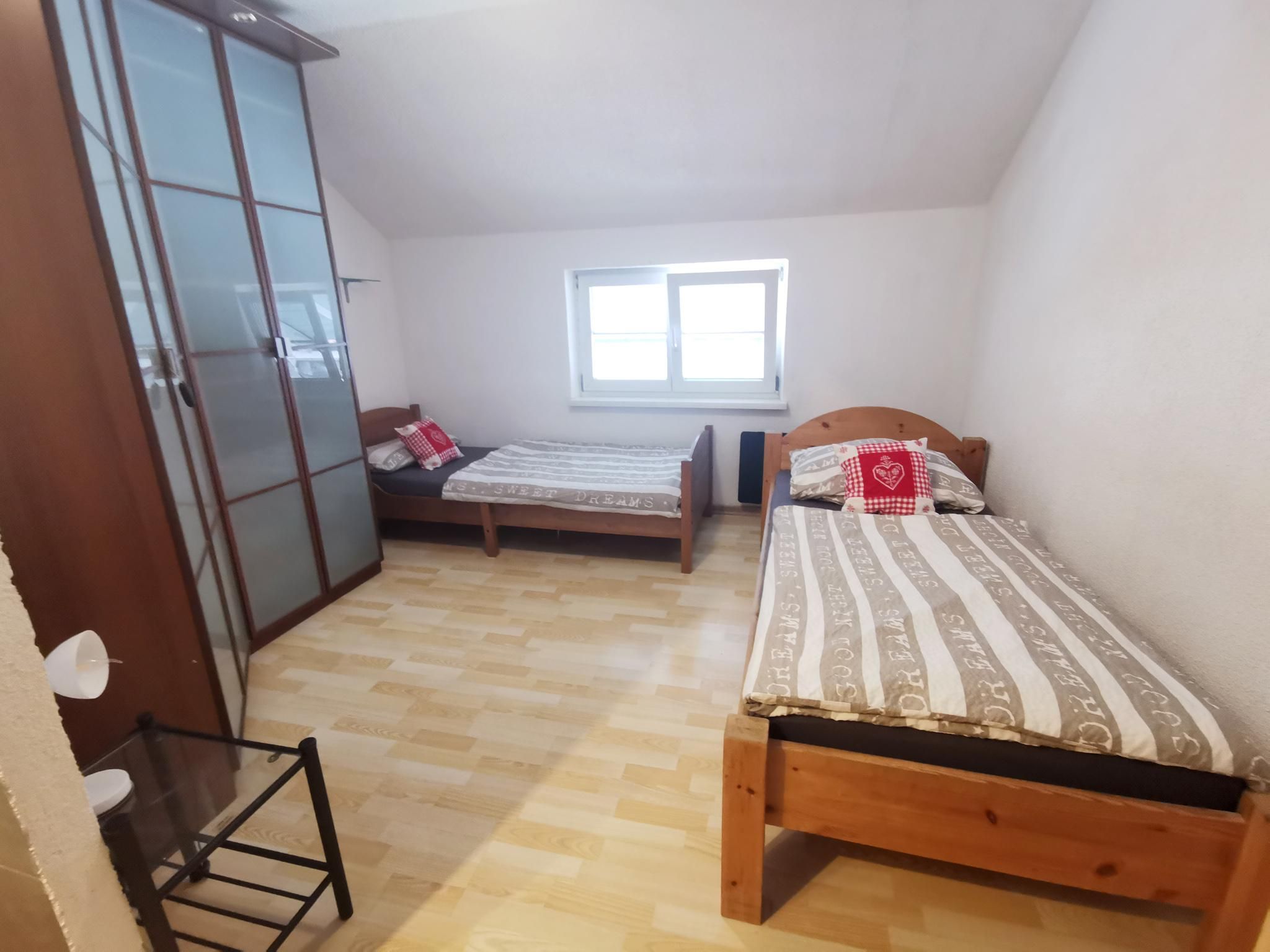 The 60 square metre flat (non-smoking household) is on the 1st floor, has a kitchen with dining area, two bedrooms (one with balcony and one with shower), a hallway and a WC. Parking is available in front of the house.