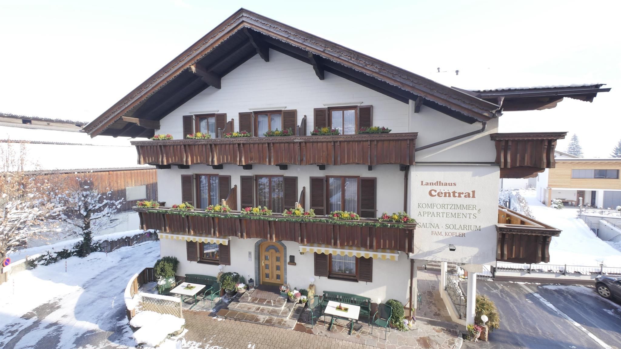 You are looking for relaxing holidays full of new experiences in the Zillertal? Then our 3-star Aktiv Hotel Pension Central mit Landhaus Central in Fügen in the Zillertal is exactly the right place for you! As its name promises, our Aktiv Hotel Pension Central with guesthouse is located in the centre of Fügen and the ideal starting point for wonderful skiing days and hikes of every level of difficulty in the skiing and hiking areas of Spieljoch und Hochfügen. Whether in one of our lovingly furnished rooms or in one of our holiday apartments together with your entire family - here with us, you will find the time to simply let your soul stray! Our rooms are equipped with shower/WC, hair dryer and satellite TV. To meet the versatile requirements of our guests, all hotel rooms can alternatively also be booked as holiday apartments. The size of our apartments extends from 35m² to 75m². They are all equipped with a bath, WC, satellite TV, hair dryer, radio and a balcony. Whether north, east, south or west exposure, you always have a wonderful view of the Zillertaler mountains from every room. We also offer our guests a small spa area with Finnish sauna, steam bath, infrared cabin and solarium. Sports enthusiasts find a comprehensive offer in the “world’s most active valley”. No matter if you are eight or eighty-eight - you will surely find a match! In summer, you can enjoy our wonderful lawn with the whole family or play table tennis with your children. Our junior manager and certified Tyrolean mountain hiking guide is happy to support you with advice and assistance. Whether you prefer traditional skiing or rather enjoy snowboard action, in the Zillertal there's nothing standing in the way of unique winter fun activities! The Spieljochbahn in Fügen is approx. 1 km away from our 3-star hotel and country house. The Hochfügen skiing area can be easily be accessed with the free ski bus. The ski bus stops directly in front of the hotel. The station, from where you can explore the rest of the Zillertal, is only 100m away. Get ready for an active and relaxing time with us in the Aktiv Hotel Pension Central mit Landhaus Central. We look forward to welcoming you! Your hosts - the Kofler family