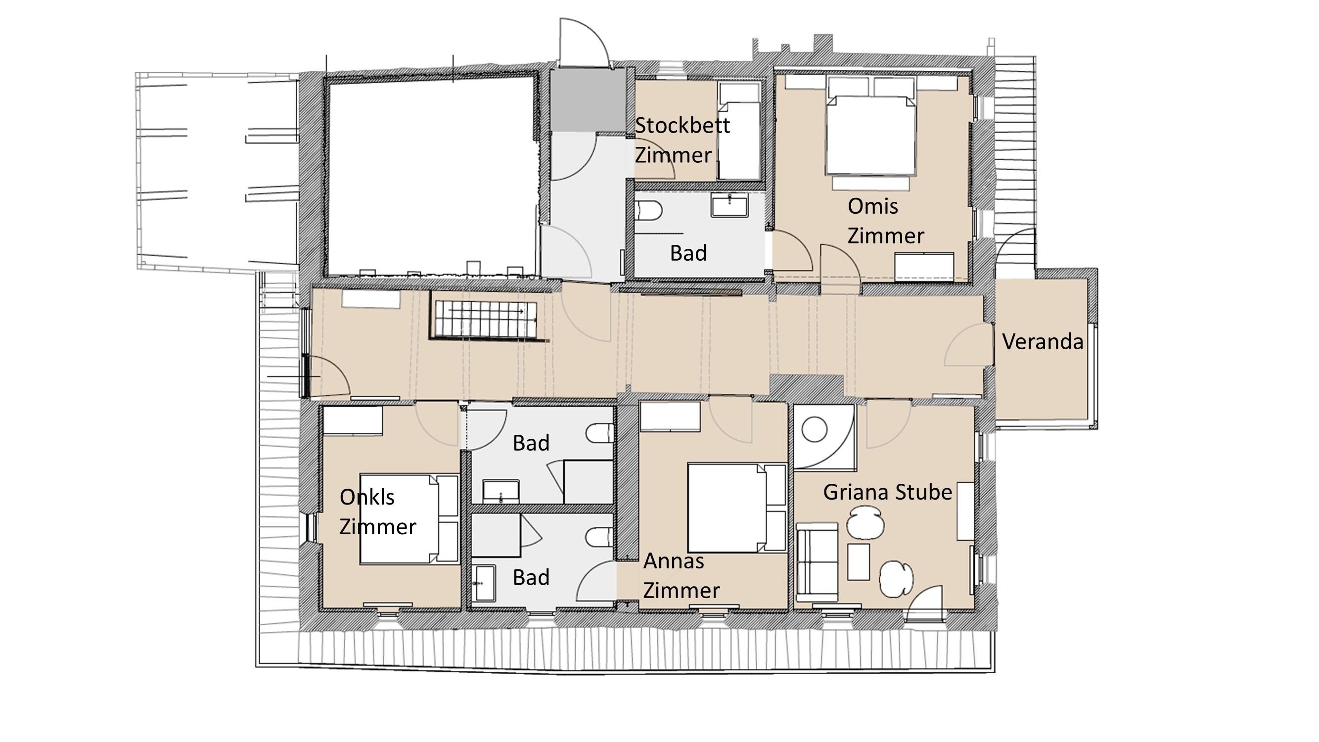 10 beds: five bedrooms, three bathrooms with old original wood-panelling. Balconies that surround the house, panorama veranda/home-office.