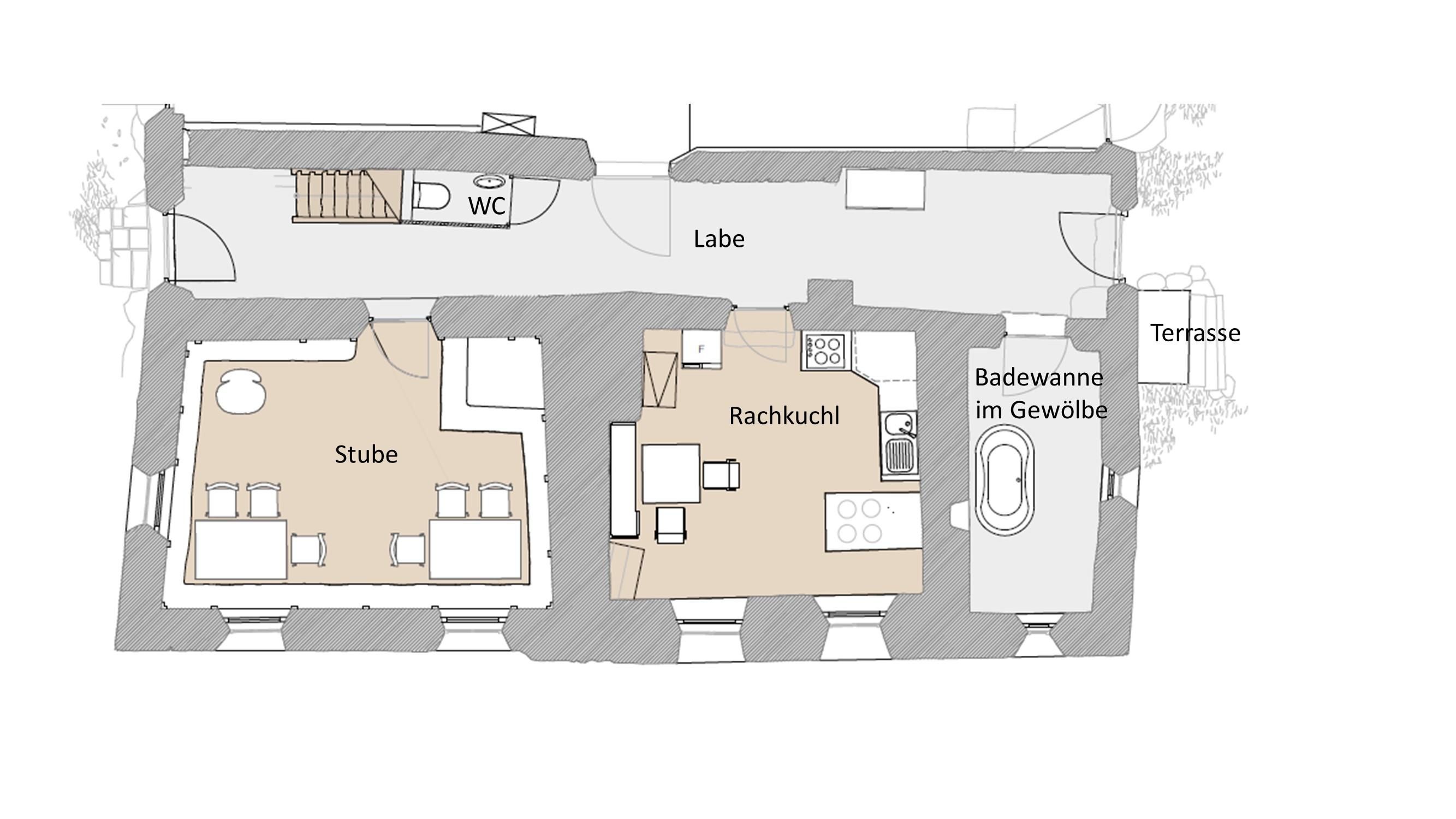 Fully equipped historic ‘Rachkuchl’, the only still existing smoky kitchen in the area. Spacious living room with original farmers’ stove, WC.