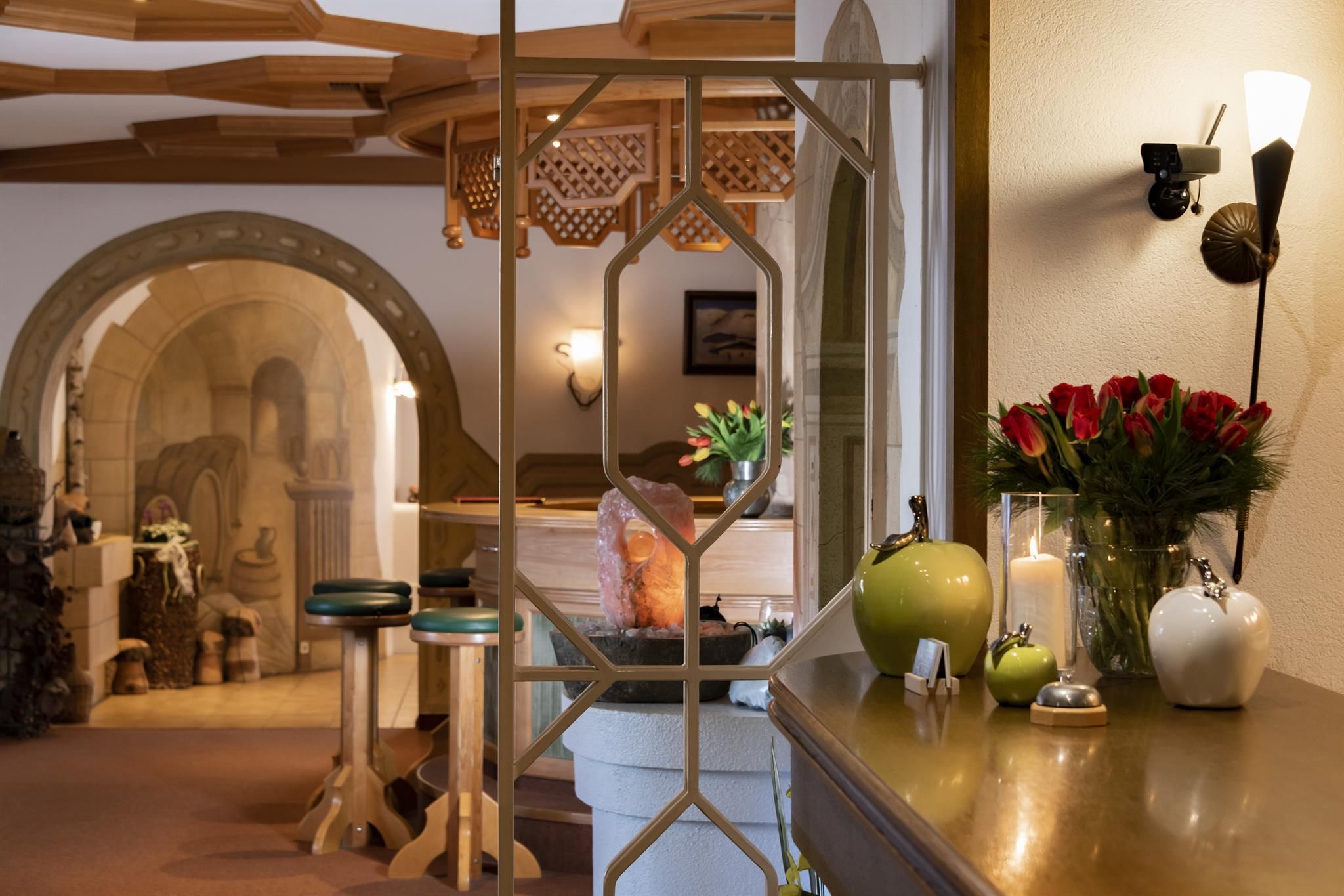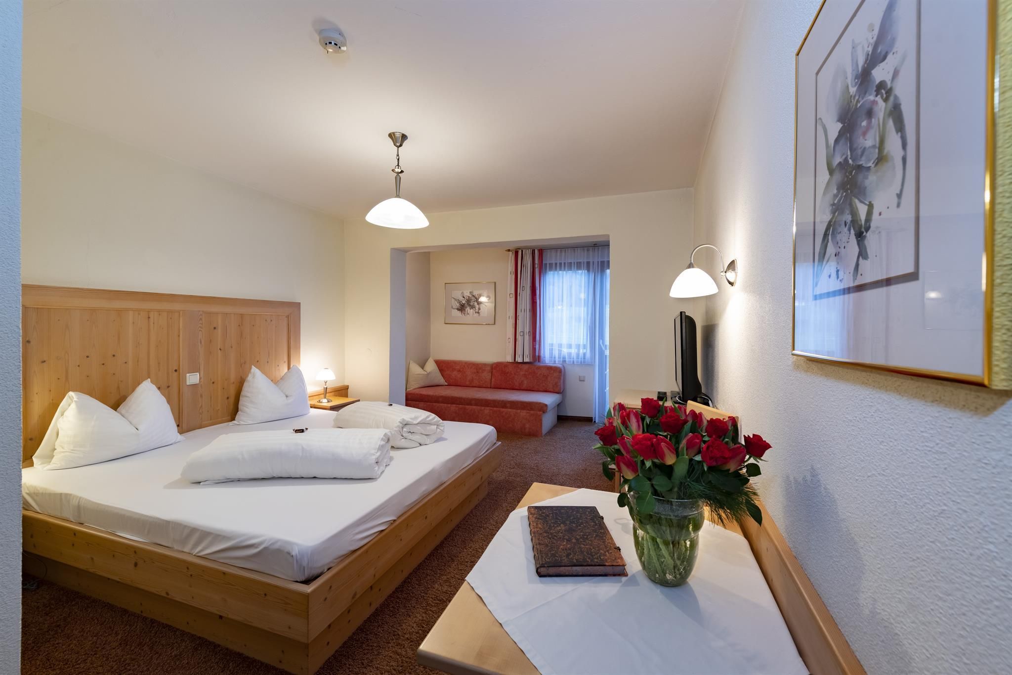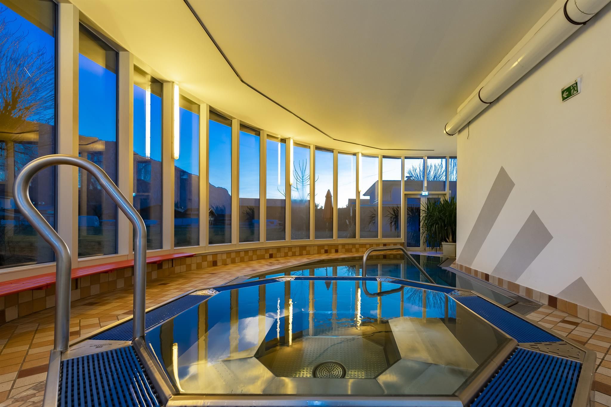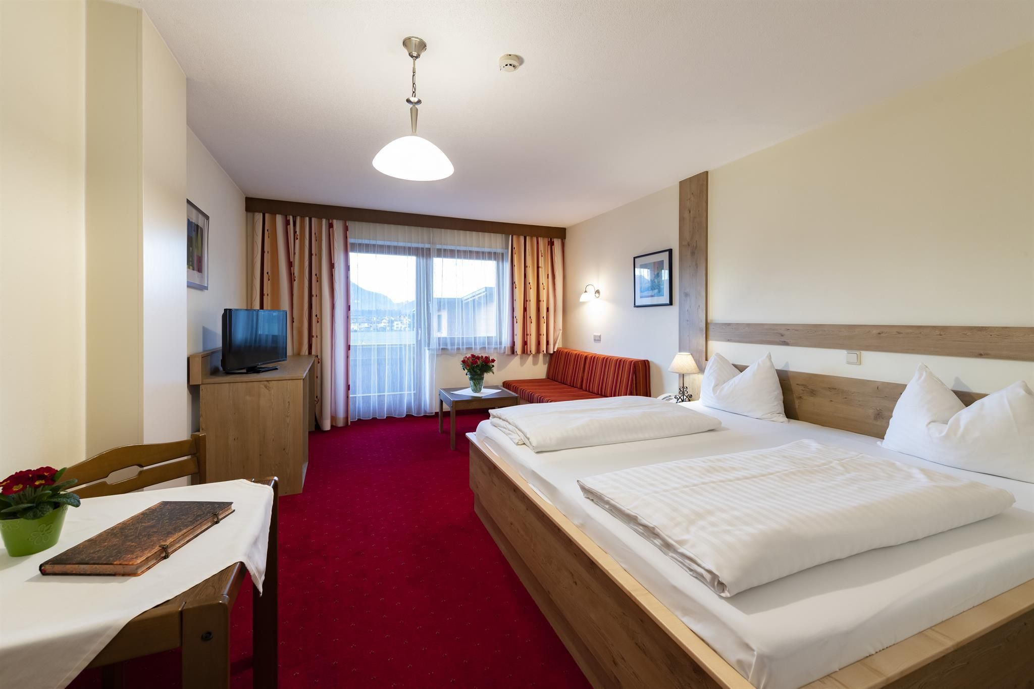 Far from traffic routes, yet only three walking minutes from the village centre, that is the location of our house. An inside tip for all those looking for relaxation and trying to get way from every day life hustle and still want to participate in the entertaining happenings of the villages any time. In our house you will meet old acquaintances year after year due to the informal atmosphere despite the 100 guest beds. Rooms with every comfort, stylish day rooms, bar and a terrace with view on the impressive mountain chain „Wilder Kaiser“, which is also the reason for the name of our house, give you a felling of well-being and vacation. Our recreation facility offers sauna, herb grotto, solarium, freshwater whirl pool and of course our panorama indoor pool with high whirl pool, massage nozzles, current, floor bubble strip and a glass front of 20 metres. Furnishing standard room: shower, WC, phone, radio, satellite TV. Furnishing „Kaiser“ room: more spacious, shower, separate WC, fridge. Furnishing suite: separate bed room and living room