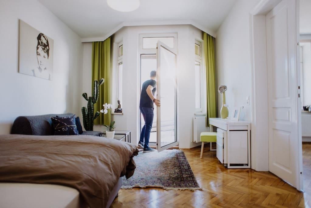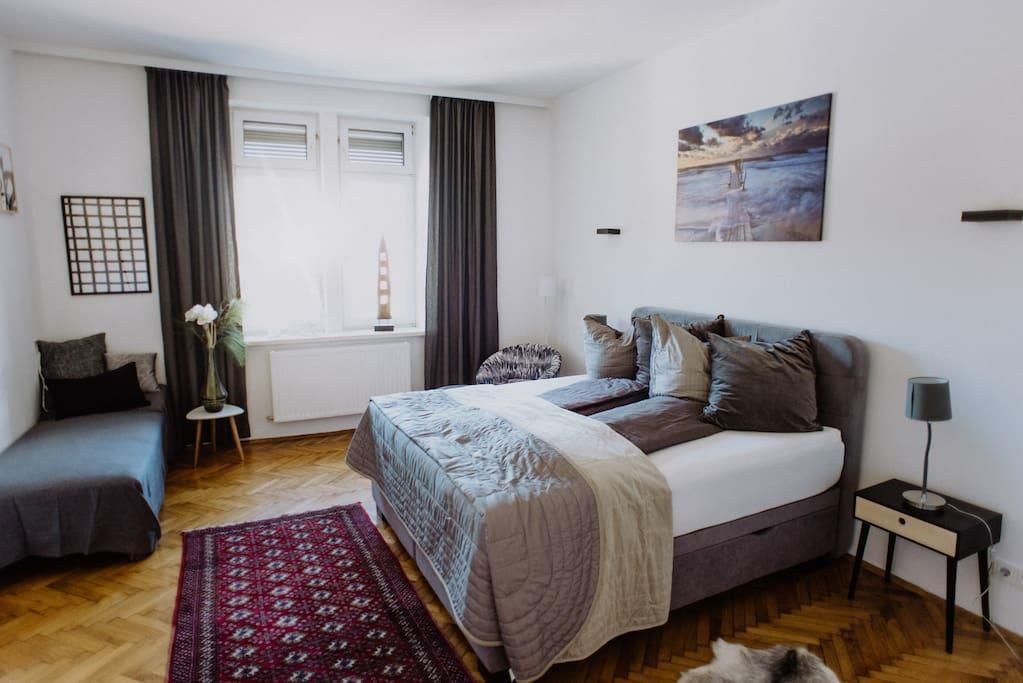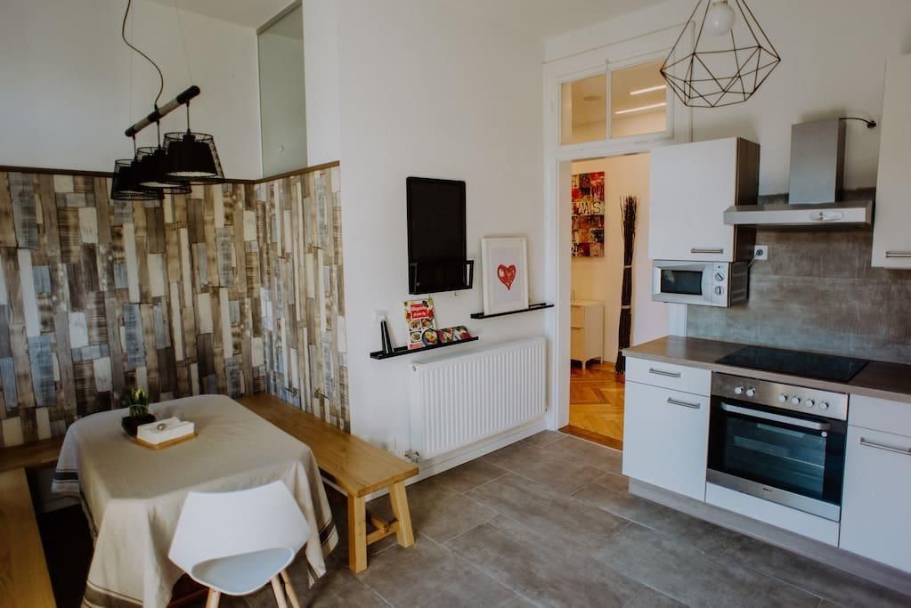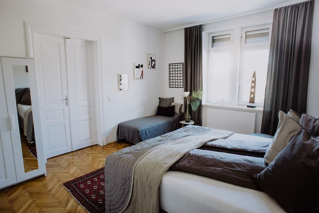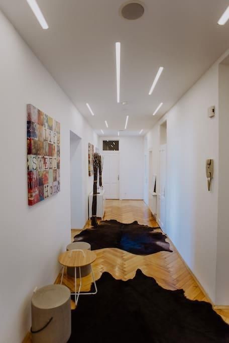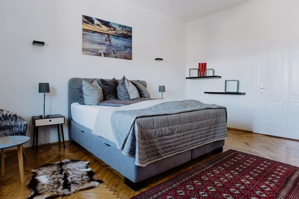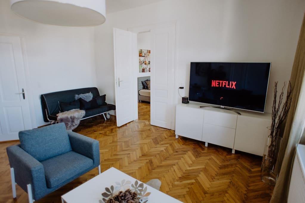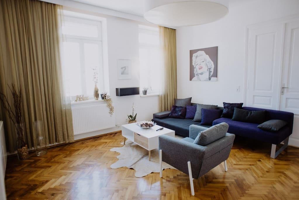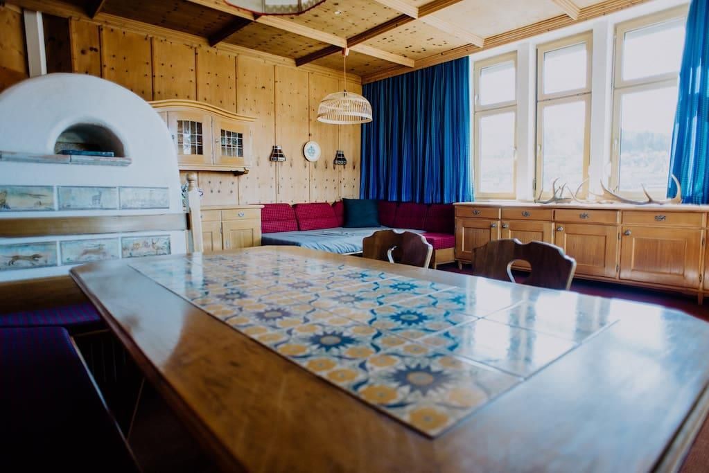 Our charming 155 m² apartment is located near the centre of Innsbruck. The apartment is 100 years old and features beautiful original wood floors, which are still in impeccable condition, complemented by a newly renovated (2018) kitchen and bathroom, as well as state-of-the-art sound and light systems. One of the four bedrooms is in the style of a traditional Tyrolean dining room with a stone oven and oak walls.