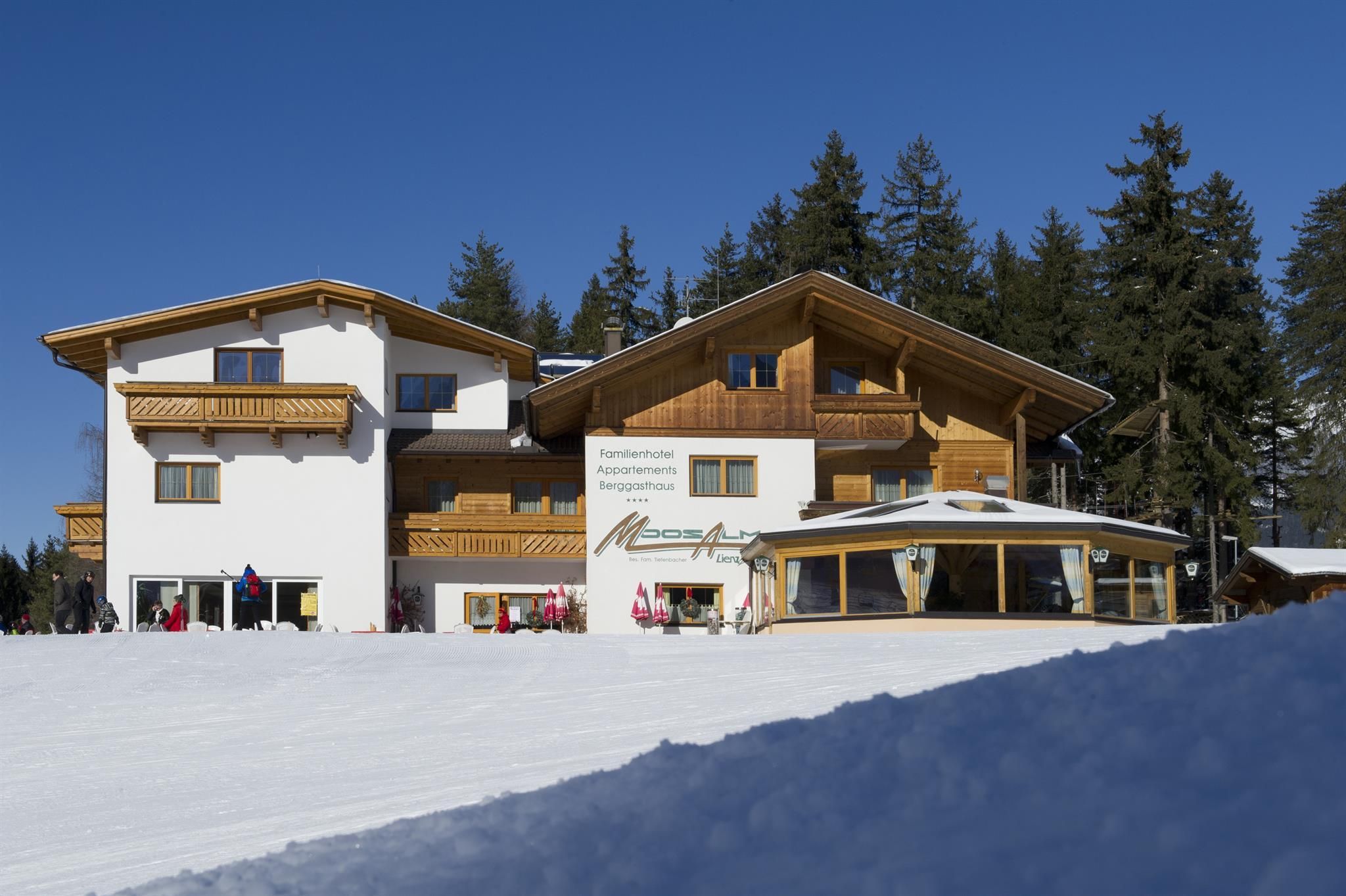 Located in the Hochstein skiing and hiking paradise, 2,5 km above Lienz. Practice lift, floodlight toboggan run, curling rink beside the hotel.