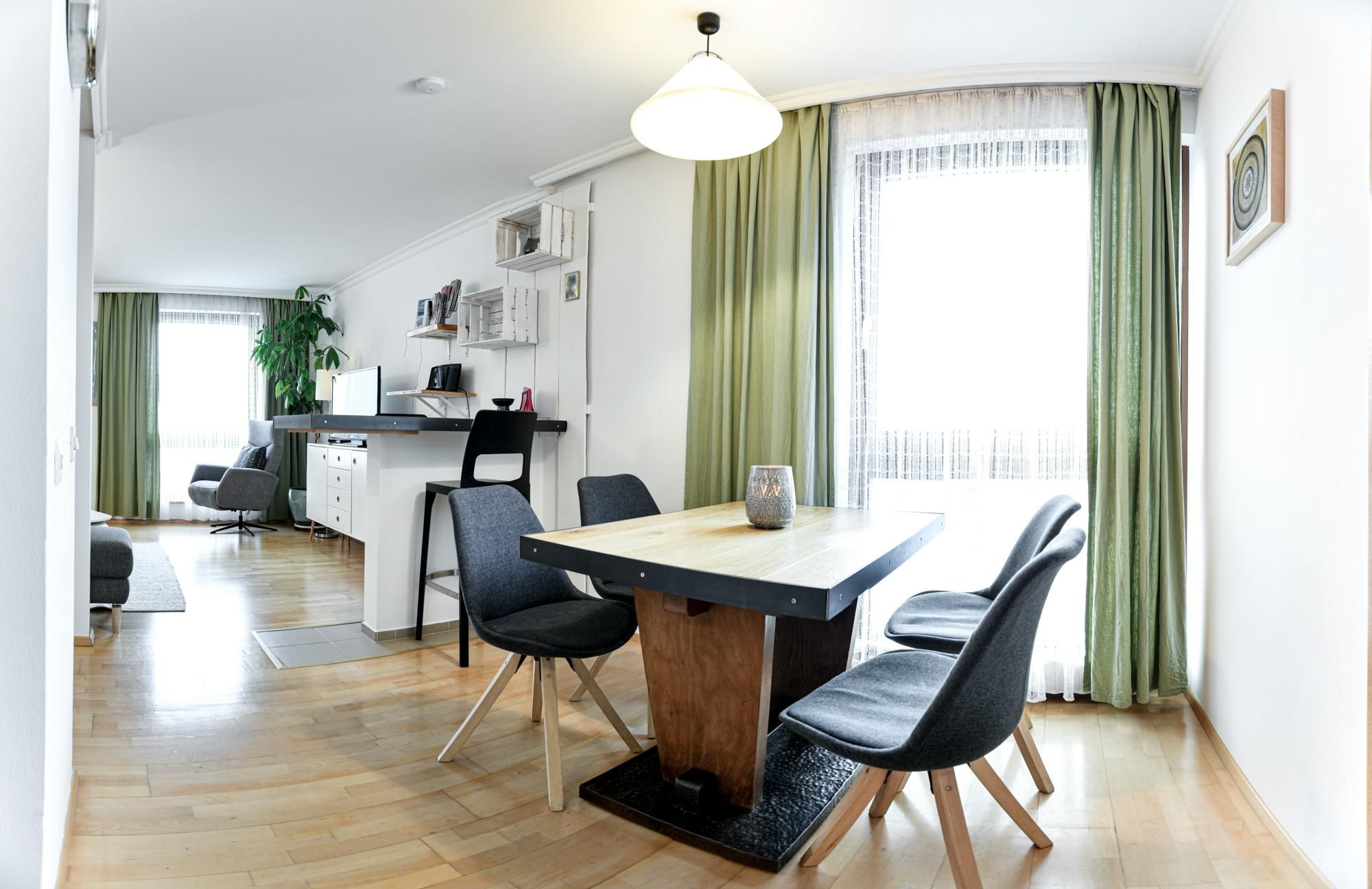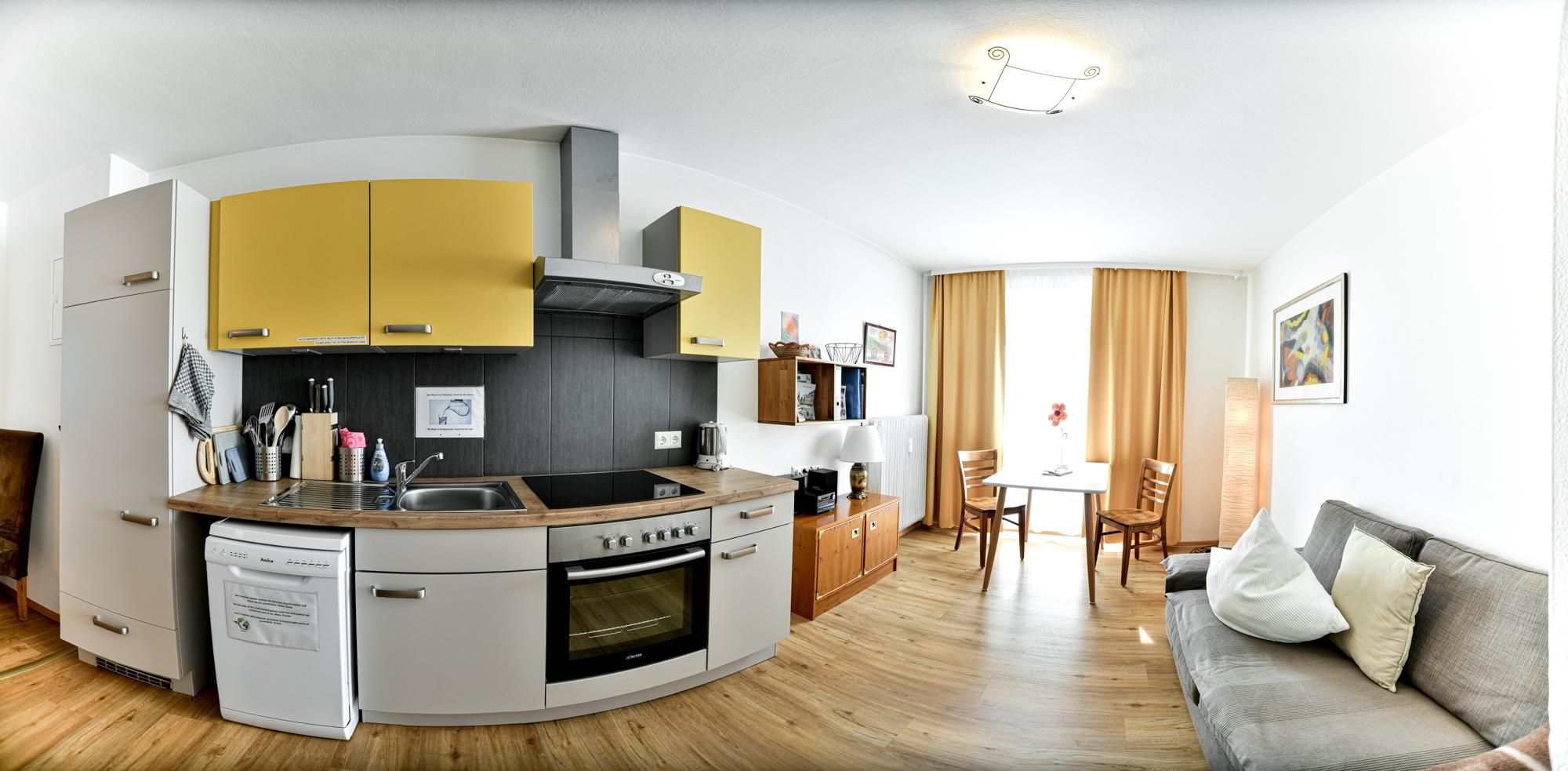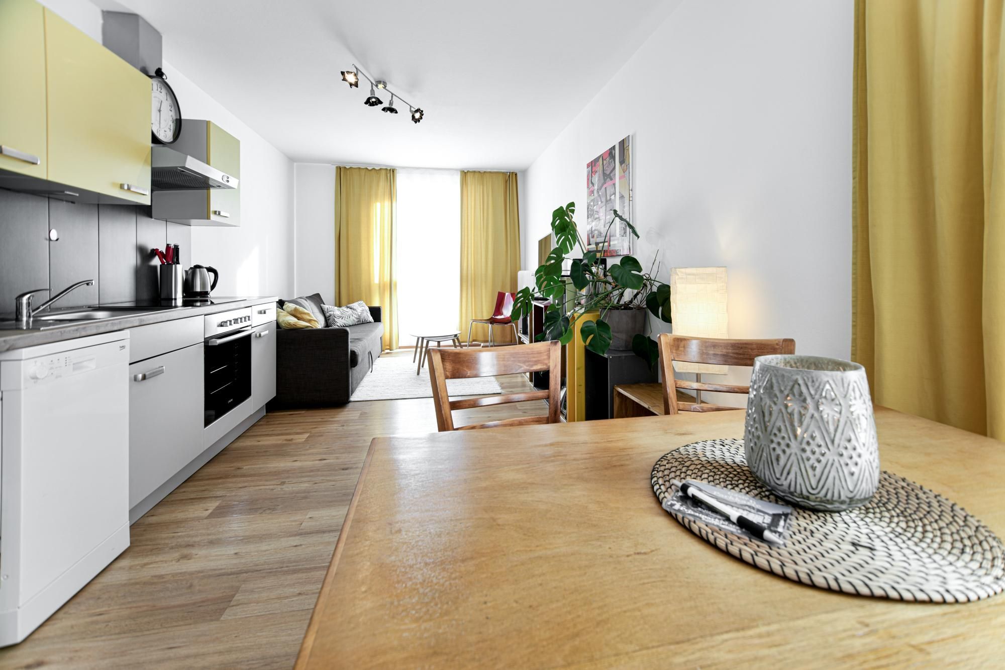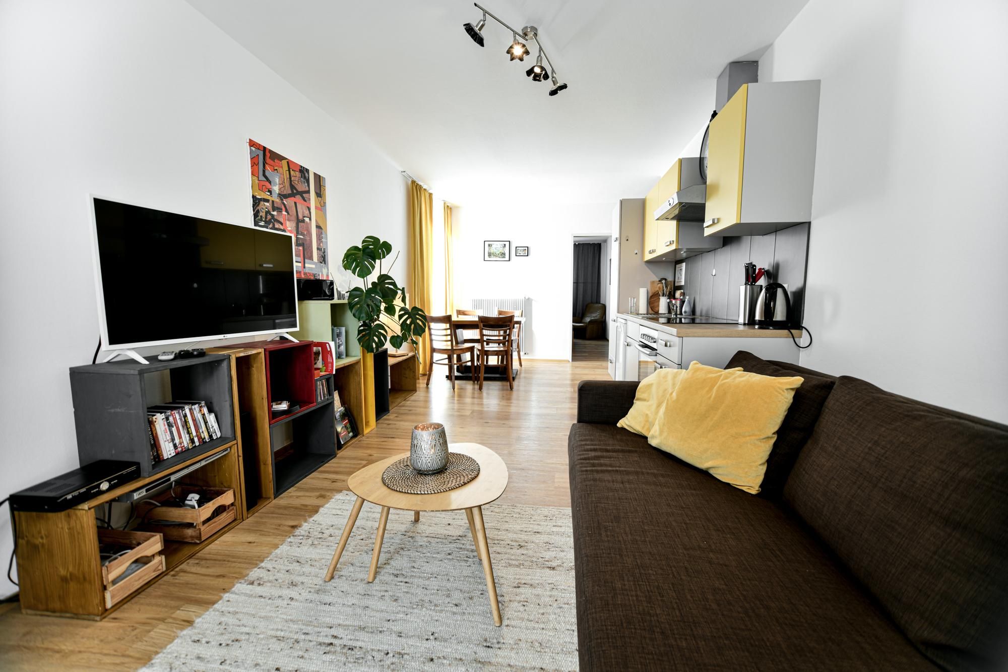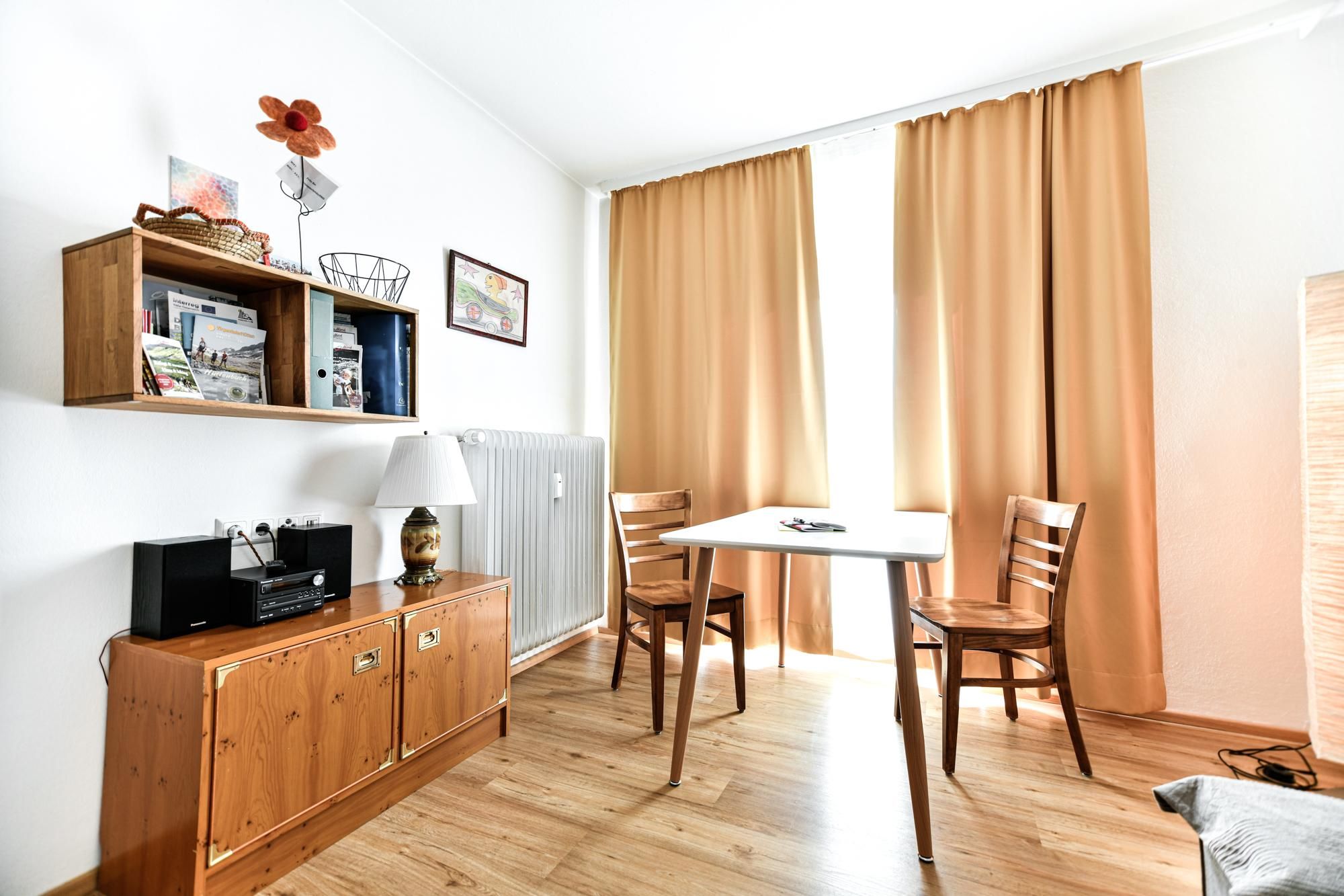 Bright, cosy two-room flats, with a small kitchen (cooker with oven), bathroom, dining area, living room with pull-out couch (TV and WIFI) and a small fine balcony with view to the Lienz Dolomites. Parking spaces, a laundry room, and storage space for bicycles or ski equipment are available. Directly in the centre of the sunny town of Lienz near the train station. With cafés, bars, restaurants and plenty of shopping facilities. Smoking is only allowed on the balcony. Children are welcome, and pets are allowed on request.