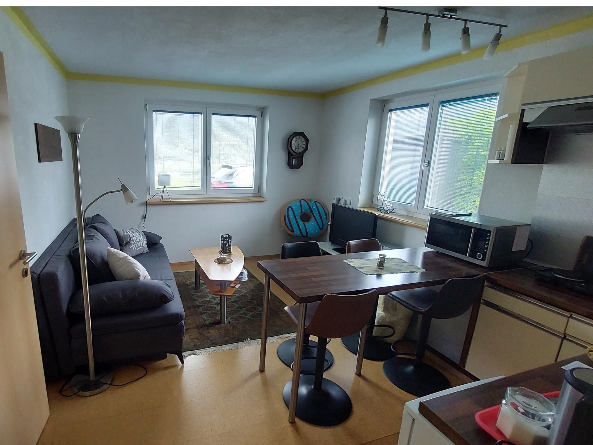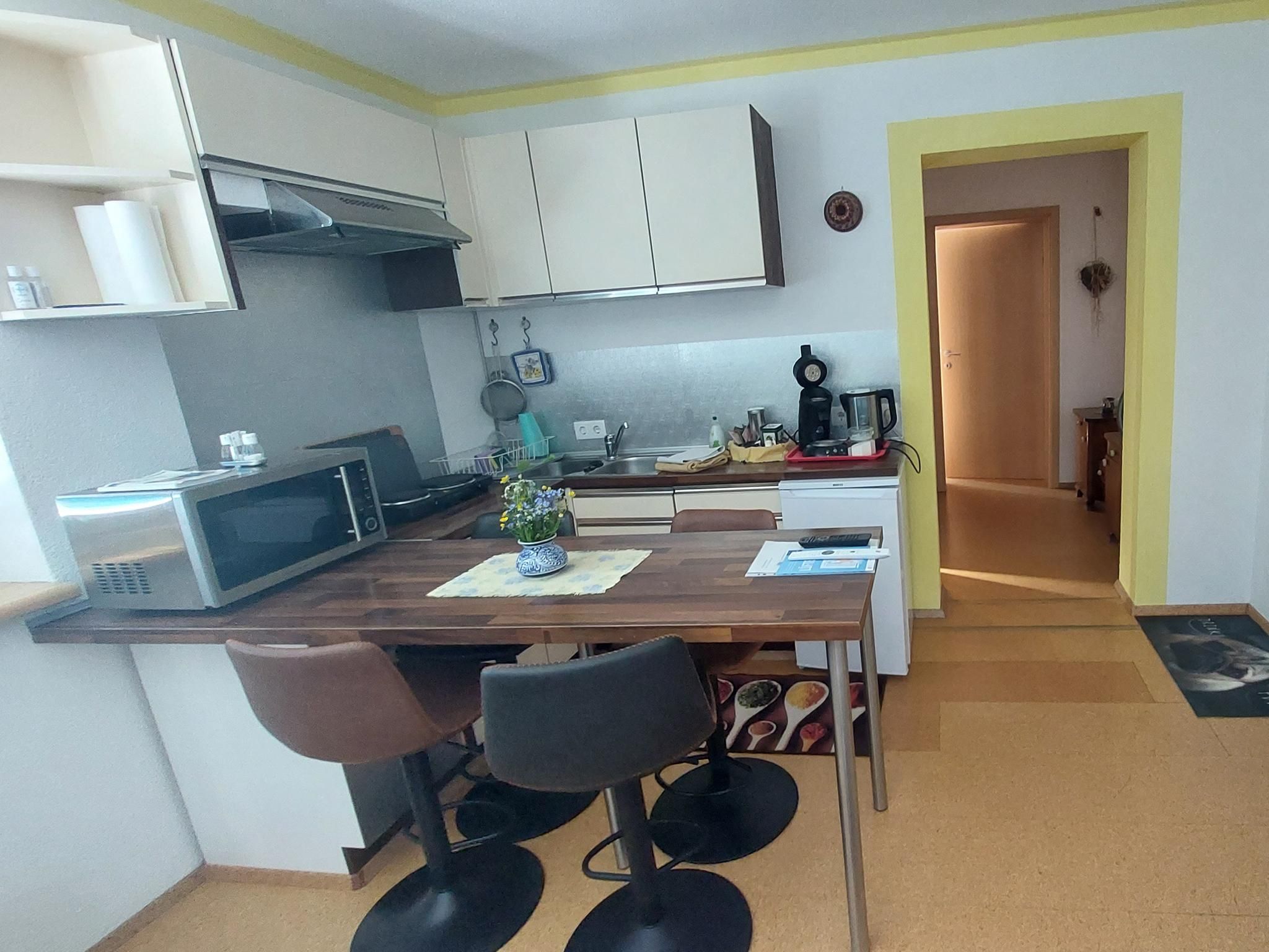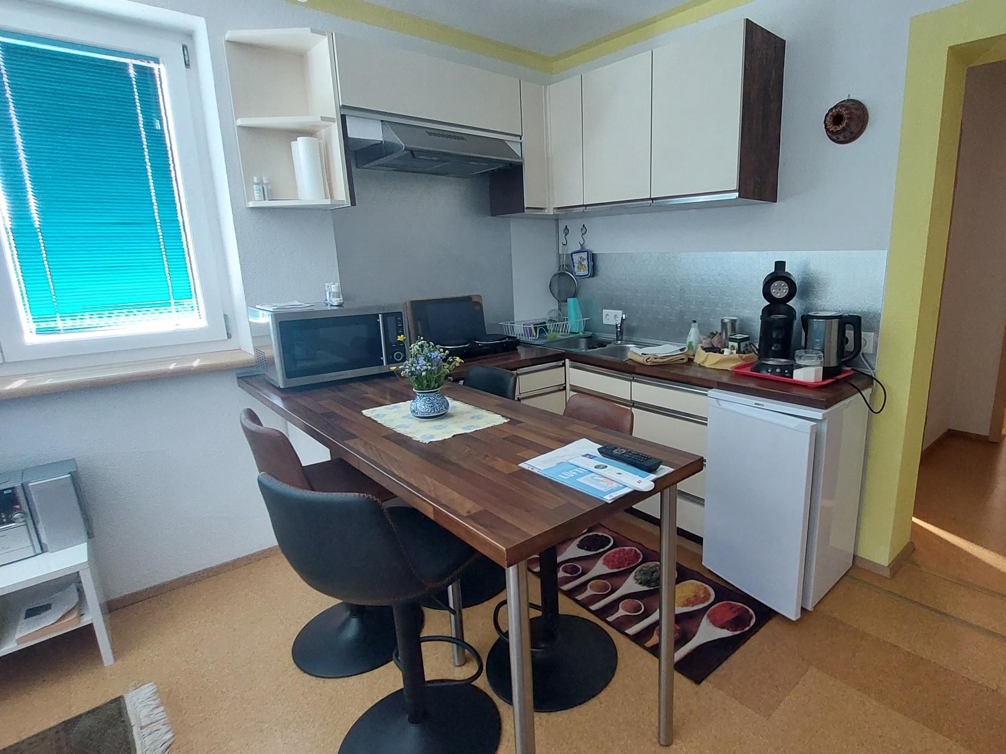 This non-smoking apartment can accommodate up to four people and consists of a bedroom with a double bed and a living/dining area with a double sofa bed. On warm summer days, children are welcome to use the trampoline, basketball net and football goal in the garden area near the apartment. Two free car parking spaces are available in front of the building.