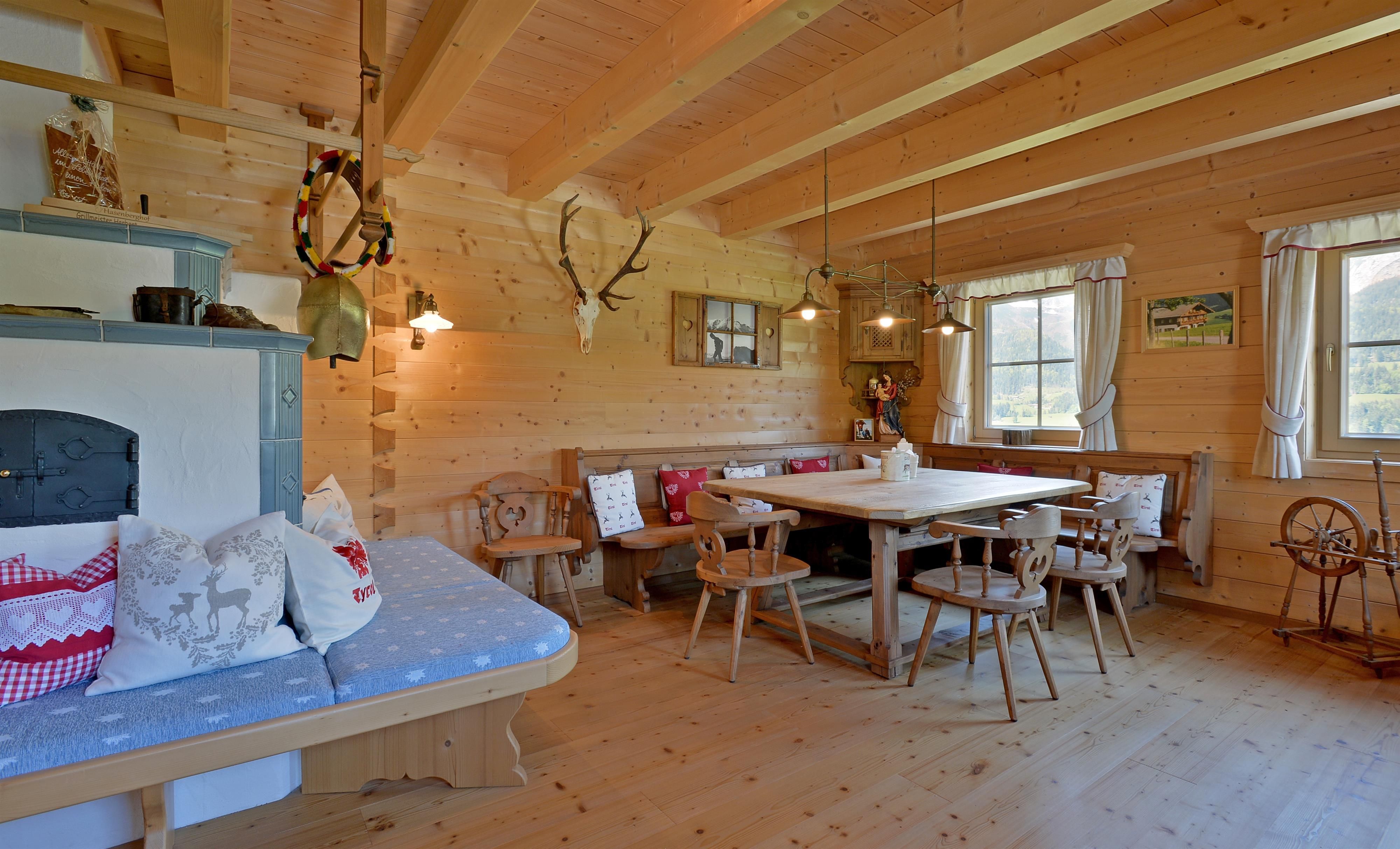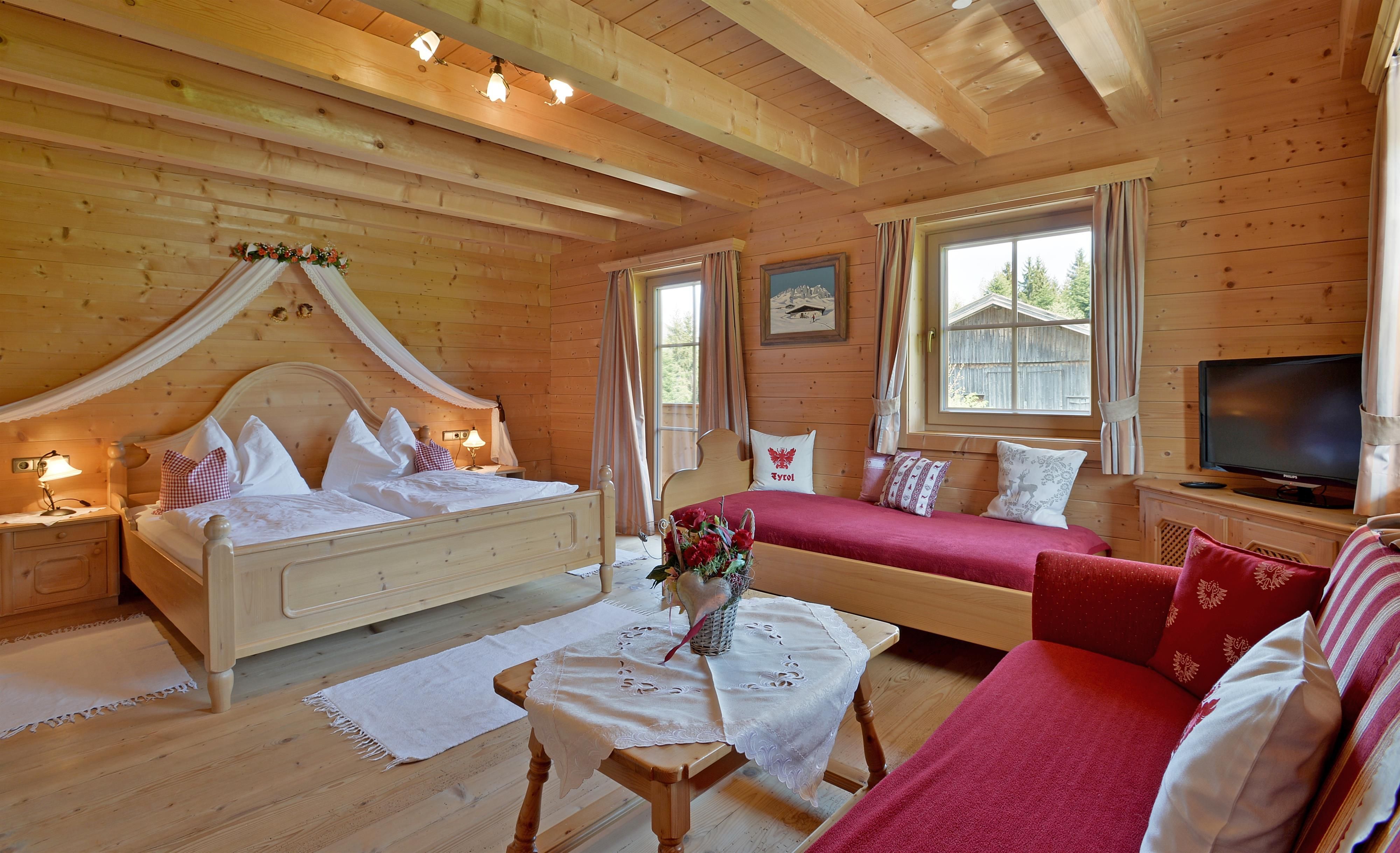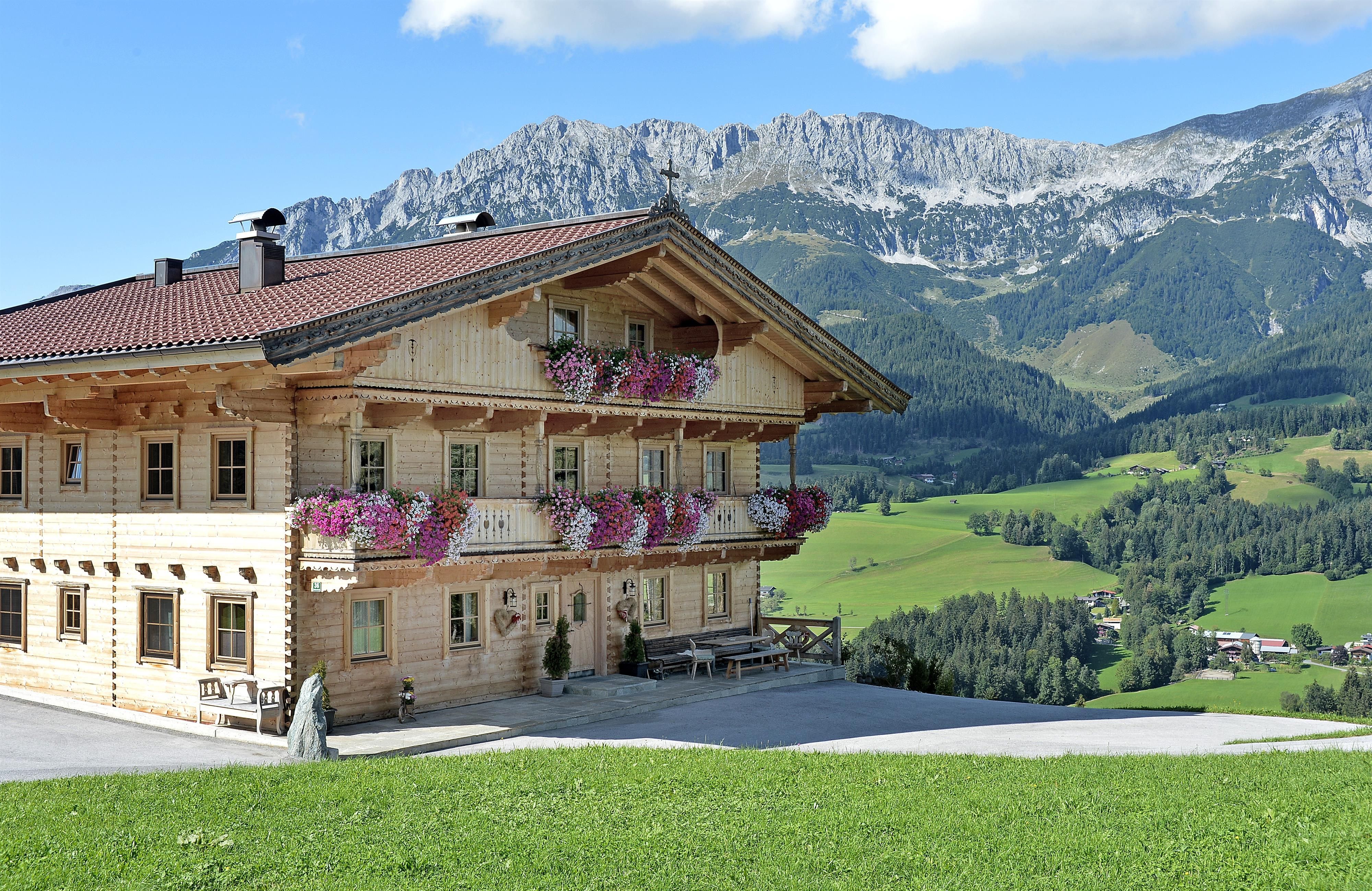 Our farmhouse is built like a blockhouse and in original tyrolean style and is situated on a hill about 2,5 km from the village Center. Very quiet and sunny position surrounded by the nature and with free view to the mountains like Wilder Kaiser and Hartkaiser. We offer a big apartment with 3 sleeping rooms and one double room, both in high quality wooden furniture in tyrolean country style. We are looking forward to welcome you in our farm house in Ellmau.