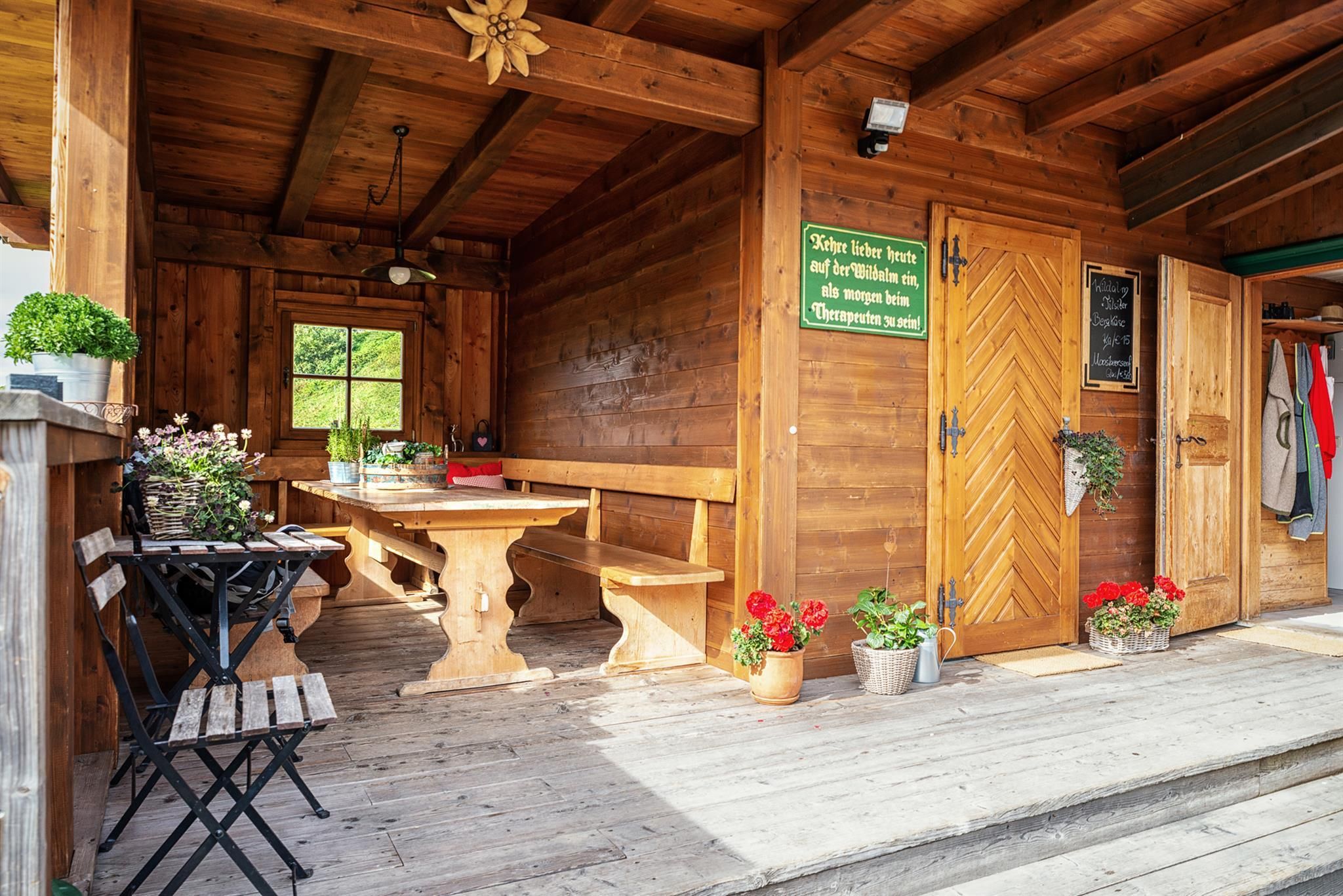 The wood fired rustic sitting room inside sits approximately 30 people. But on sunny days you’d much prefer the lovely terrace anyways, which gets warmed by the sun from dawn till dusk. Here you can enjoy cheese from the neighbouring alpine dairy and locally brewed beer.