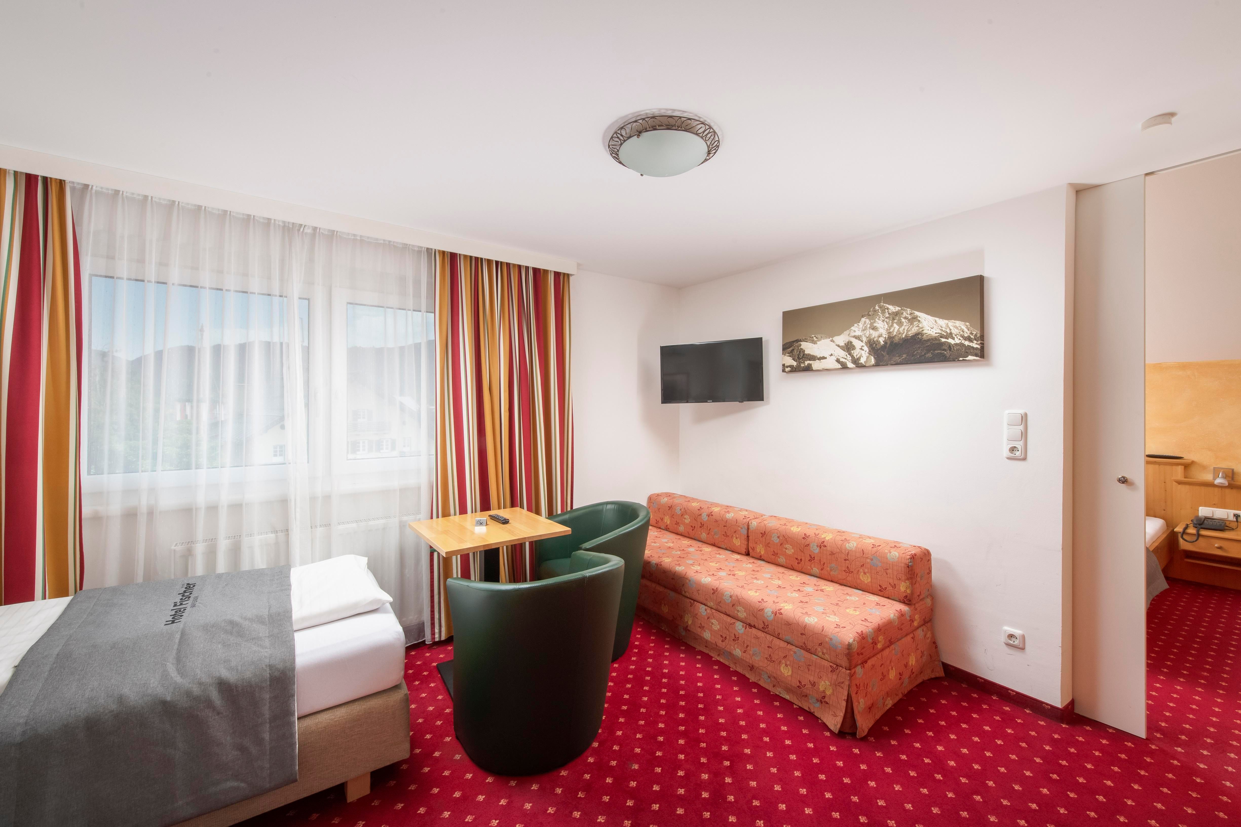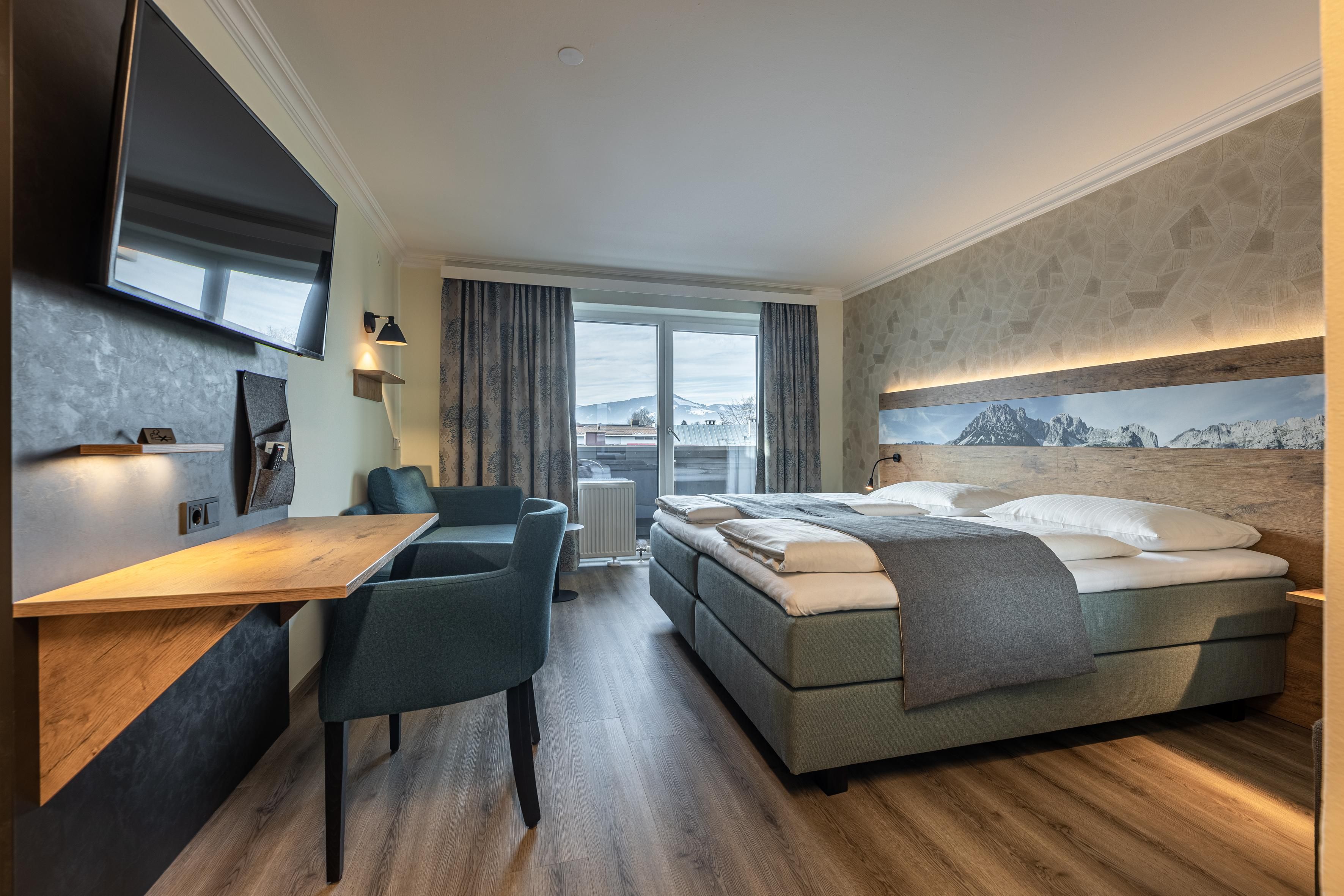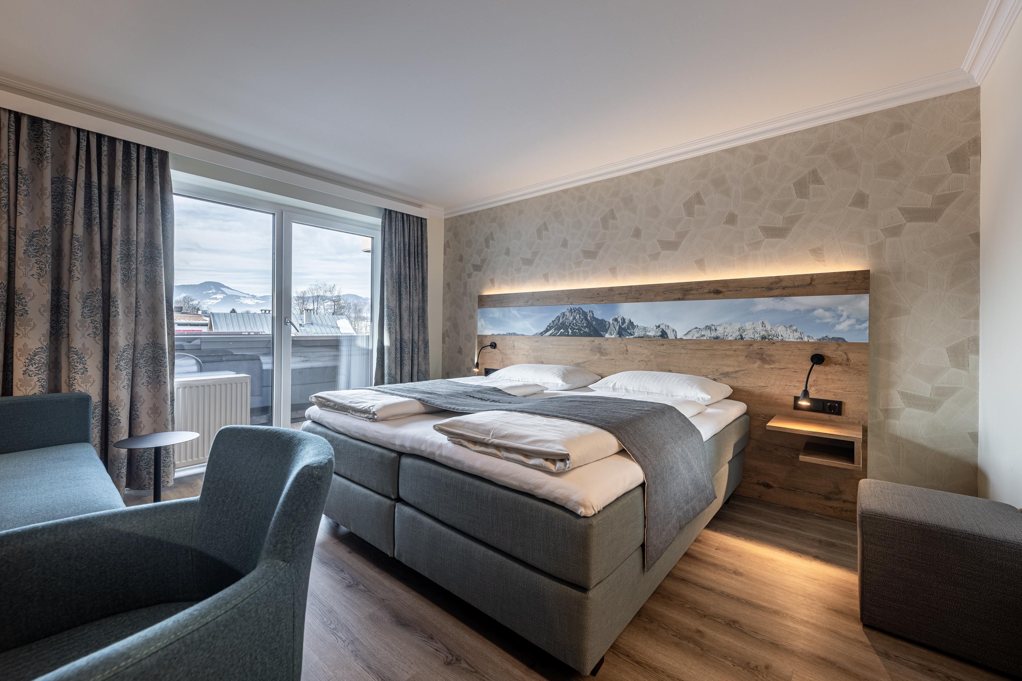Our 3-star Superior family owned hotel is in the heart of St. Johann in Tirol in the midst of the pedestrian precinct. The approach road to the hotel parking lot is possible at any. The mountain railways as well as the moving ways are 5 min. far away from the hotel. Our house has 36 rooms all equipped with bath and/or shower, WC, hair dryer, cable Tv, telephone, Safe, WiFi and balcony. All rooms are attainable with the elevator. In our ground floor we have our cosy Lobby with open fire place, WiFi in the whole Hotel, a typical Tyrolean Stüberl and the Hotelbar."Michi's" (Sky Sportsbar), whatever are a popular meeting place with the native ones. In our basement we have our Sauna and herb steam bath, Infra red cabin and 3 times a week are massages available. On the basement there is also our 70m² children's game room. We offer free of charge an animation program to summers such as winters.