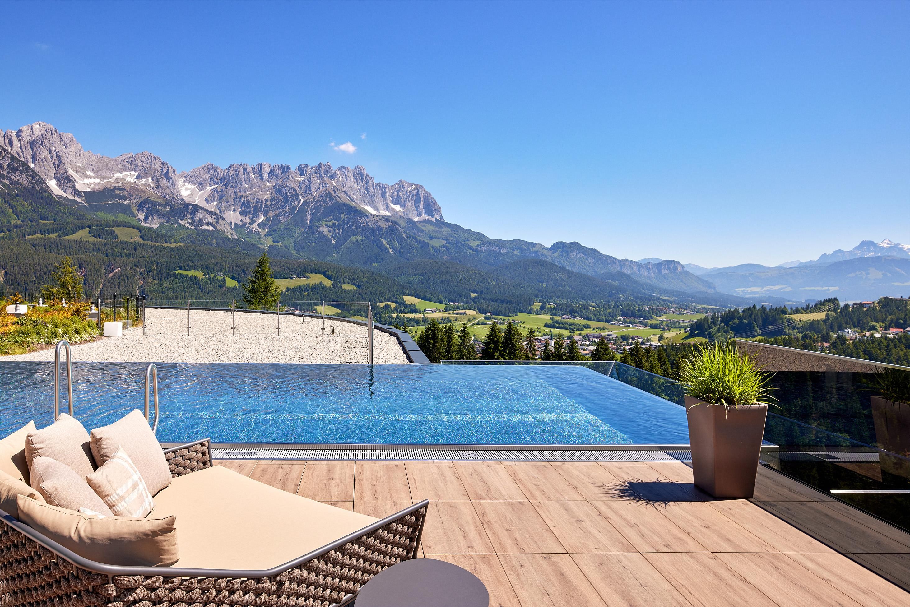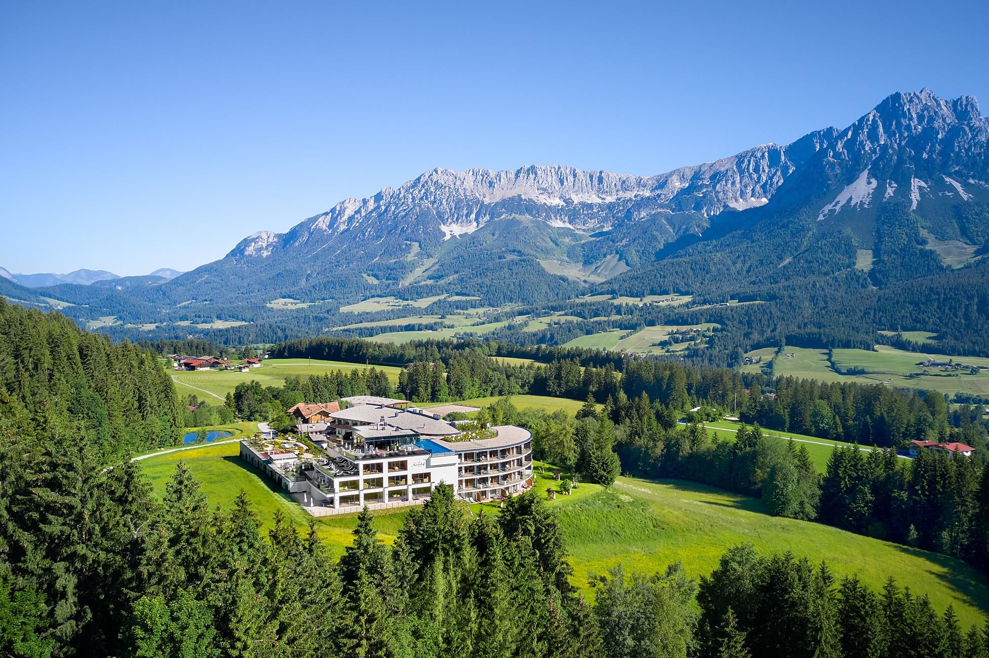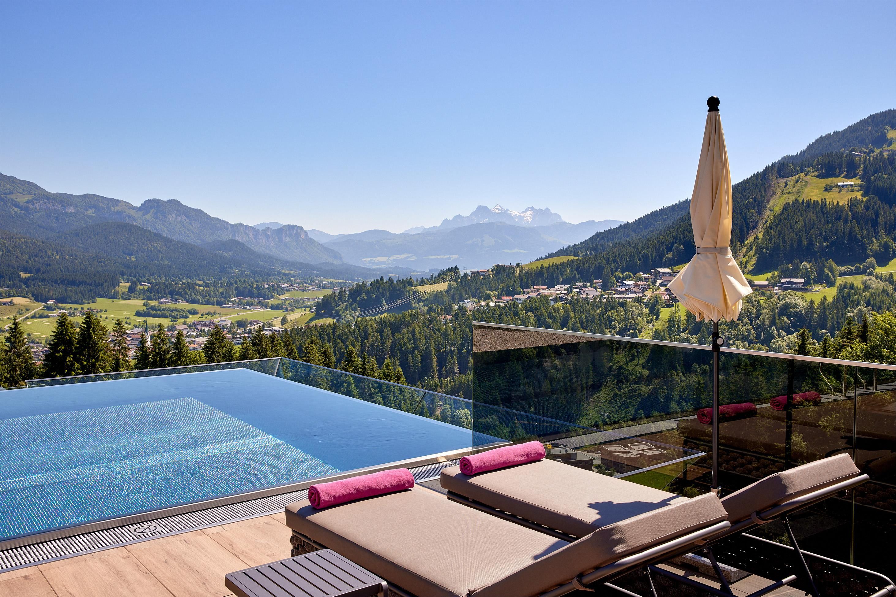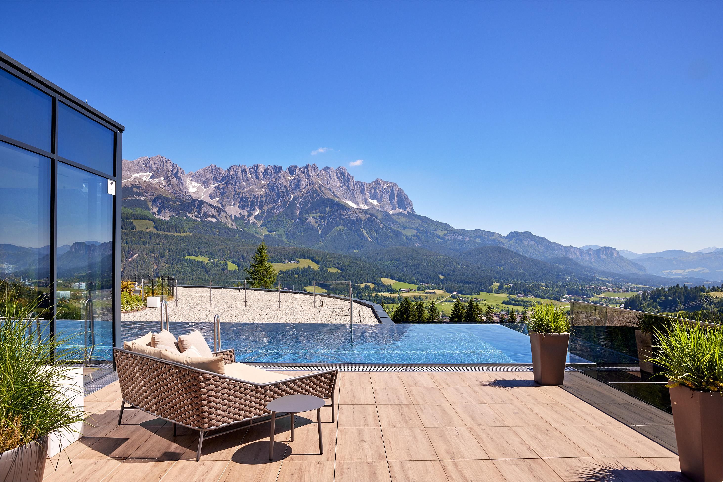 Enjoy unique alpine wellness flair in "Austrias Hotel of the Year 2022" our family-run luxury hotel (52 rooms/suites) situated in an extremely privileged location on a sunny plateau high above Ellmau with breathtaking views to the Wilder Kaiser. In winter directly next to the Hartkaiser valley ski run and in summer the perfect starting point for extensive hikes.