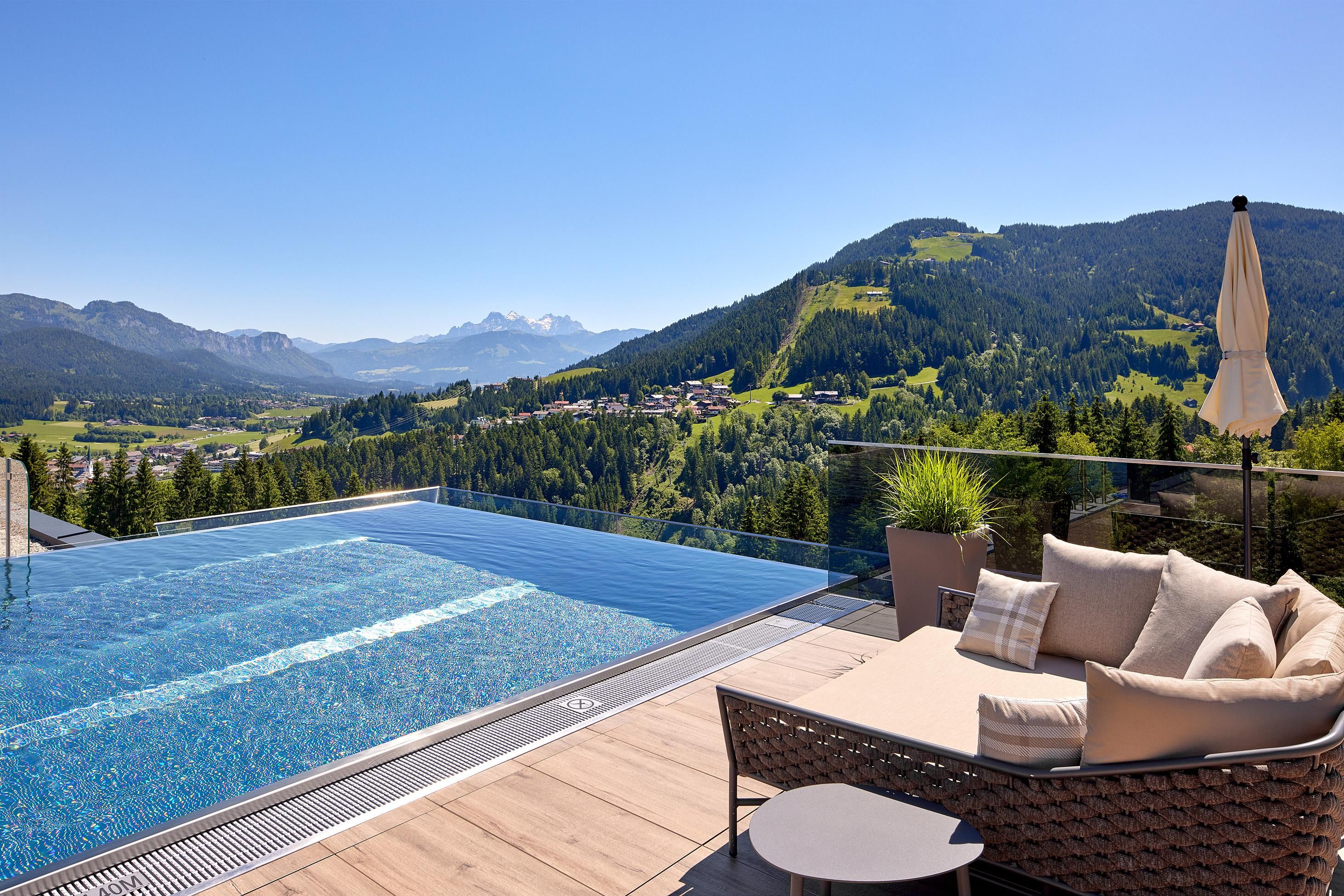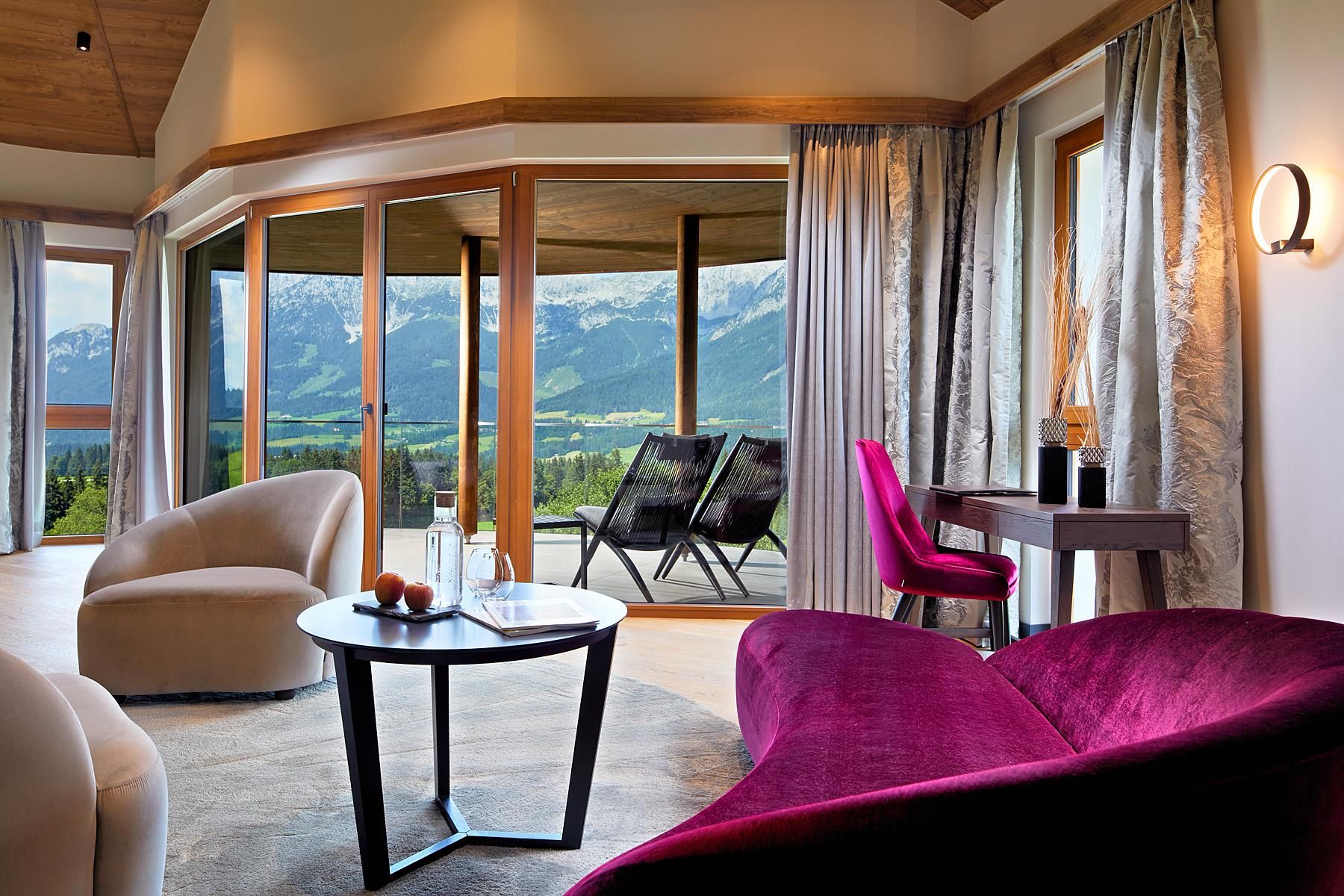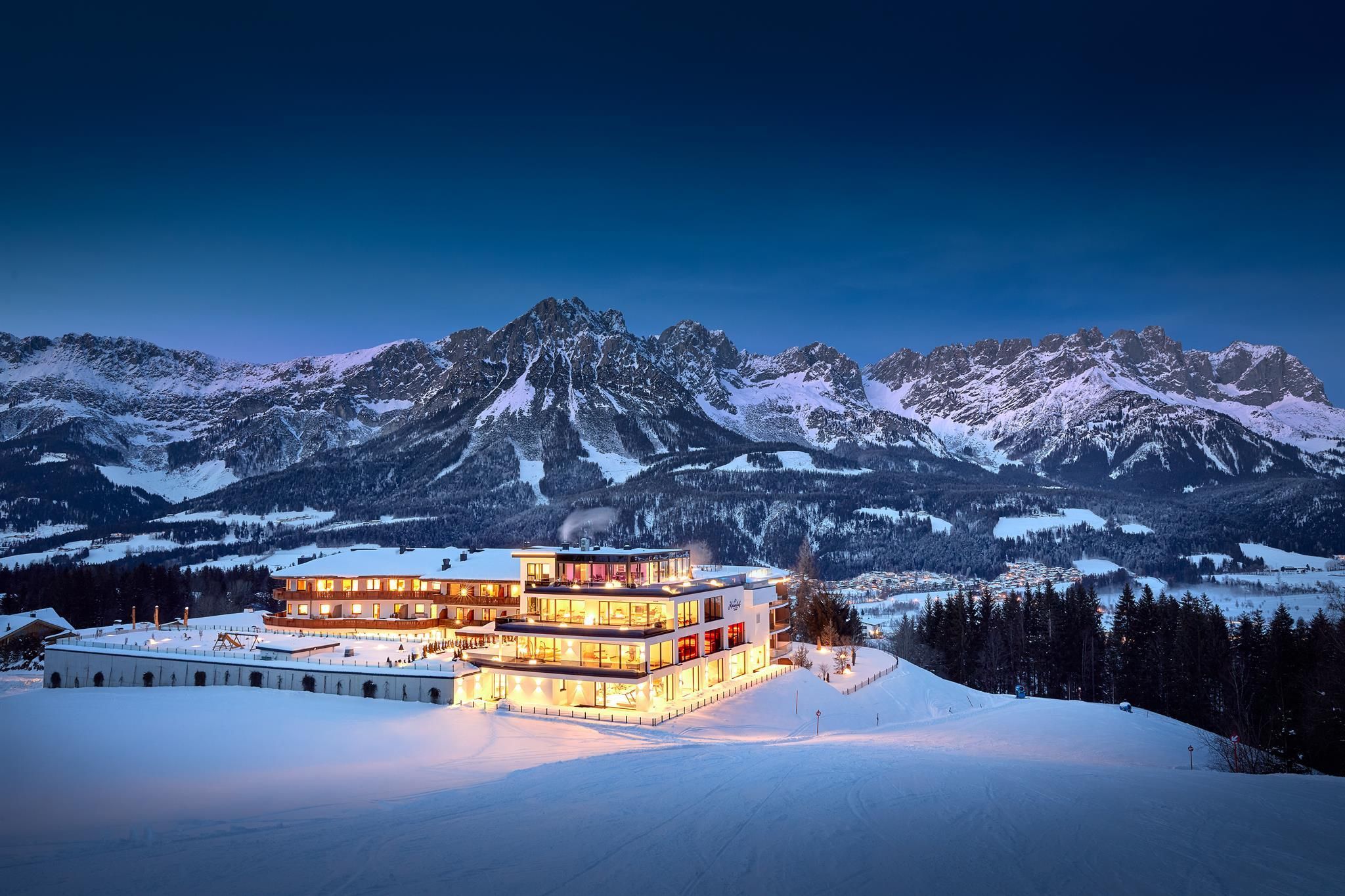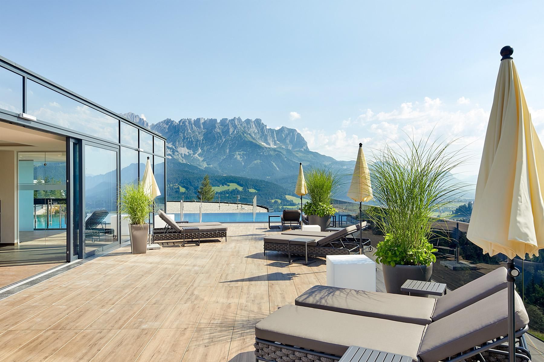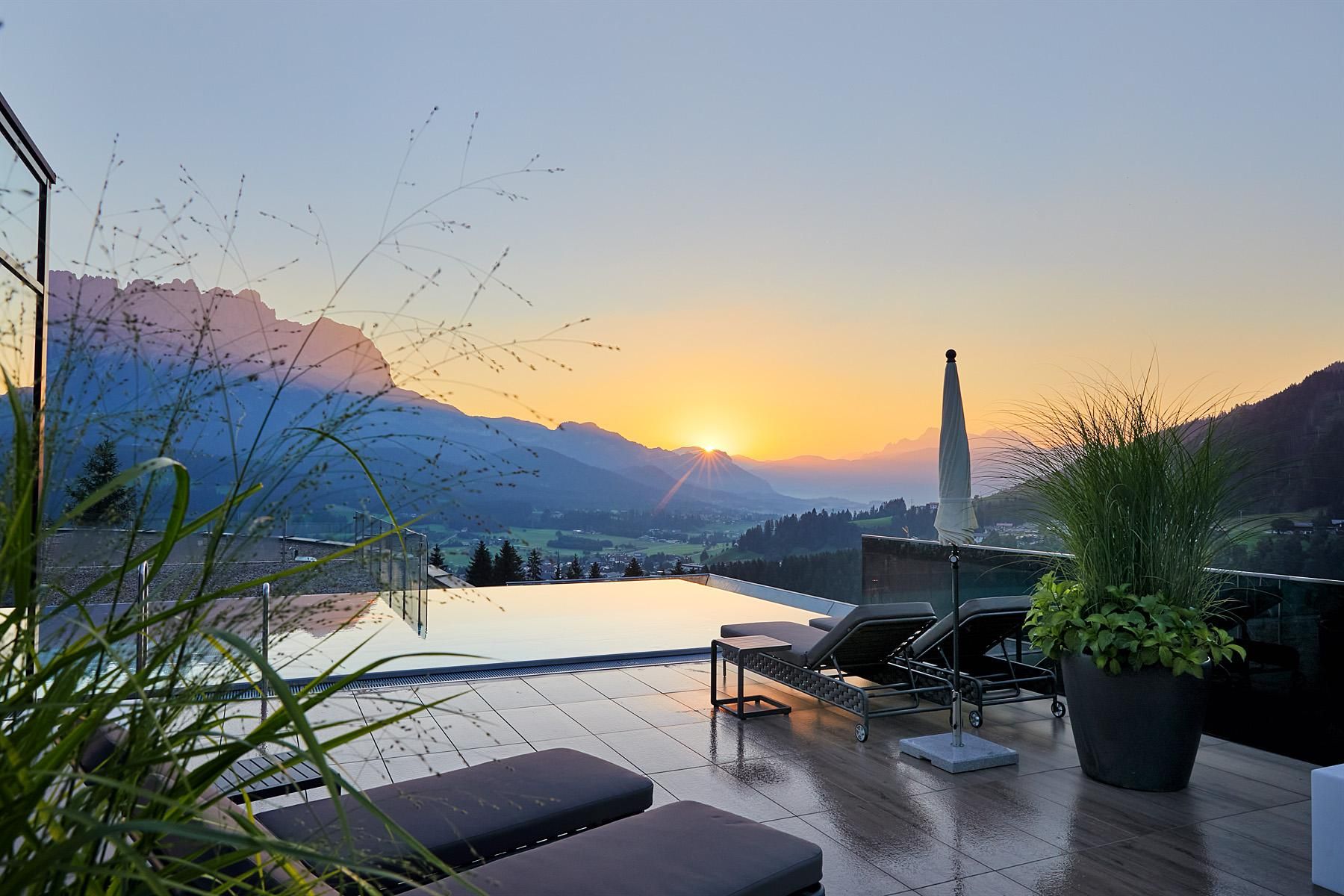 Enjoy unique alpine wellness flair in "Austrias Hotel of the Year 2022" our family-run luxury hotel (52 rooms/suites) situated in an extremely privileged location on a sunny plateau high above Ellmau with breathtaking views to the Wilder Kaiser. In winter directly next to the Hartkaiser valley ski run and in summer the perfect starting point for extensive hikes.