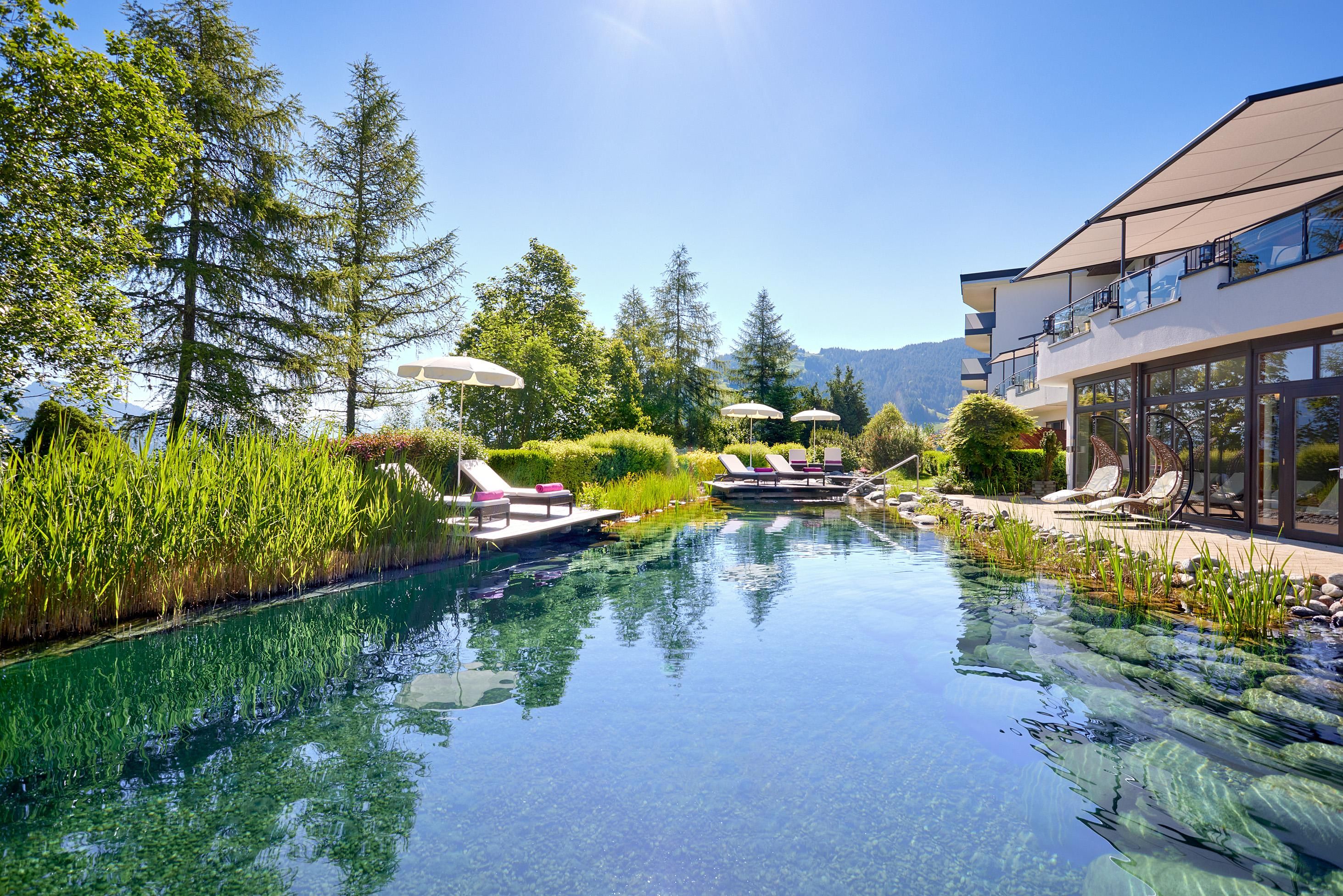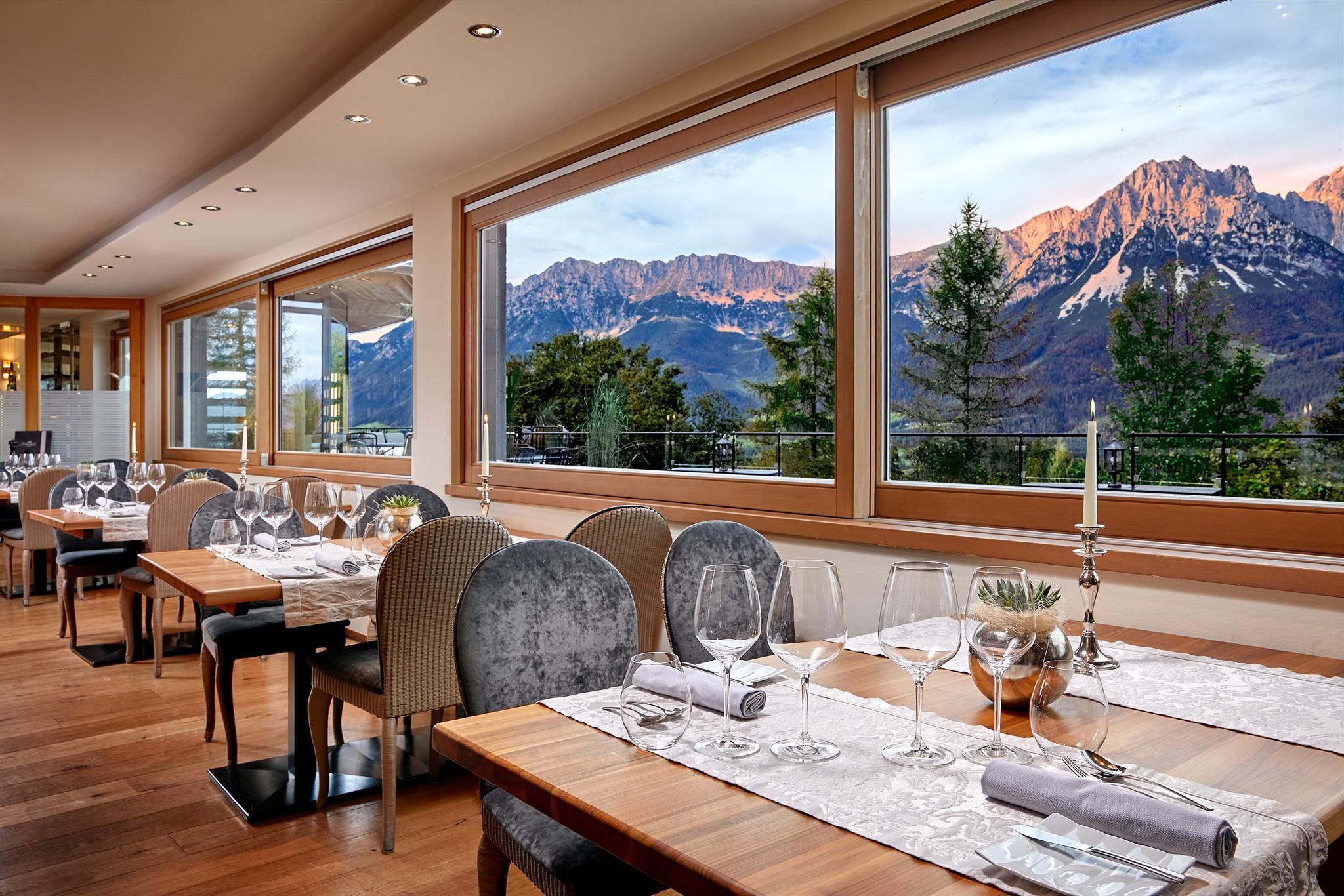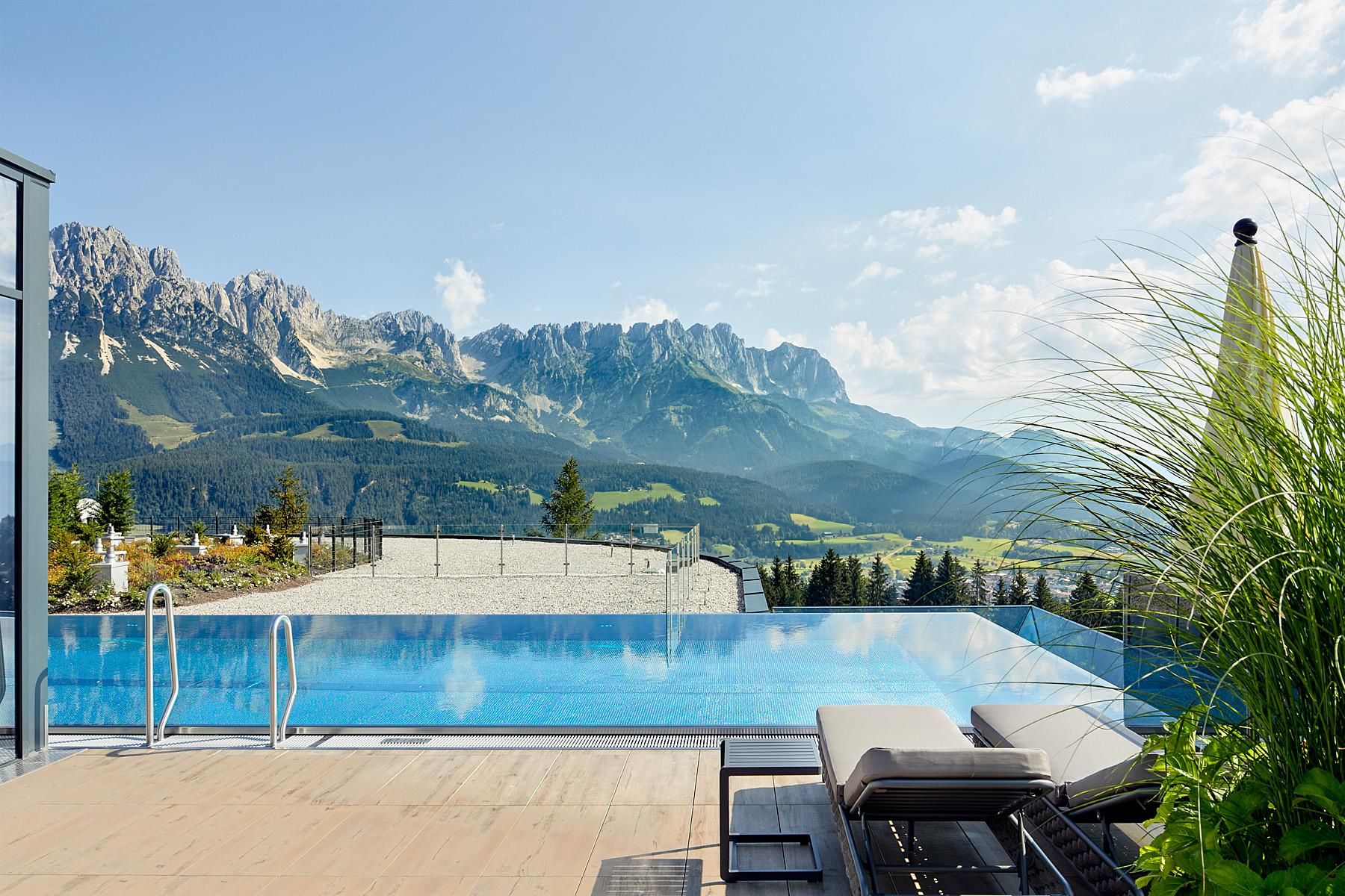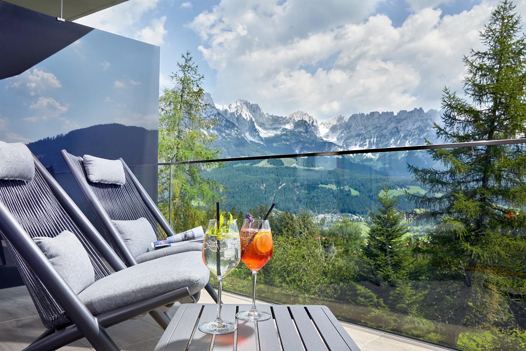Enjoy unique alpine wellness flair in "Austrias Hotel of the Year 2022" our family-run luxury hotel (52 rooms/suites) situated in an extremely privileged location on a sunny plateau high above Ellmau with breathtaking views to the Wilder Kaiser. In winter directly next to the Hartkaiser valley ski run and in summer the perfect starting point for extensive hikes.