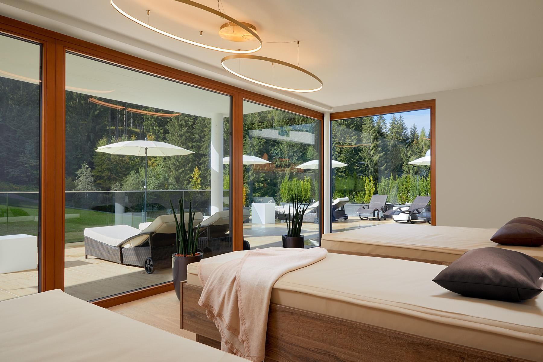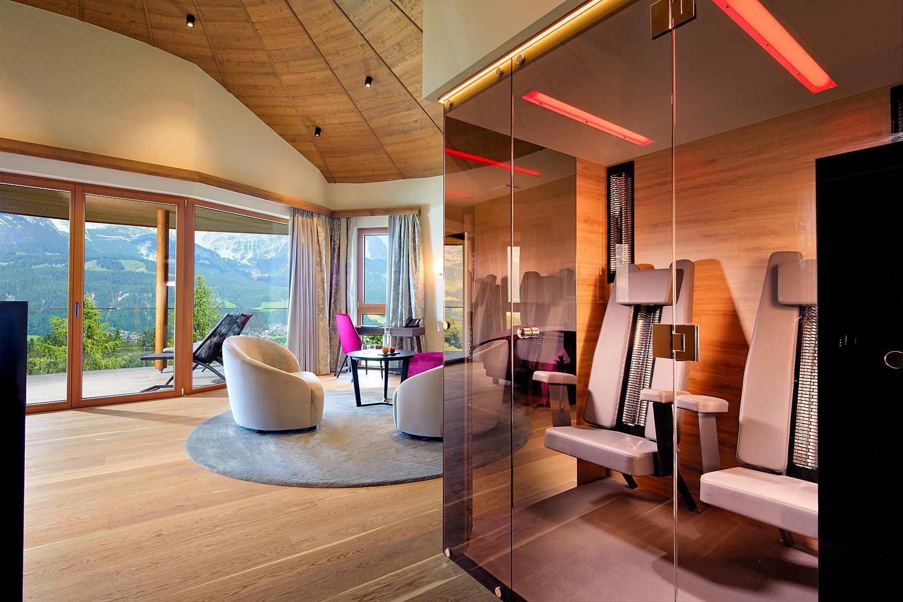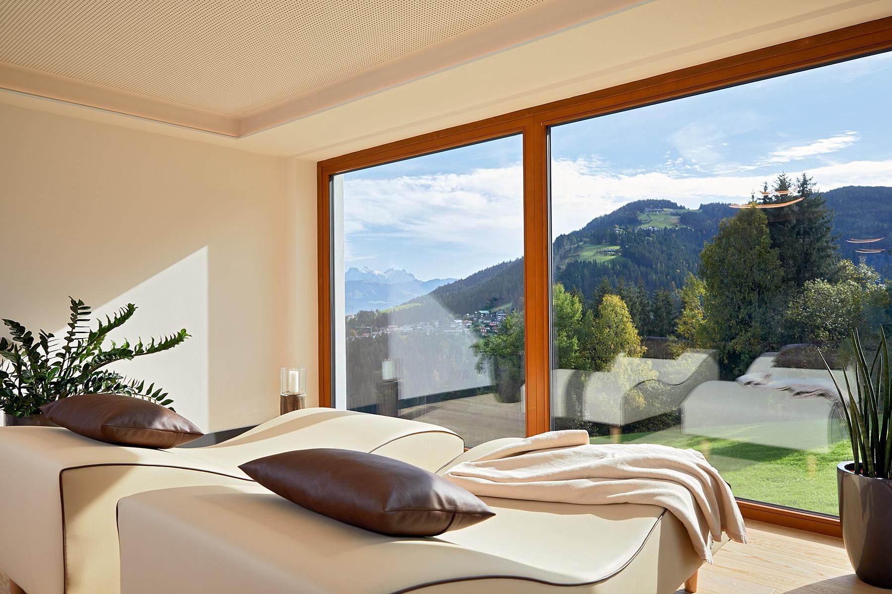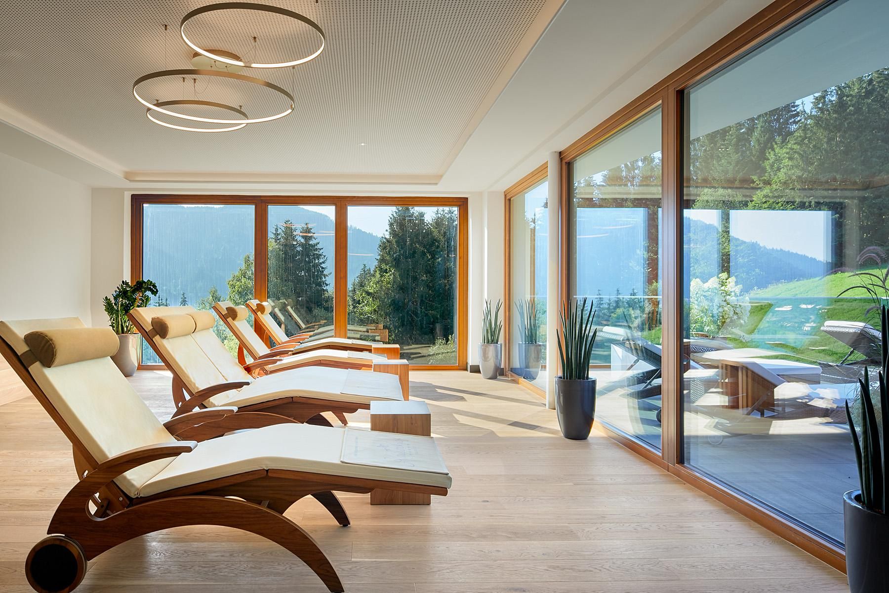 The spacious rooms and suites (40 to 75 m²) with large window surfaces and glass balconies offer a fantastic view. Nature is literally in your own room. Pure Relaxation on 4 levels in the brand-new Adults-Only Spa Tower with all season heated 18-meter-long Unlimited Mountain Pool “rooftop” with a 360-degree view.