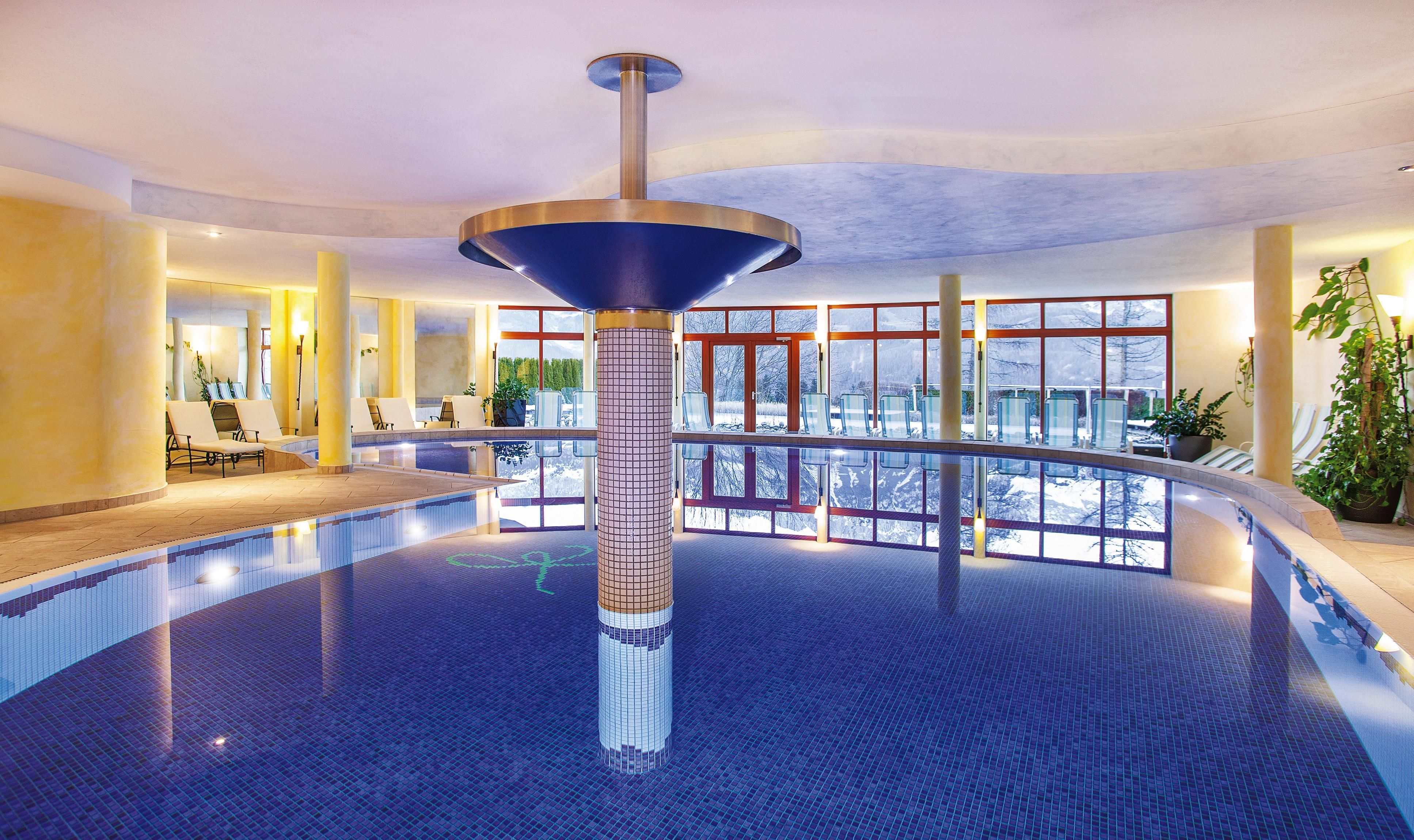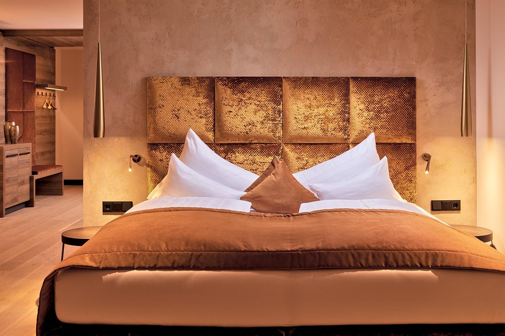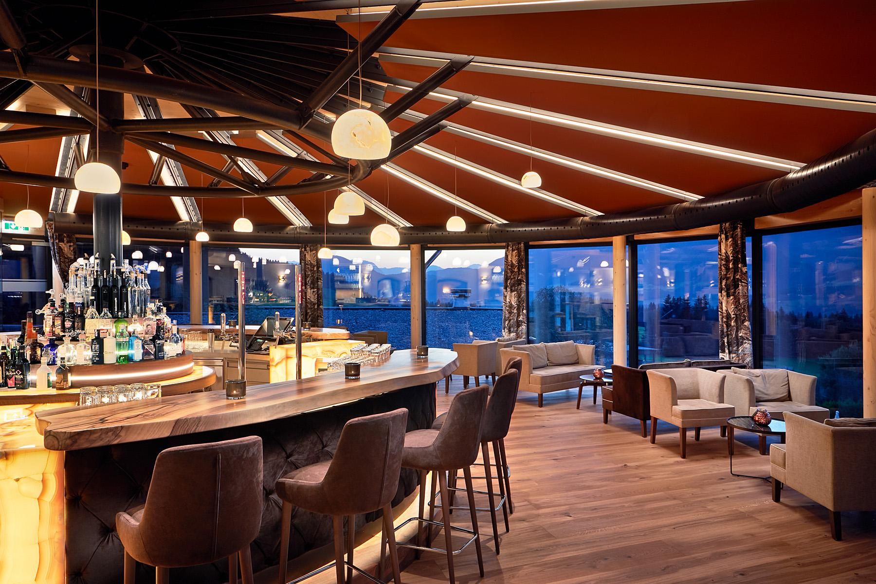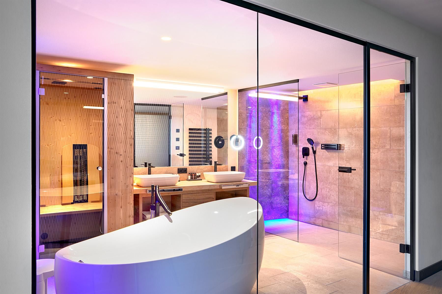 The spacious rooms and suites (40 to 75 m²) with large window surfaces and glass balconies offer a fantastic view. Nature is literally in your own room. Pure Relaxation on 4 levels in the brand-new Adults-Only Spa Tower with all season heated 18-meter-long Unlimited Mountain Pool “rooftop” with a 360-degree view.