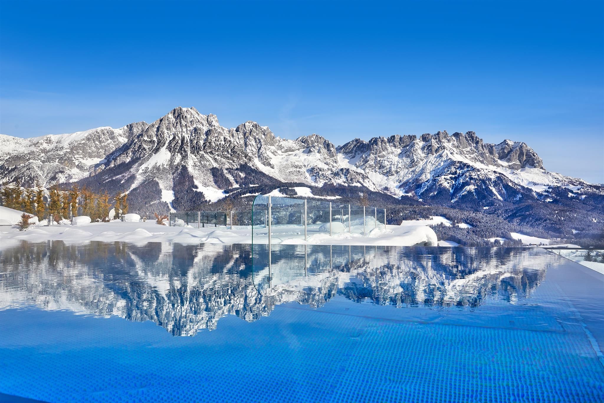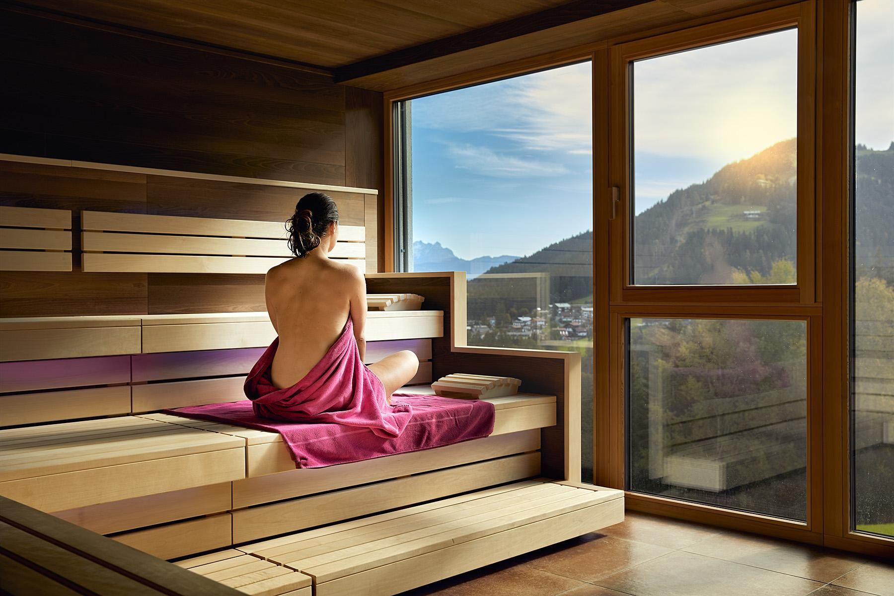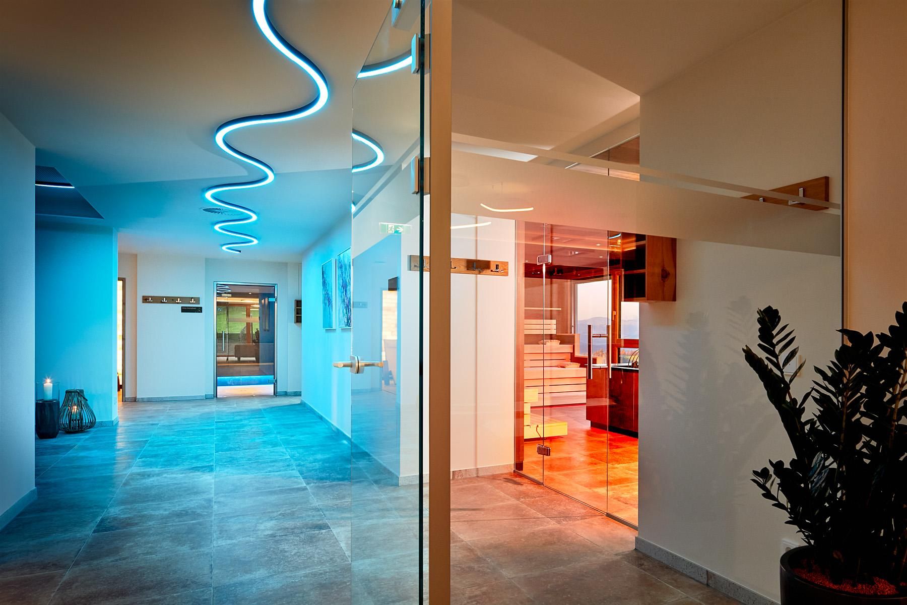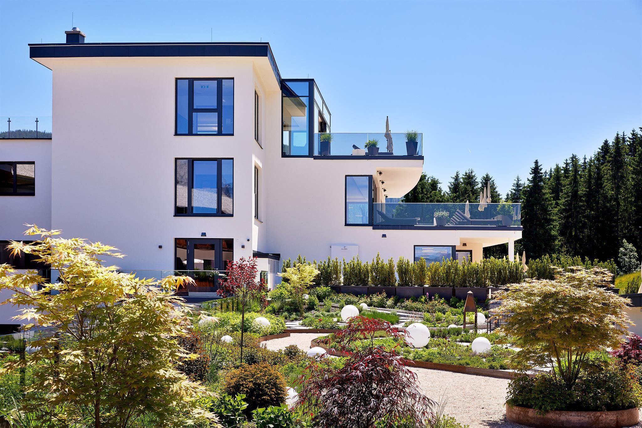 The spacious rooms and suites (40 to 75 m²) with large window surfaces and glass balconies offer a fantastic view. Nature is literally in your own room. Pure Relaxation on 4 levels in the brand-new Adults-Only Spa Tower with all season heated 18-meter-long Unlimited Mountain Pool “rooftop” with a 360-degree view.