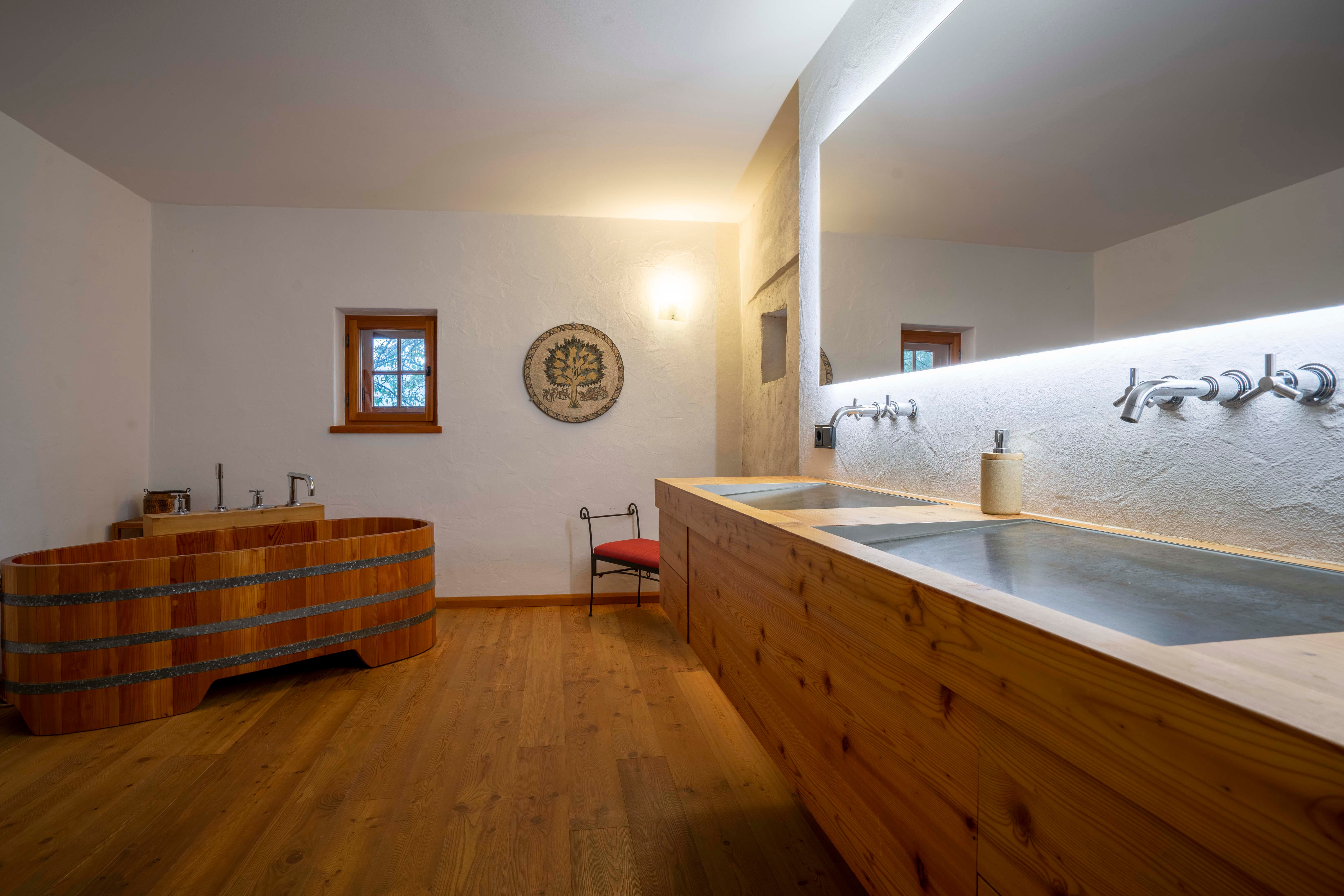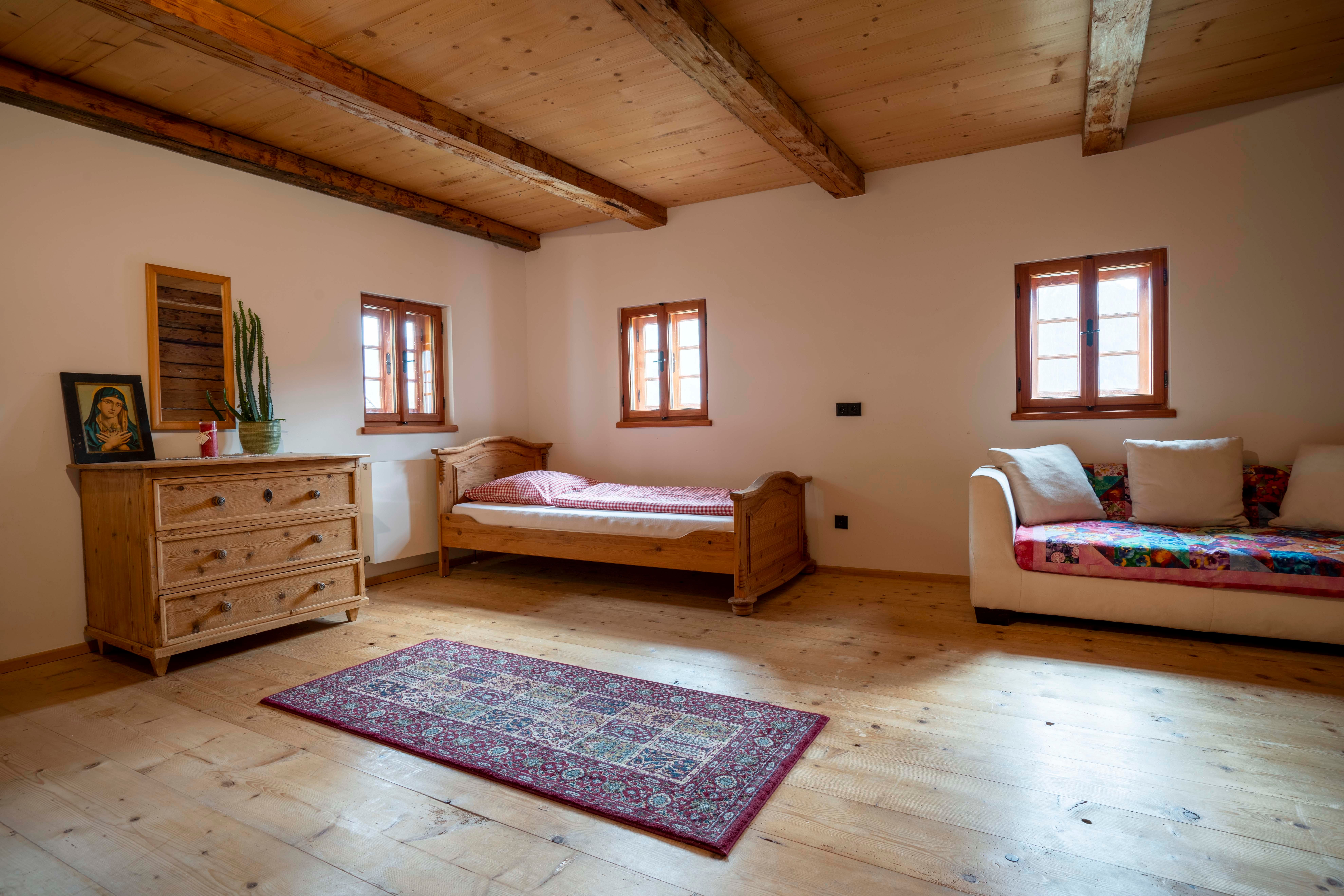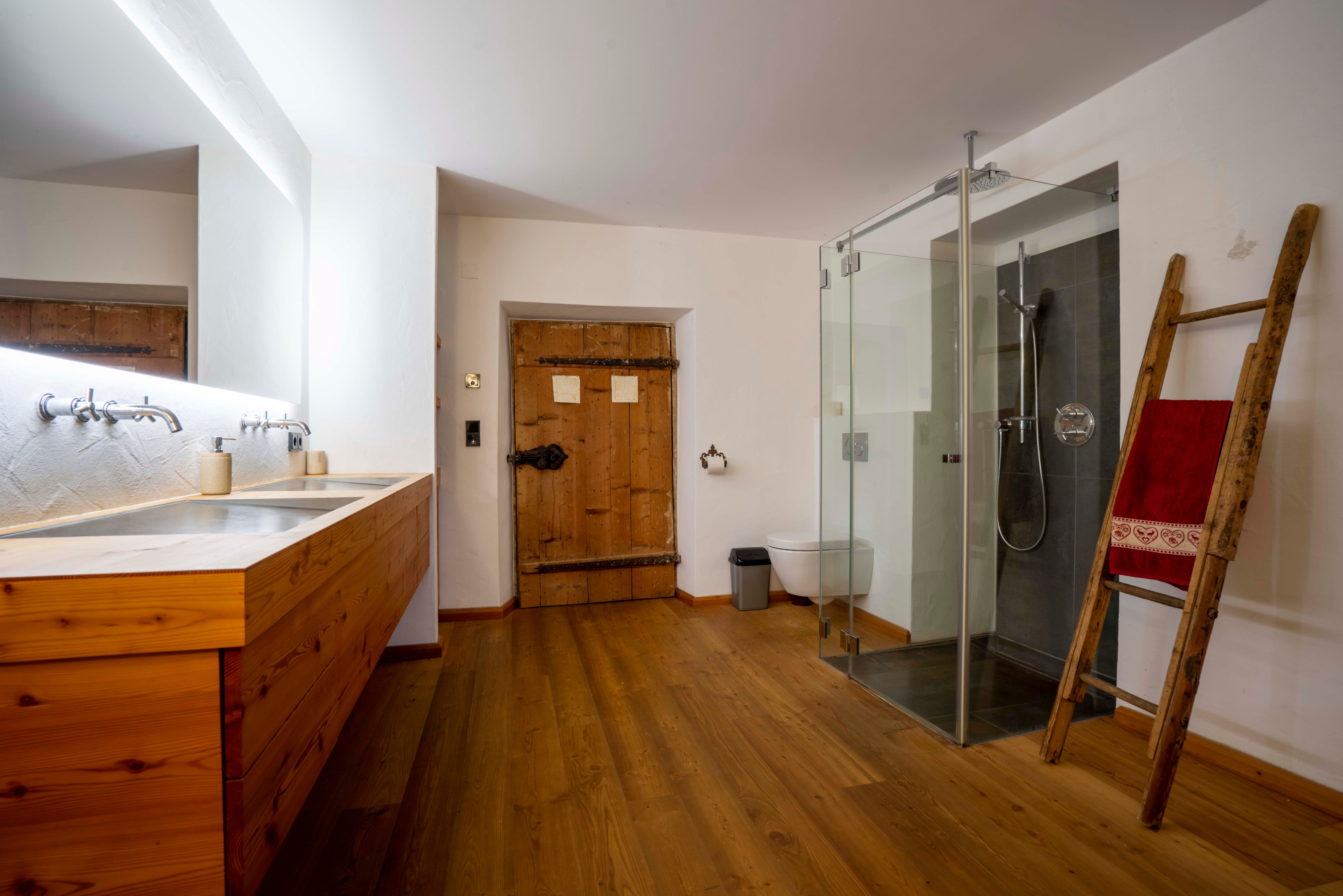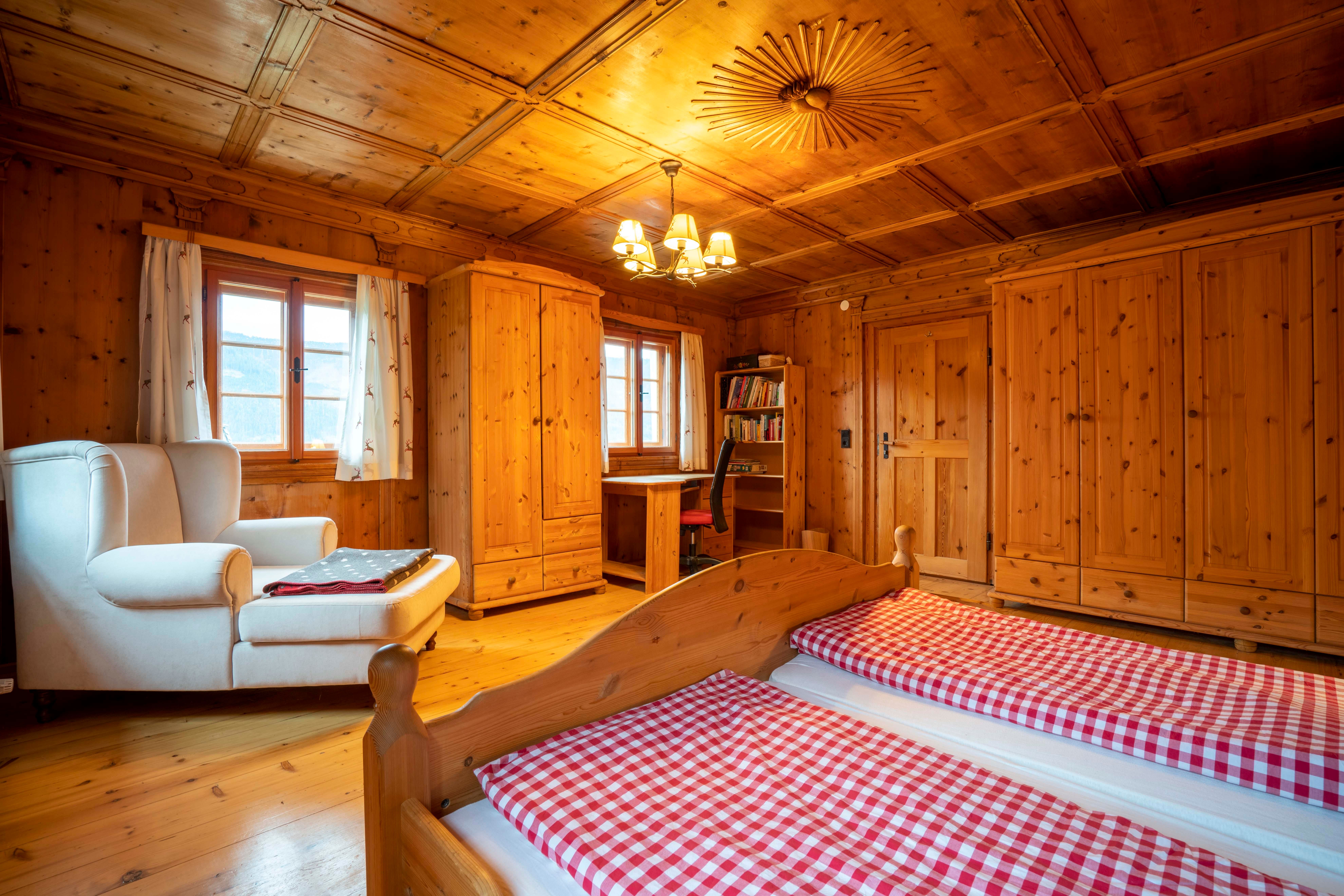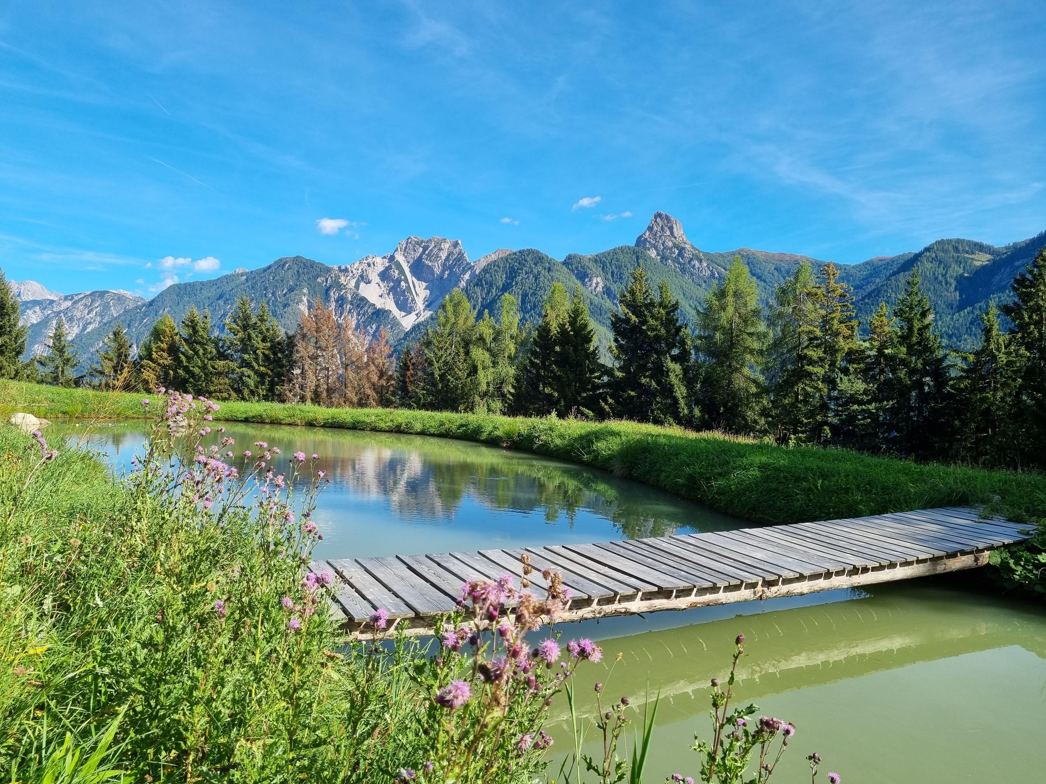 Next to the house is the chapel, stable building (farm animals, bouldering in the hay, outdoor yoga) and snack gardens. In summer, a swimming pond offers refreshment.