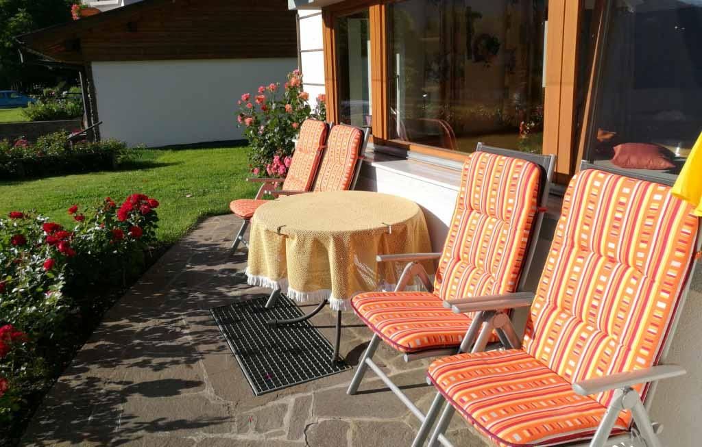 Lovely ap., the ap. takes up the complete 1st fl oor. Large kitchencum- dining room (dish washer), 3 bedrooms, balcony, patio, lawn with garden furniture. 2 km from town centre.