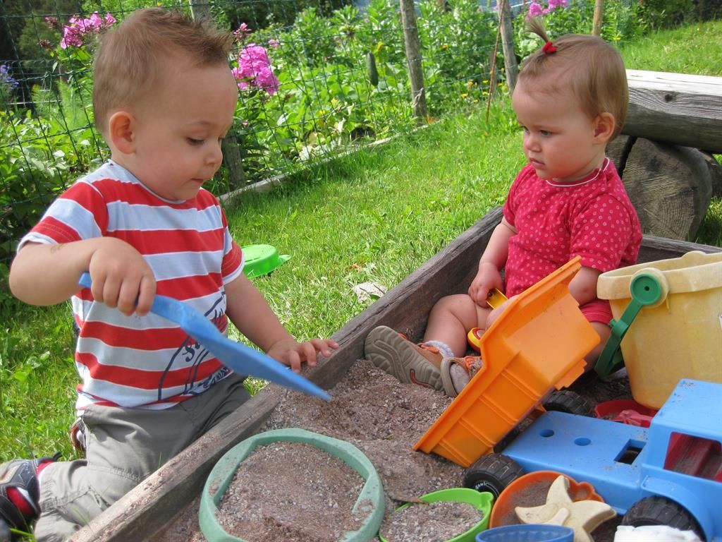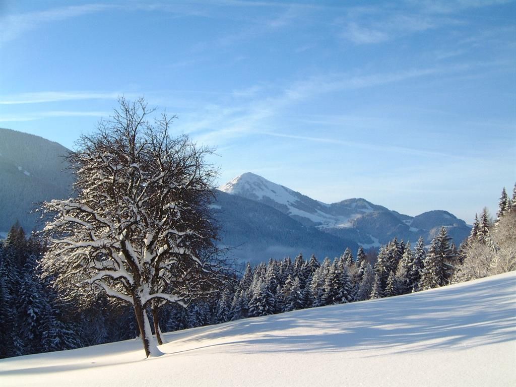 Our farmhouse lies in a quiet and sunny position at the foot of the Wilder Kaiser, 850m above sea level. 2,5km from Hintersteinersee and the Skiwelt. We have 5 ensuite rooms and one holiday apartment sleeping 2-7 persons each. Organic farming. There are cows, calvs and pigs as well as cats and rabbits living on our farm. Sat-TV, radio, safe, table tennis, playground, lawn for sunbahing, large terrace, farmhouse parlor with tiled stove, dryer for shoes. Baby equipment provided, reduction for children.