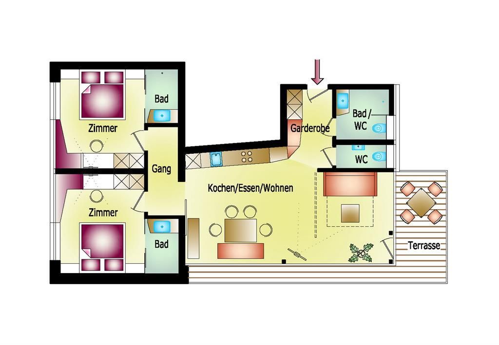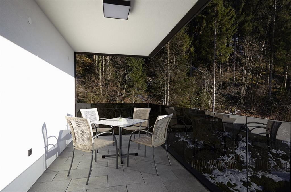 On our spacious patio or the balcony with views of the Zillertal’s mountain scenery you can end an active day with a glass of wine. Every apartment has 2 modern, lovingly furnished double rooms with comfortable bathrooms. The spacious living and dining area comes with a fully equipped kitchenette, a large dining table and satellite TV. Enjoy fresh and healthy drinking water from our own spring directly in your apartment.