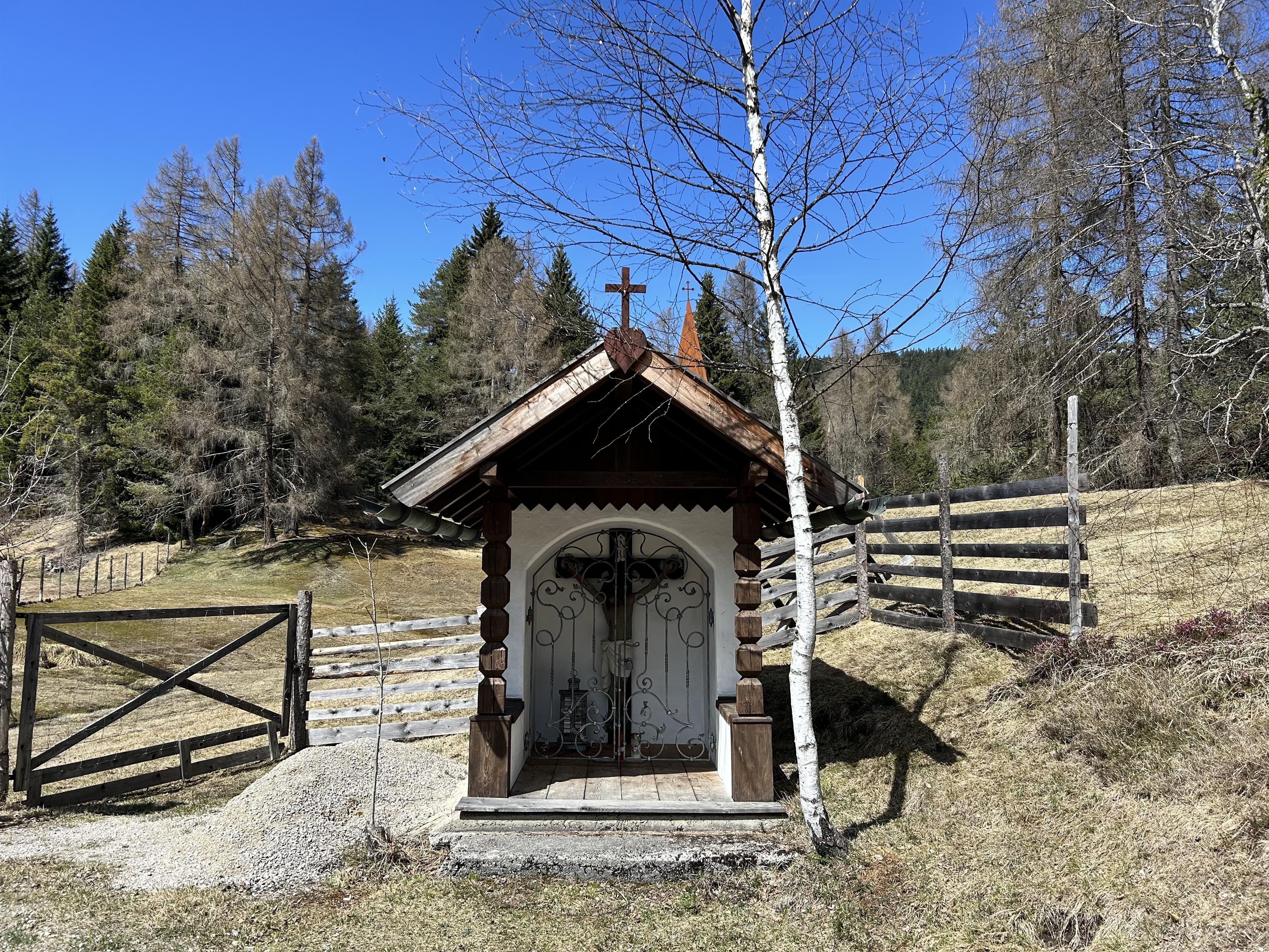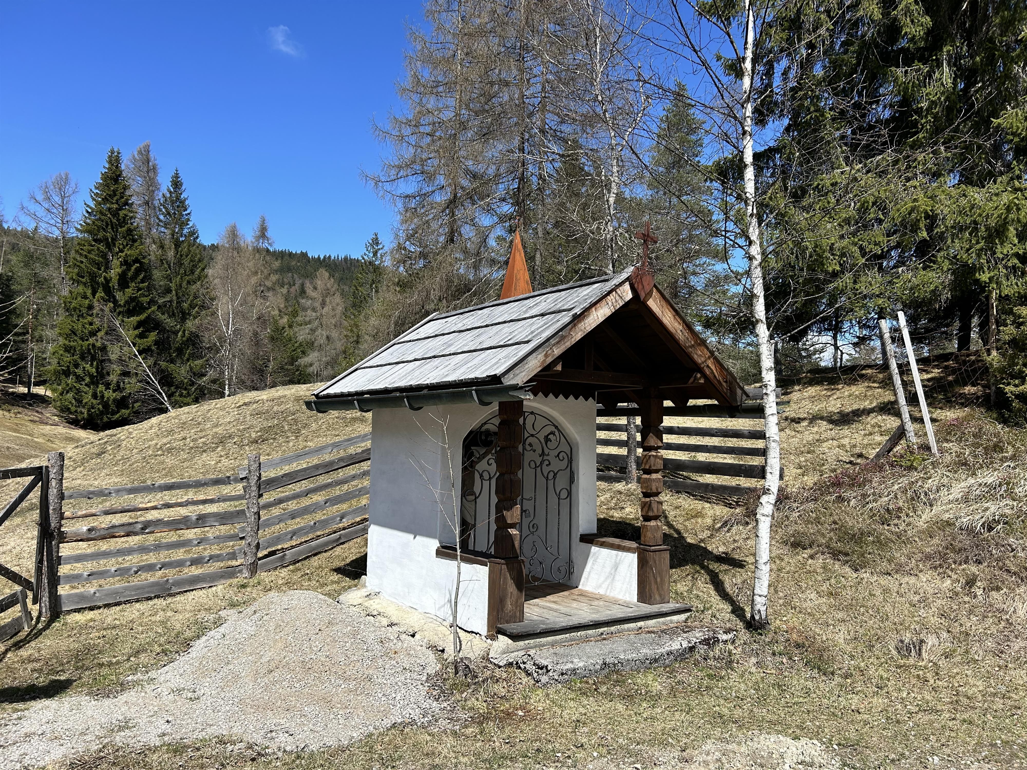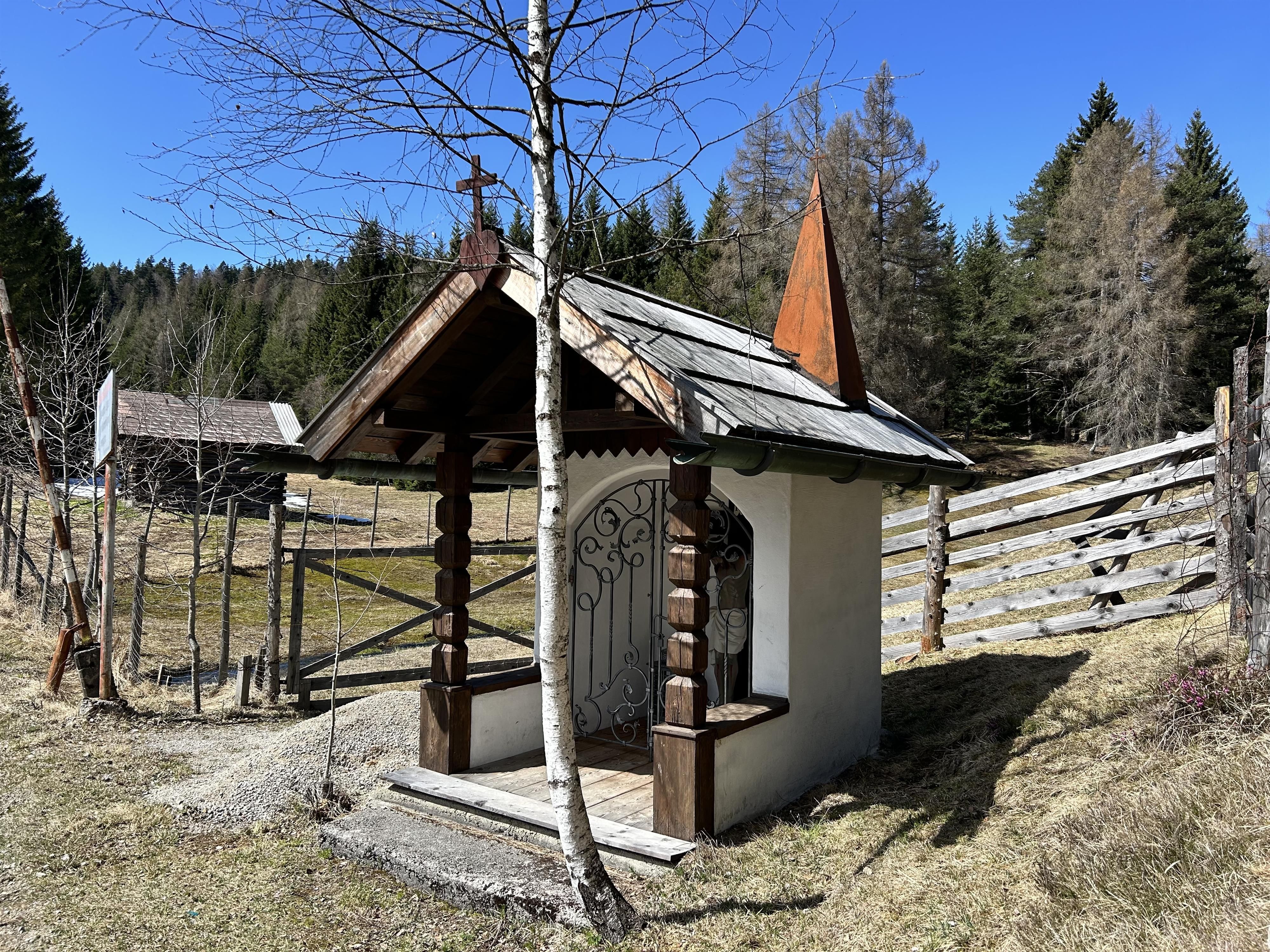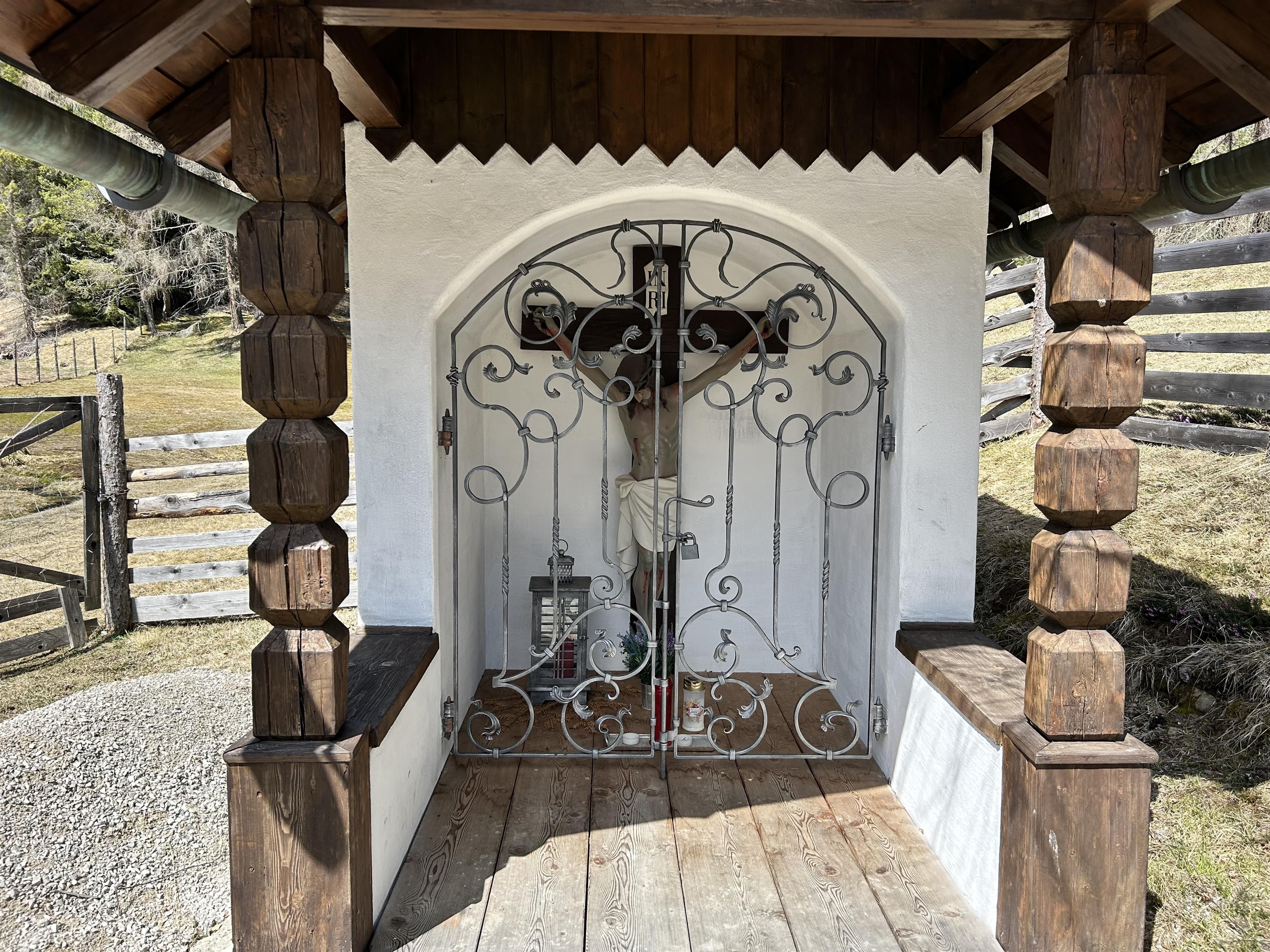 Between Mösern and Seefeld stands a small, quiet wayside chapel. Built in 1905 by Nikolaus Spiegel from Mösern, the chapel commemorates his son, who tragically lost his life at this very spot. Two inscription plaques inside still hold this fate today, turning the place into a spot for reflection. The masonry structure is distinguished by its characteristic, overhanging gable roof, supported by simple wooden columns. In the segmentally arched niche stands an impressive figure of Christ from the 19th century, which gives the small building a special presence. Over the years, the chapel has been maintained and cared for by various families from Mösern. In 2025, it underwent a careful renovation, allowing it to shine anew today. The name "Marte," which appears in connection with the chapel, actually derives from the old farmhouse name of the present Pension Spiegel, even though ownership has changed several times since its construction.