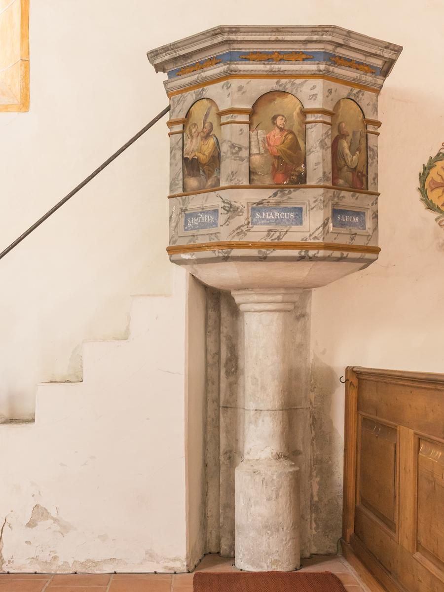 The church was restored in 1981. During this restoration, seccomalerei in the vault and frescoes on the exterior wall were uncovered. Unlike fresco painting, which is done on fresh, still damp lime plaster, seccomalerei is painted on already dry plaster or dry masonry.