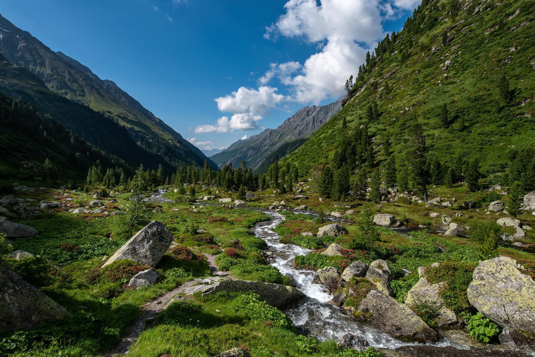 Thundering waterfalls, creeks accompanying the stream, moors, a stream creeping in many curves, larch forests and flowery meadows, glaciers and lakes, chamois and ibex, as well as eagles, bearded vultures, dippers, marmots and a multitude of butterflies can be observed.