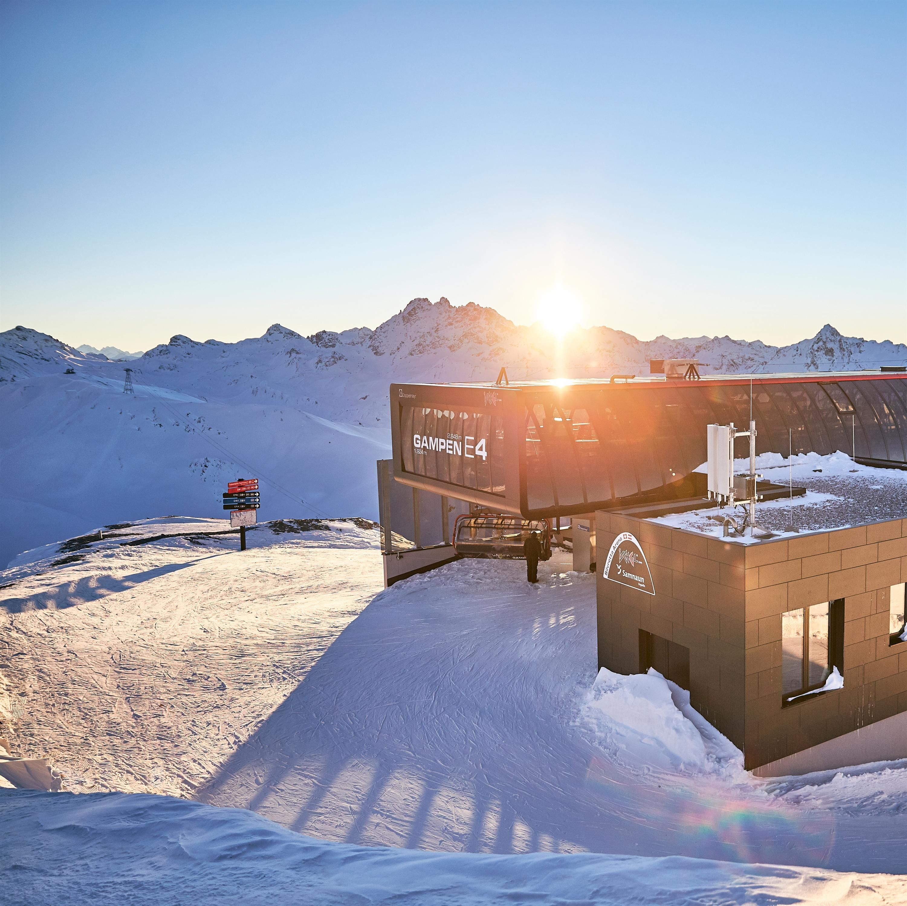Perched at 2,848 metres above sea level, the Gampenbahn E4 mountain station is one of the region’s most impressive locations. From the summit of the Palinkopf, you can either head straight down one of the Silvretta Arena’s most popular slopes – red run number 40 – or take a moment to capture the breathtaking panorama. Slope number 80 will even take you further into Switzerland, down to Samnaun.