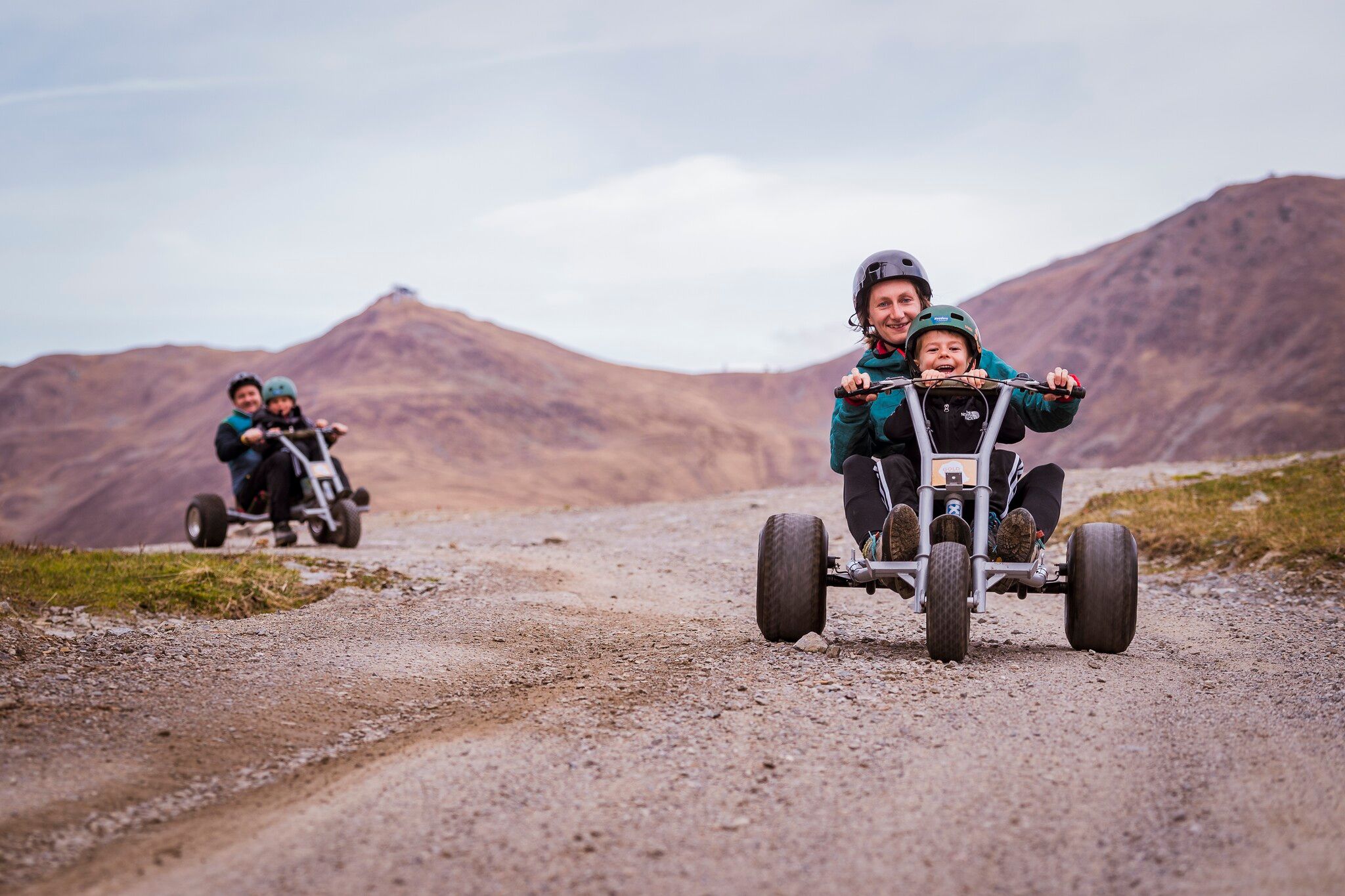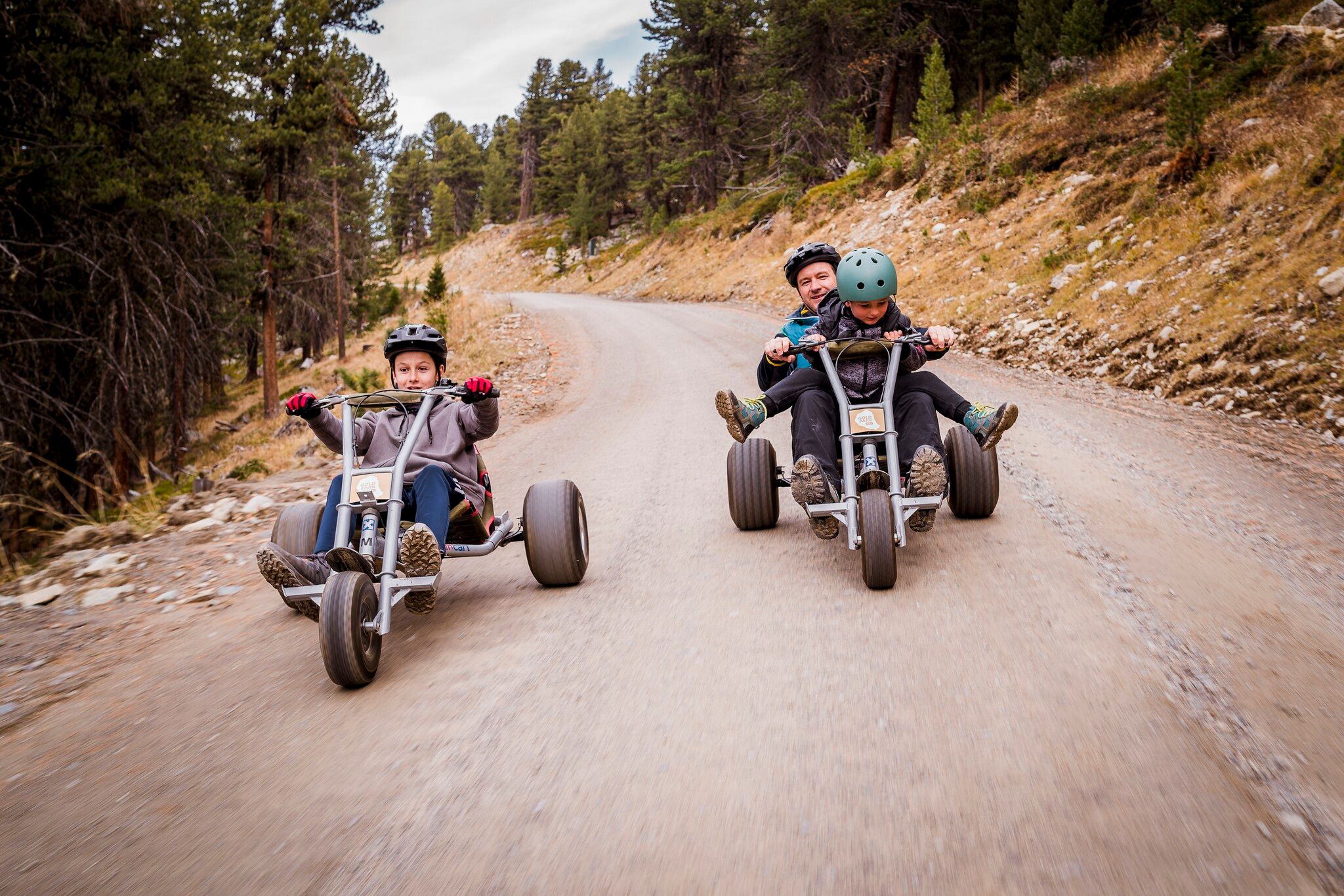With lots of speed, it's off on 3 tyres on the carts from the Bergkastel cable car mountain station with lots of fun & action down into the valley.