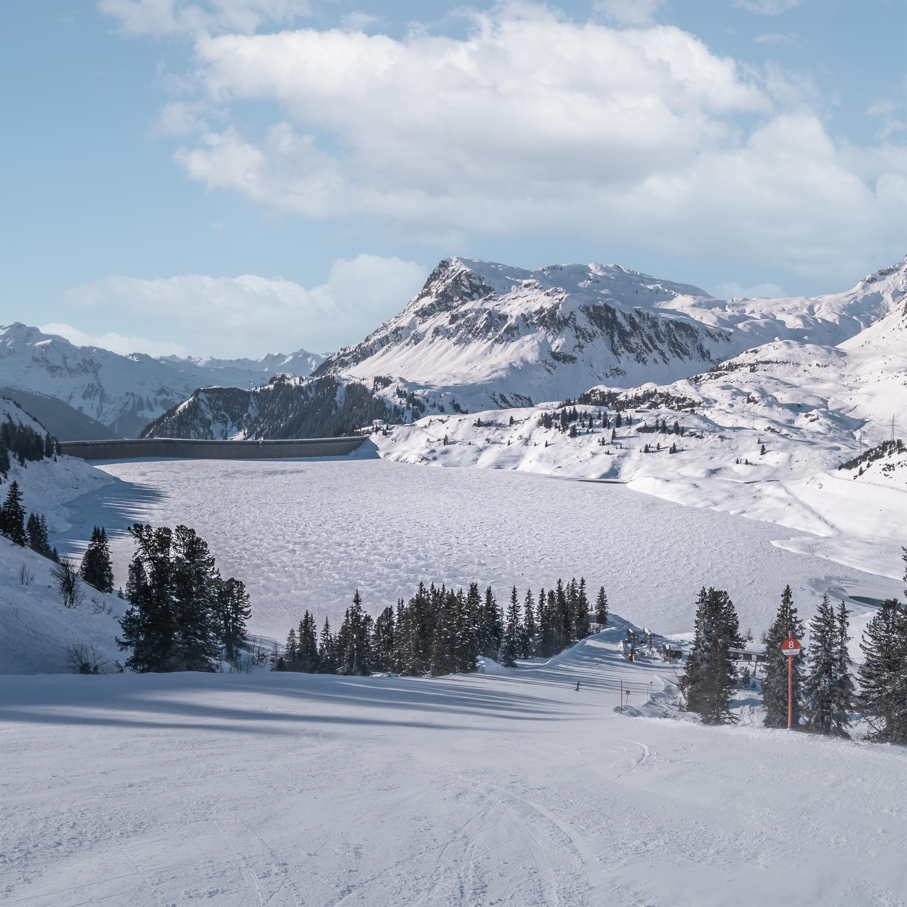 At an altitude of 1,809 meters above sea level, Lake Kops impresses with its turquoise blue water surface, surrounded by picturesque mountain scenery. It was first completely dammed in 1967. Today, the reservoir is one of the region's largest technical achievements: with a catchment area of 170 square kilometers and a usable capacity of nearly 43 million cubic meters. In summer, the approximately five-kilometer circular path invites beautiful views of the lake and peaks. Accessible year-round, the viewpoint is one of the quieter photo spots in Galtür.