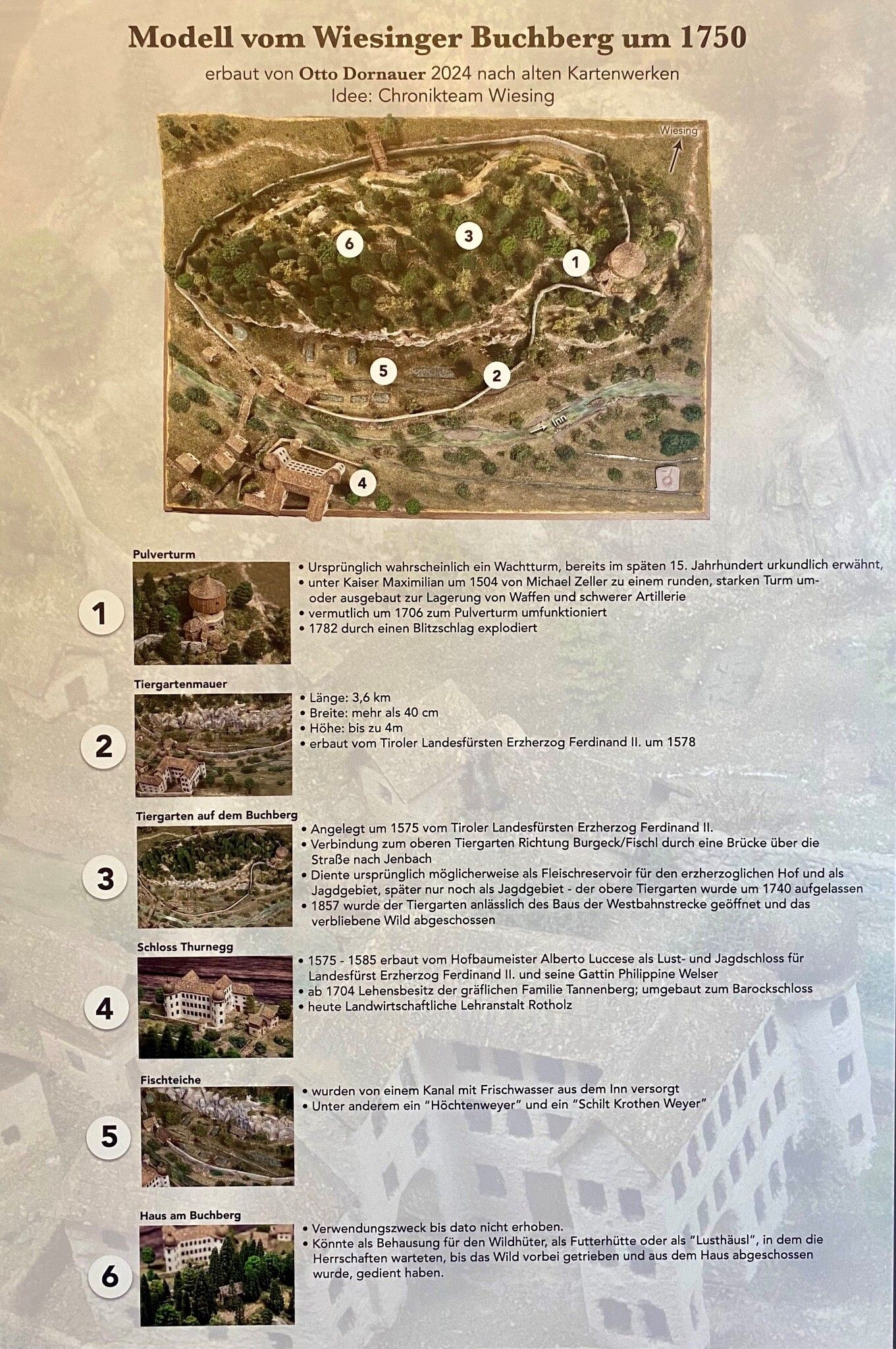 In the late 15th century, a watchtower was built on the Buchberg, which was later converted into a powder tower. In the 16th century, Archduke Ferdinand II had Thurnegg Castle built, complete with a game enclosure and its surrounding wall. Today, history comes alive thanks to Otto Dornauer from Wiesing, who has created a detailed, true-to-scale model of the Buchberg. Based on old maps, the model shows what the area looked like around 1750 and is displayed alongside an information board in the entrance of Wiesing’s municipal building.