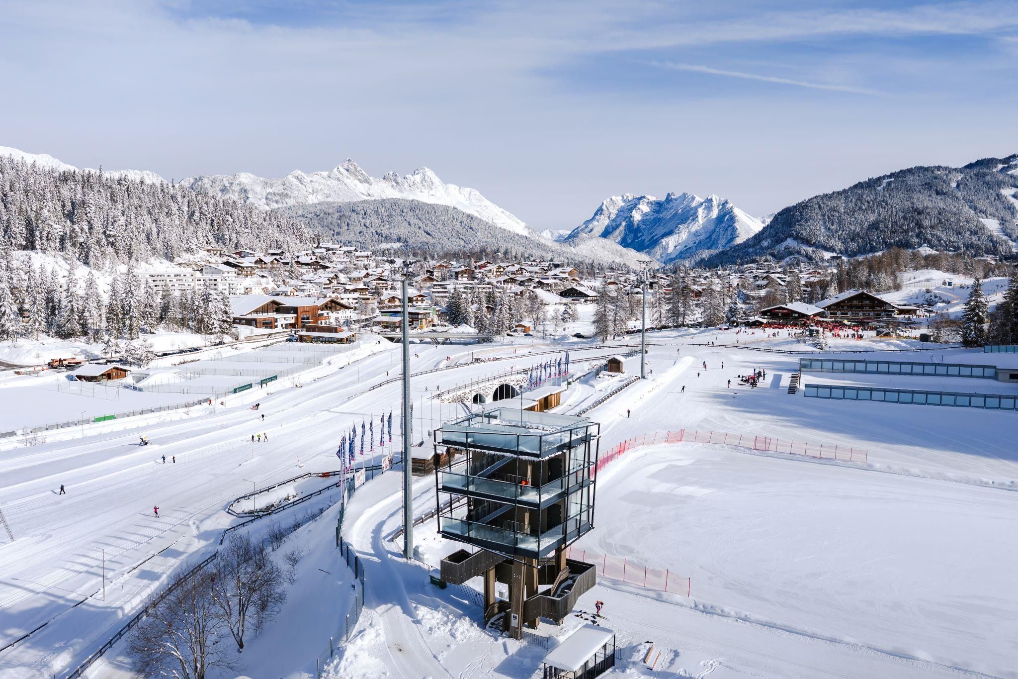 The World Championships Tower that majestically soars over the Arena365 in Seefeld was built in the course of the FIS Nordic World Ski Championships and is intended to send a sustainable, lasting and visible signal to the sporting world. Used for the first time at the World Championships, the two-storey, 15 m high tower also serves as the centre for race control, announcers and timekeeping at future events. This fulfils the basic idea of sustainable use.