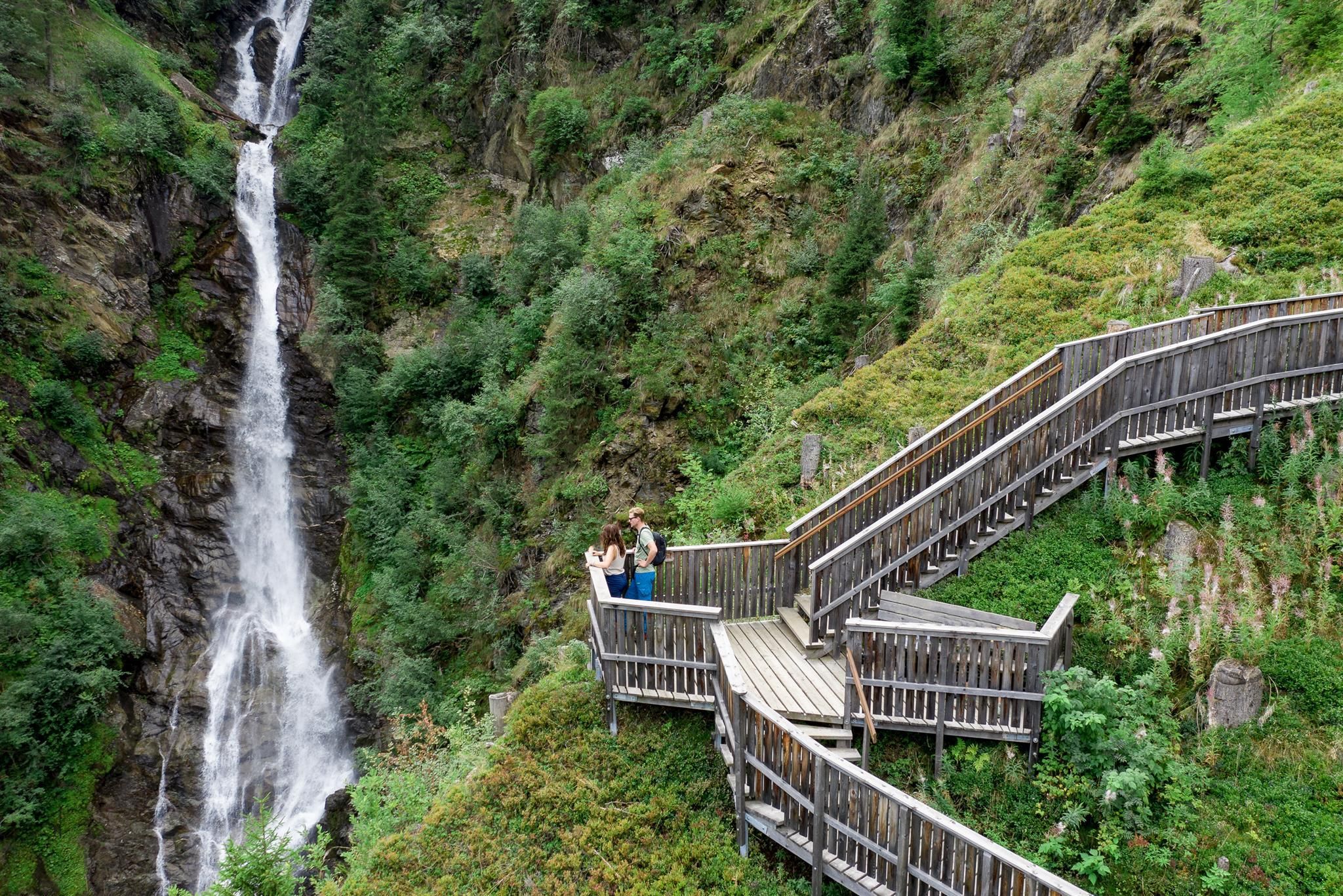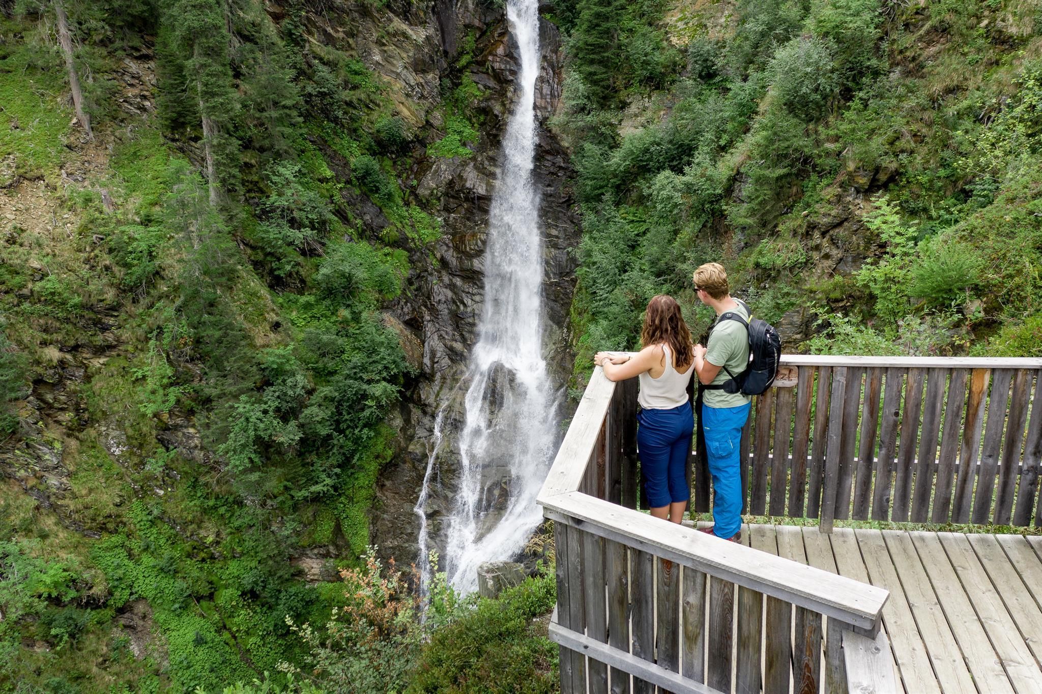 Viewing platforms allow you to experience the falling water up close. The viewing platform at the Maria Hilfer (also known as Staller) waterfall has a simple, durable design made from larch wood and allows you to experience the falling water of the waterfall up close - the cooling spray of the water masses is particularly pleasant in hot summer temperatures. With the viewing platform, "box seats" have been created for the natural spectacle of the waterfall. It can be reached after a short hike from Maria Hilf or as a small addition to the Water experience trail St. Jakob i. D..