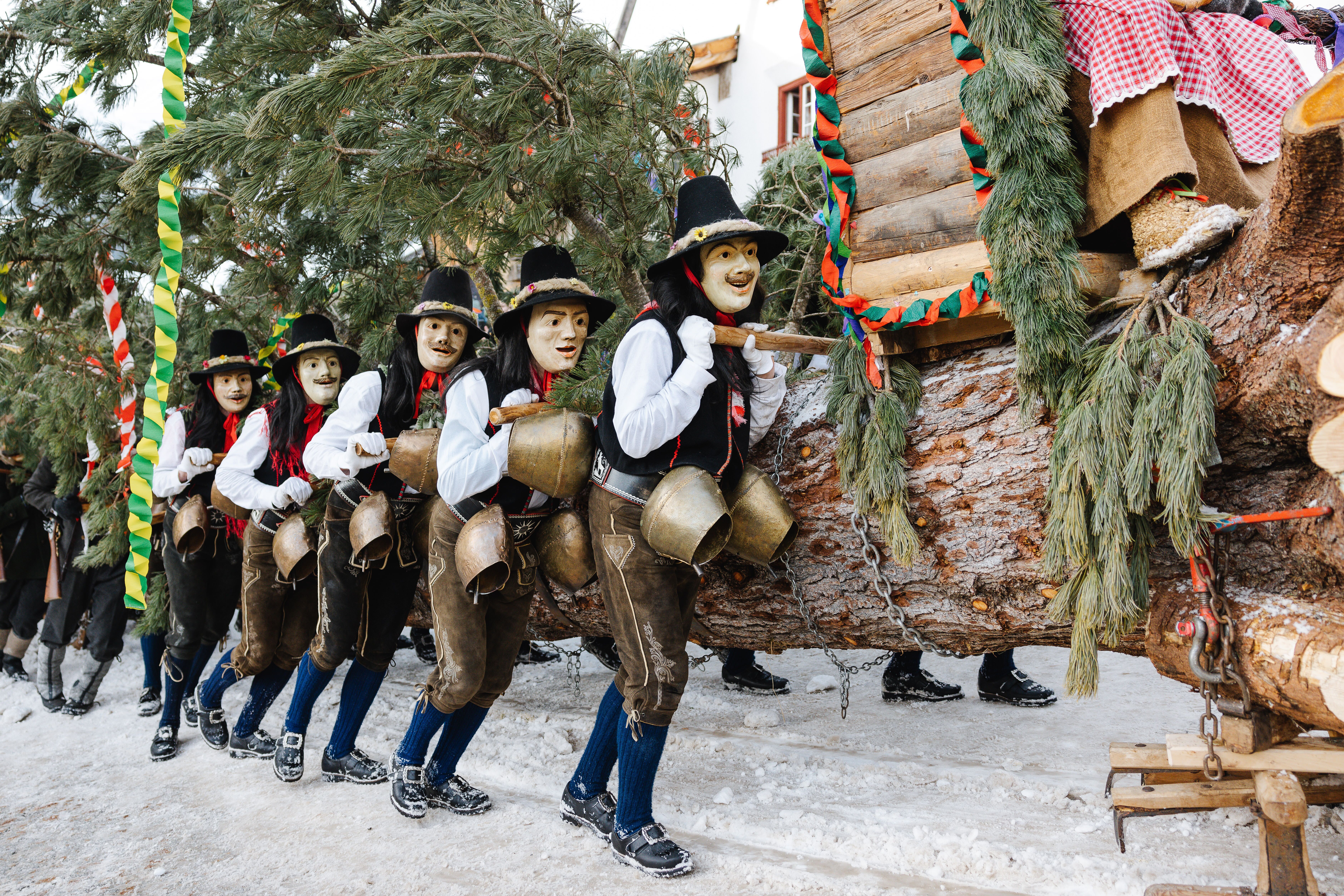Fisser Blochziehen: A group of disguised men pull a 35 metre long tree on sledges through a small village - the "Blochziehen" in Fiss admittedly sounds like a spin-off of the horror classic "The Wicker Man". However, the spring and fertility festival actually has a long tradition. Figures such as "carters", "bear drivers" or "Bajatzl" are supposed to drive away evil demons, symbolised by "witches" and "Schwoaftuifl", and conjure up good spirits and spring. At the end of the procession, the wood of the pulled Swiss stone pine is traditionally auctioned off. Watch out: The Blochziehen only takes place every four years.