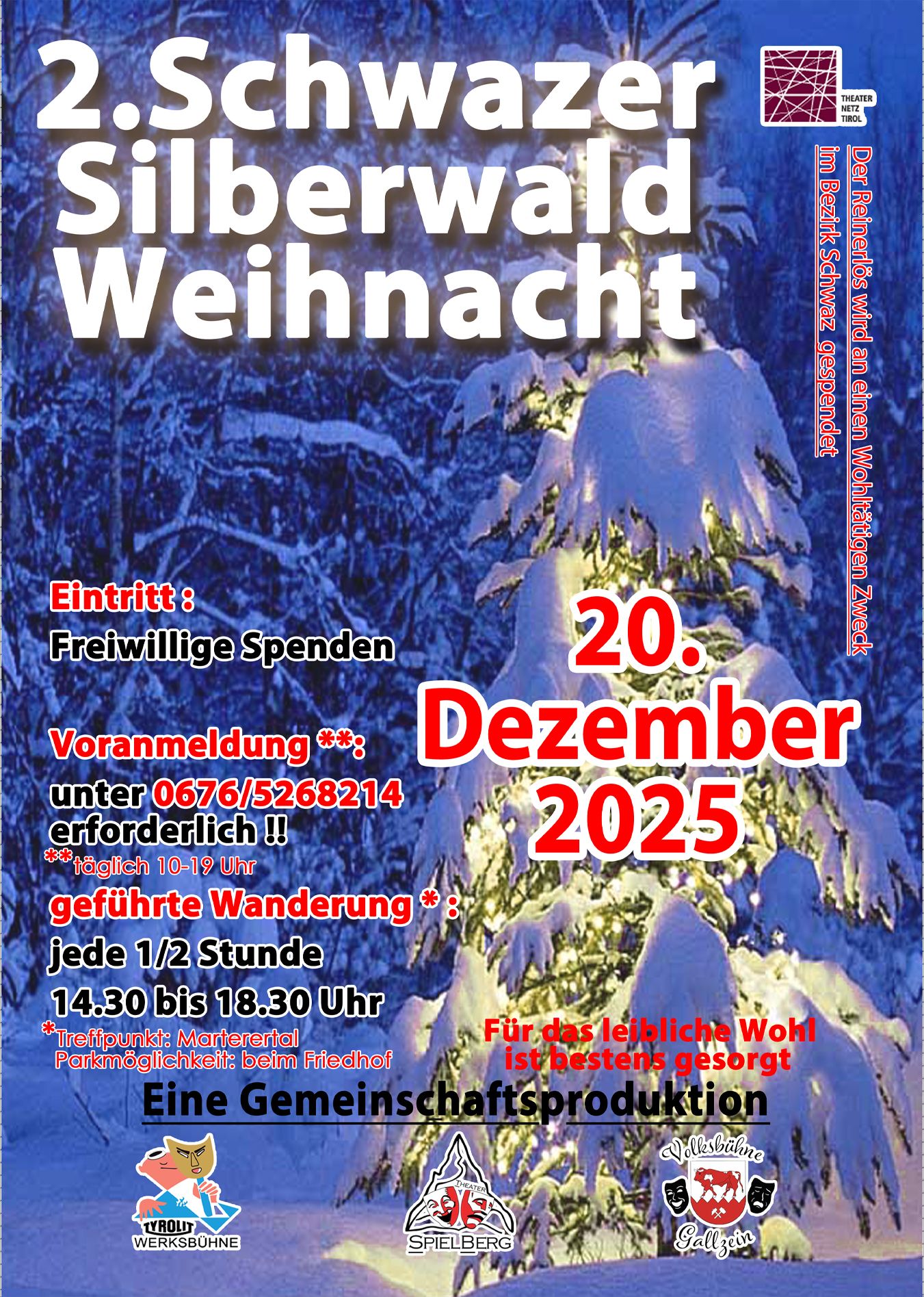 Am 20. Dezember 2025 laden die Werksbühne Tyrolit, das Theater SpielBerg und die Volksbühne Gallzein herzlich zur 2. Schwazer SilberwaldWeihnacht ein. Unter dem Motto Weihnachten wie damals möchten die drei Theaterbühnen den Besucherinnen und Besuchern eine besinnliche Auszeit vom vorweihnachtlichen Trubel schenken ganz ohne Hektik und Stress, dafür mit Herz und einer guten Botschaft.