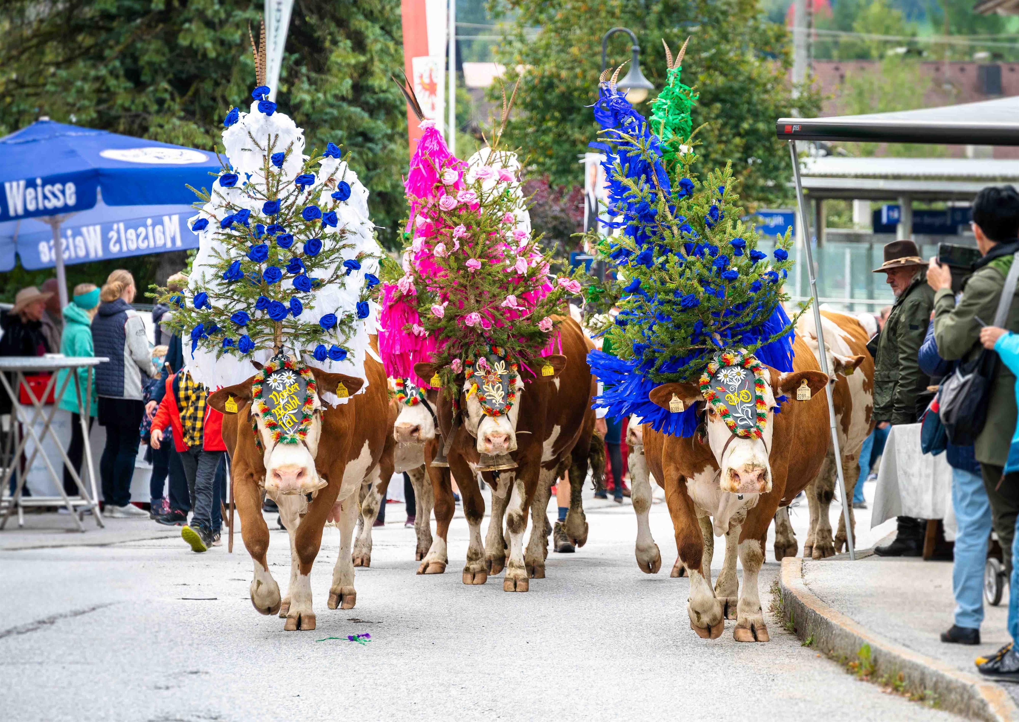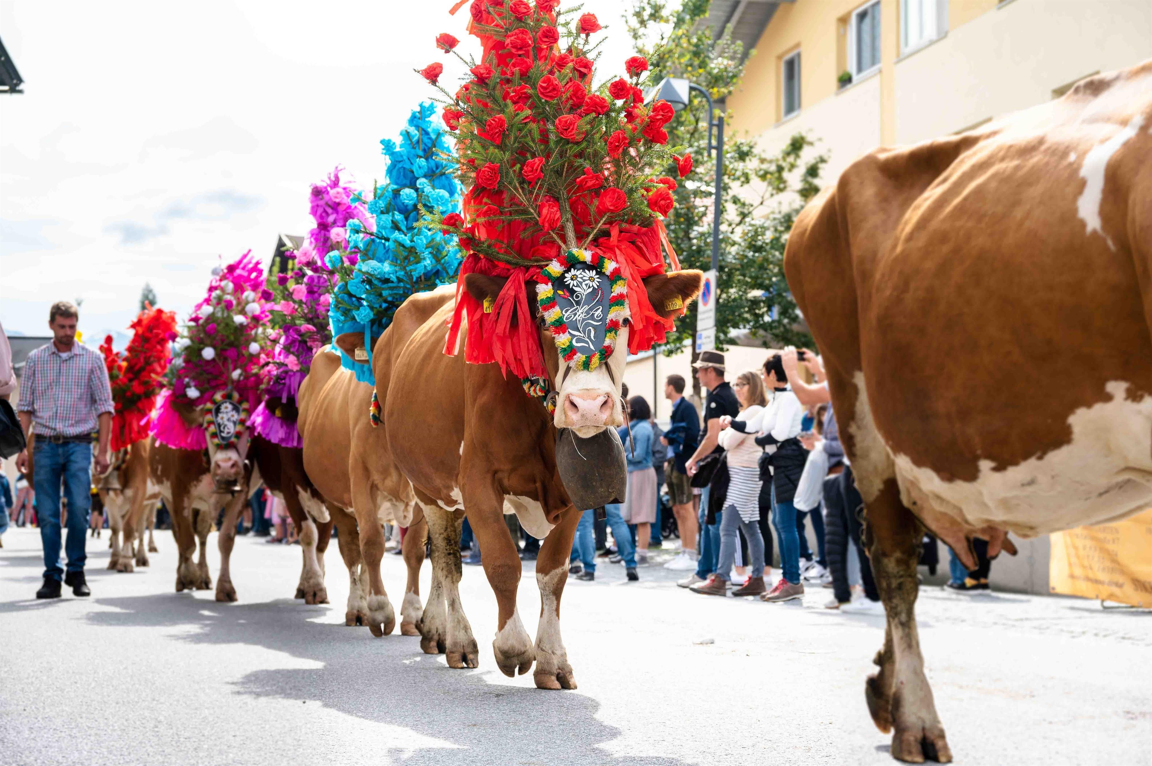Early in the morning the cows and calves are festively decorated with colourful flower arrangements. This is an expression of gratitude that the alpine summer has passed without misfortune.Often the two-legged and four-legged march home for hours, and while the lush meadows in the valley await the cows as a reward, for the alpine herders and dairymen it is the joyful confusion and celebration that welcomes them after weeks of silence on the mountains.