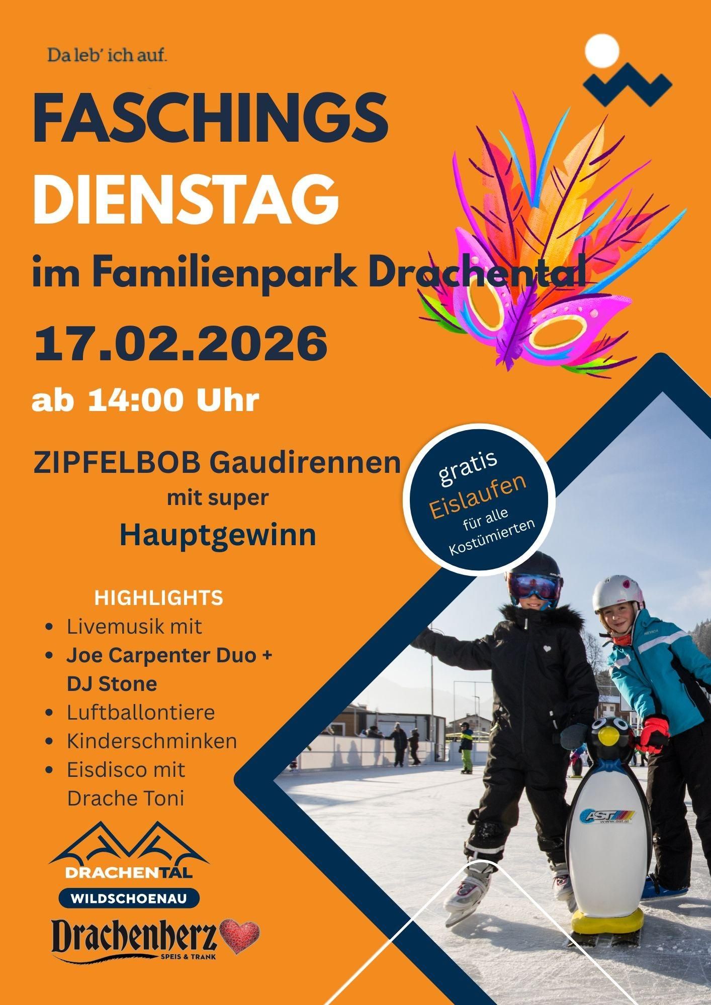 Carnival fun at Drachental Family Park | "Zipfellbob" fun race | Live music with Joe Carpenter Duo & DJ Stone | Face painting | Ice disco with Dragon Toni and much more! | Free admission!