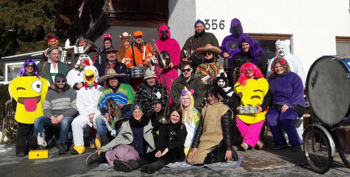 Parade of dressed-up musicians through Scharnitz with fundraising. We would be happy to meet you at home or in the village! The parade will start at 9.30 at the village square, with the following routes in the morning: Inrain, Au, Länd - from 11.30; Eisack - Neue Heimat - 13.30; Oberdorf, Jägerviertel, Frankenhof - 15.00; Bühel, Kindergarten - 16.30; Schanz - Raika - 17.30.