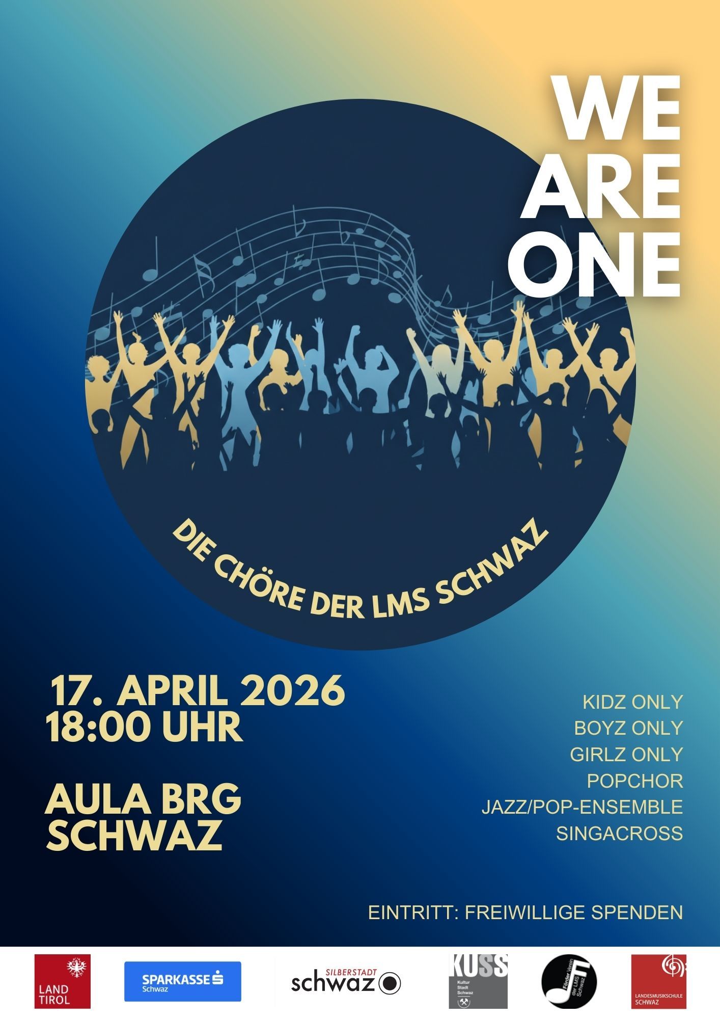 Am 17. April 2026 um 18:00 Uhr lädt die Landesmusikschule Schwaz zu einem besonderen Chorkonzert in die Aula des BRG Schwaz ein. Von den jüngsten Sänger*innen bei Kidz Only über die Jugendchöre Girlz Only und Boyz Only und den Popchor bis hin zum Erwachsenenchor Singacross zeigt sich die ganze Vielfalt des Chorsingens.