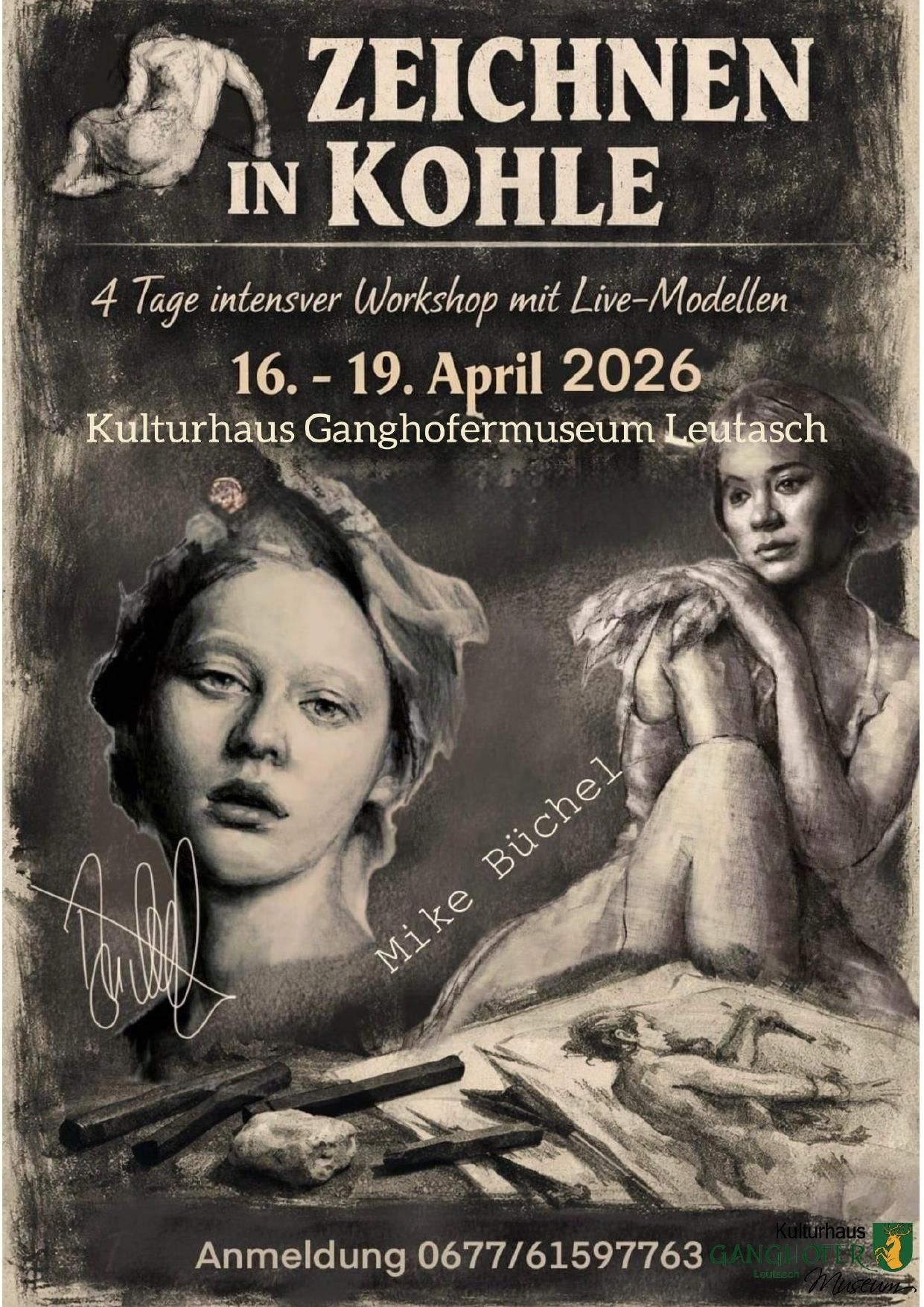 Four days of intensive artistic work with live models in the inspiring atmosphere of the Kulturhaus Ganghofermuseum – together with Mike Büchel. The workshop is aimed at anyone who wishes to deepen their skills in figure drawing or discover new techniques with charcoal.