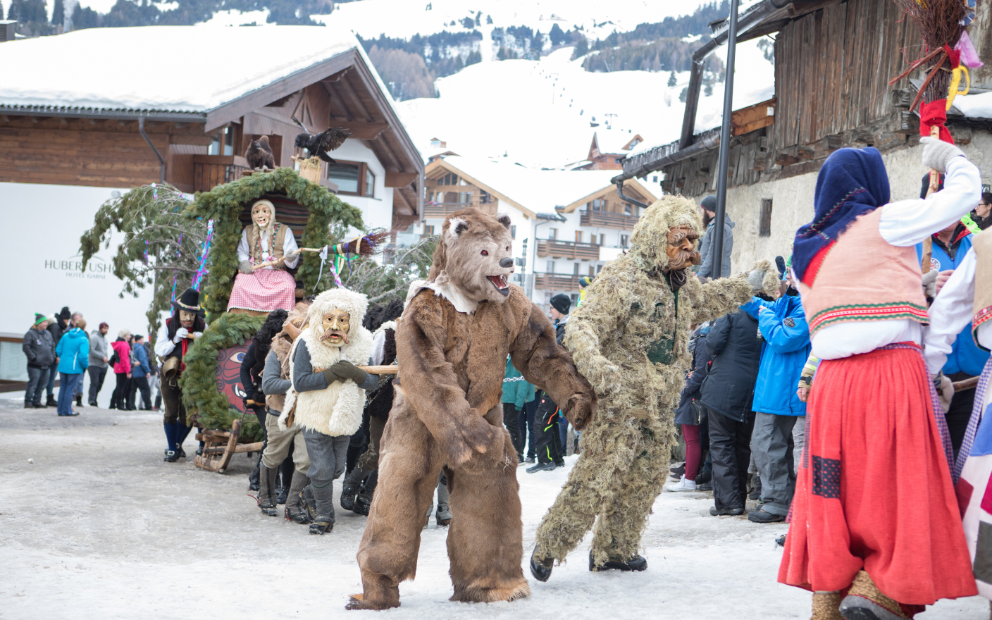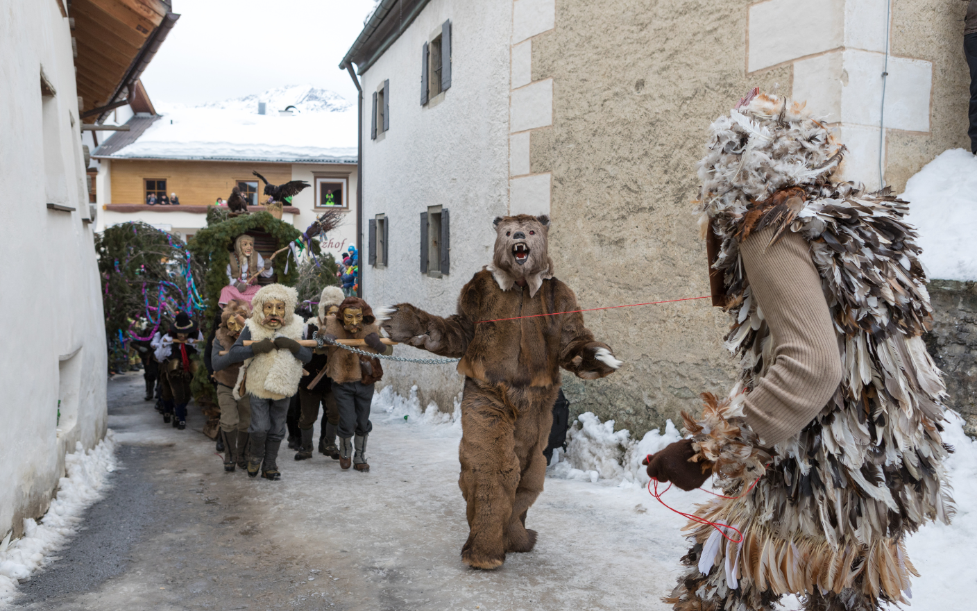 Every four years, Fiss transforms into a stage for one of the most impressive Tyrolean folklore plays: the Fisser Blochziehen. Around 60 masked figures – ranging from Mohrelen, Schallnern and witches to the bear and the "Schwoaftuifl" – pull the mighty Bloch tree through the village. This ancient carnival spectacle symbolizes the struggle of spring against winter and captivates both locals and guests alike.