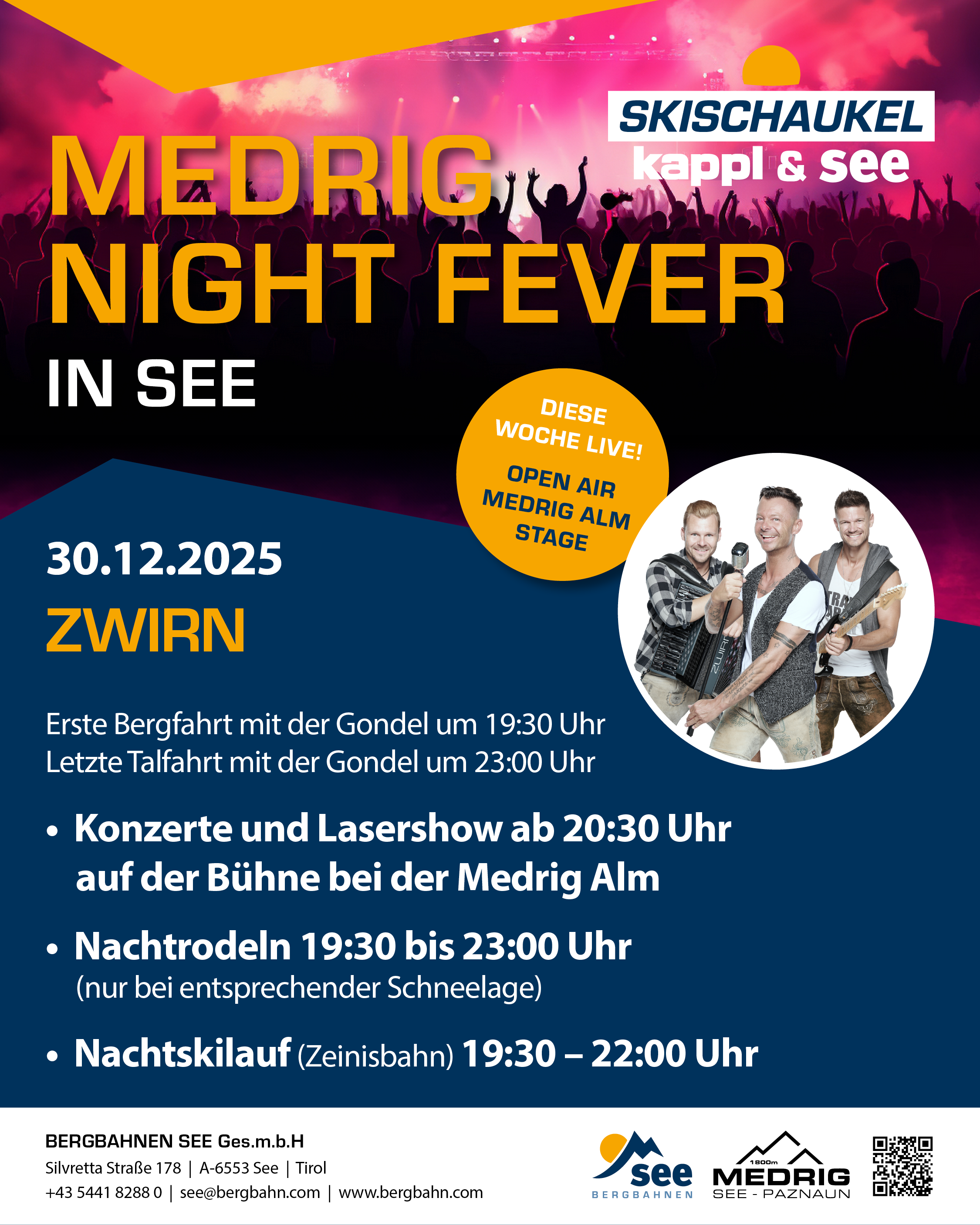 The spectacular night event is all about music, featuring its own stage and an impressive laser show. The slope remains fully open even after nightfall, creating a unique atmosphere accompanied by live performances from artists such as Loisach Marci and ZWIRN.
