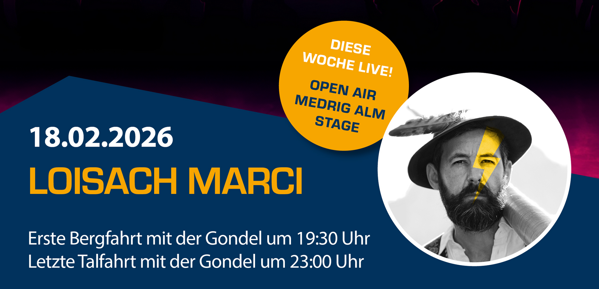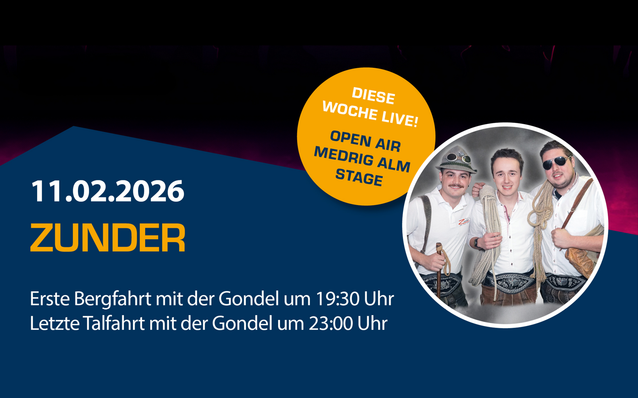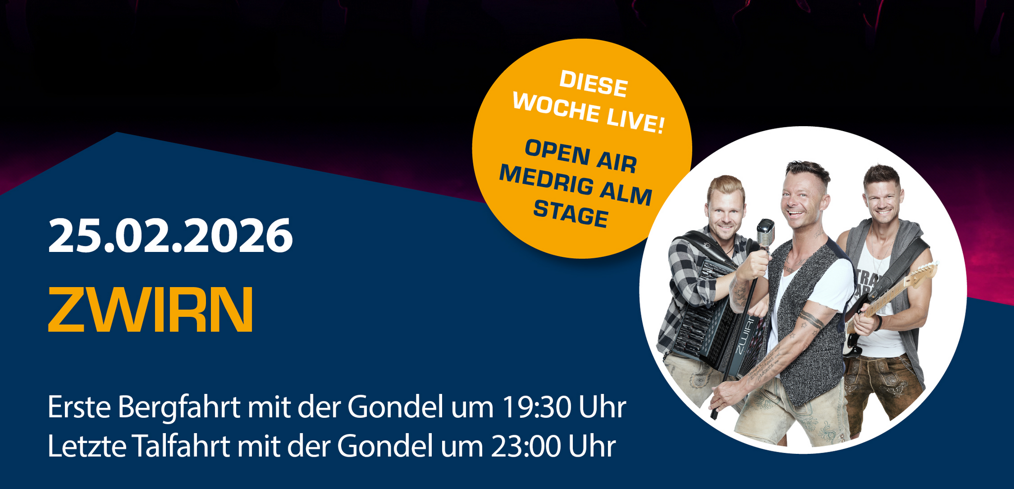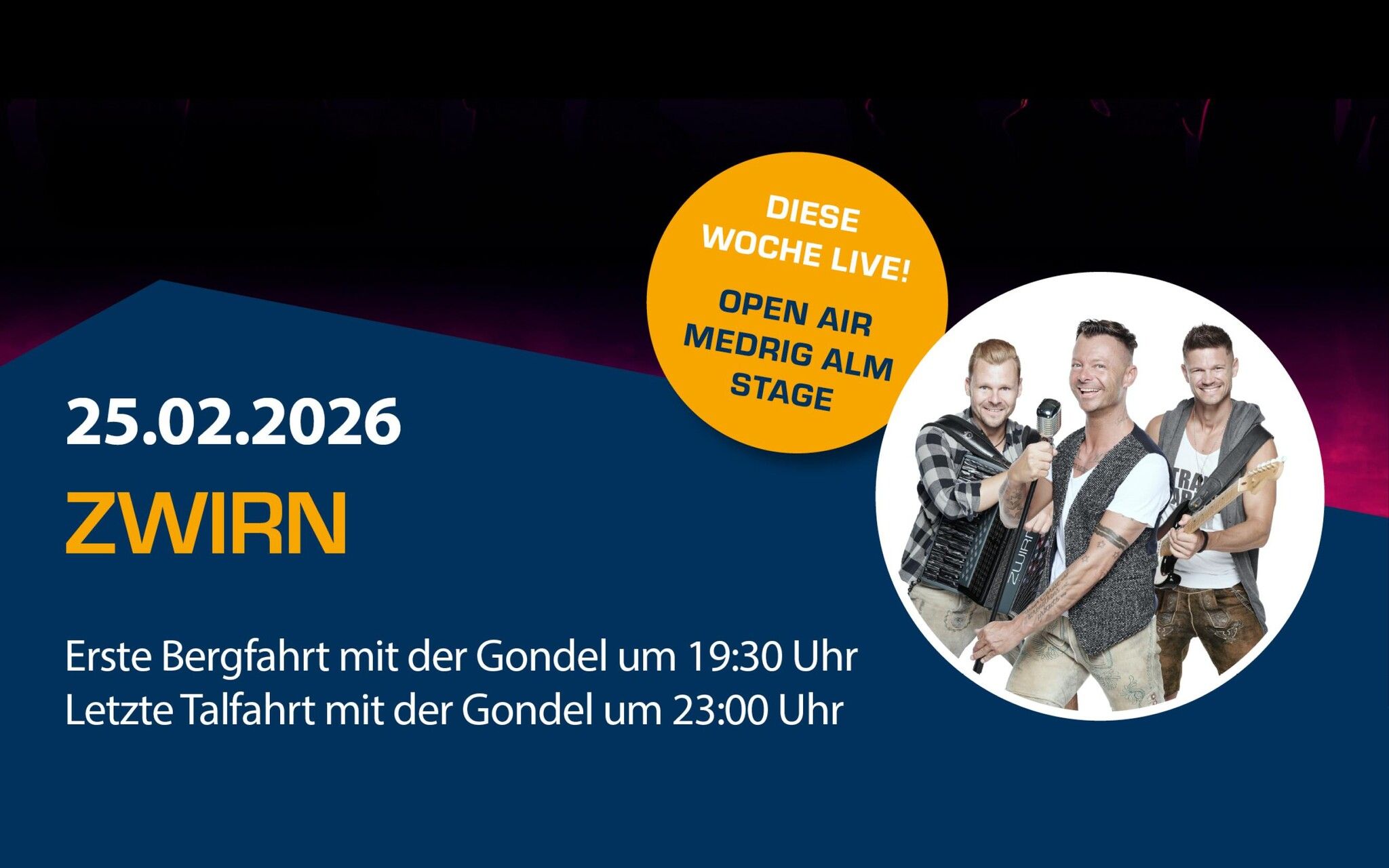 Live concert at the Medrig alm stage from 8.30 p.m.to 10.00 p.m.