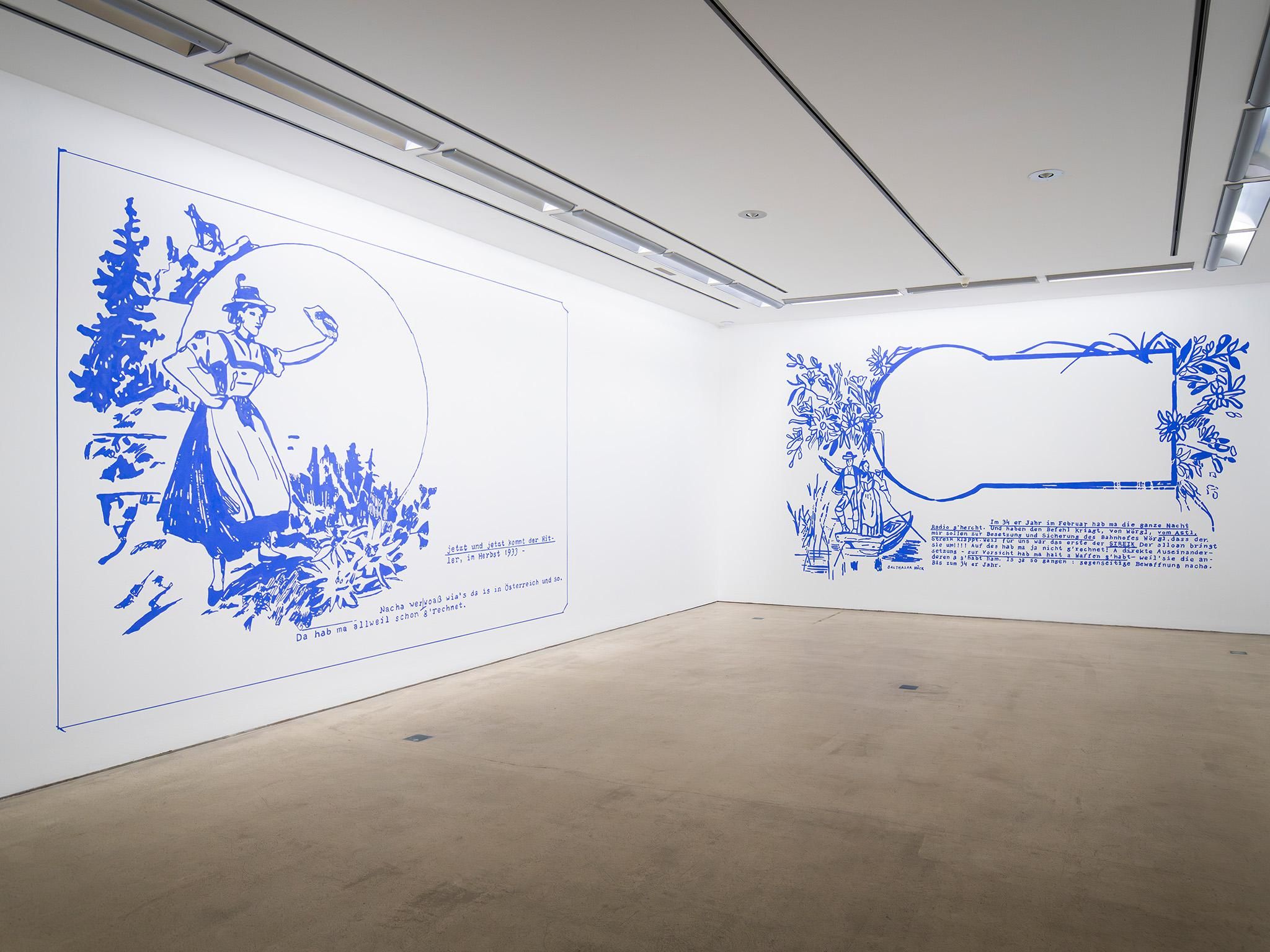 The TAXISPALAIS was temporarily a post office. The world’s first postcard was sent within the Habsburg Empire. Since then, postcards have depicted Austria as a land of magnificent mountains and snow-covered landscapes, beautiful rivers and happy people. Following her site specific approach, Daha has selected a number of historical postcards specific to Tyrol and copied them using her signature method of “blueprint”-painting, before painting them blue on the TAXISPALAIS walls. Added texts note the voices of contemporary witnesses to Austrofascism in Tyrol. Nothing here is invented; everything seems familiar and uncanny at the same time. Daha’s paintings evoke Brechtian alienation effects. Seeing is interrupted by thinking and thinking knocks against seeing.