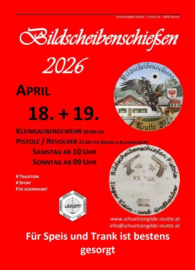 SA: 10:00 AM to dusk / SO: 09:00 AM - 05:00 PM (small caliber rifles) / Pistol + Revolver: 25 meters / Small caliber rifle: 50 meters / Award ceremony: Sun: 07:00 PM at Hotel Goldener Hirsch / Great prizes await / Food and drink are provided / Shooting takes place in all weather conditions / More information at: https://www.schuetzengilde-reutte.at/