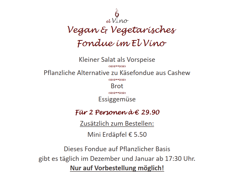 Daily from 5:30 PM / The fondue on a vegan & vegetarian basis is only available by pre-order - from 2 people at €29.90 / Reservations at: +43 5672 67674 / Enjoy beautiful and delightful moments during the shorter days with us / We look forward to your visit!