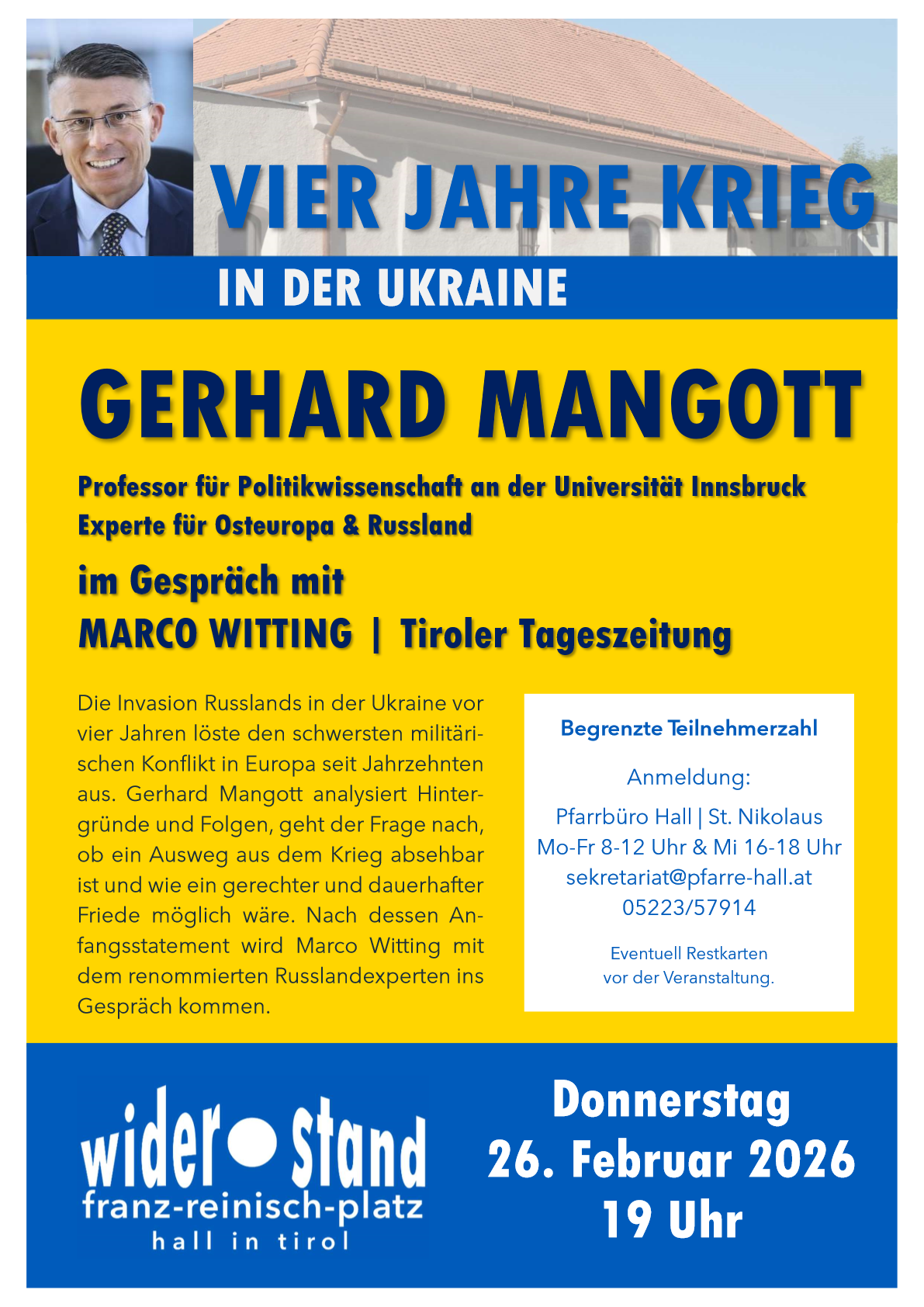 The invasion of Ukraine by Russia four years ago triggered the most severe military conflict in Europe in decades. Gerhard Mangott analyzes the background and consequences, explores the question of whether a way out of the war is foreseeable, and how a just and lasting peace could be possible. After his opening statement, Marco Witting will engage in conversation with the renowned Russia expert.