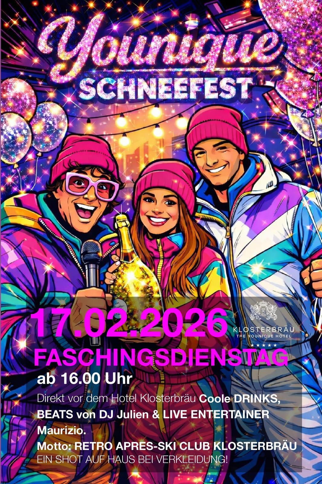 Retro vibes, cool beats & real après-ski feeling! Under the motto "Retro Après Ski Club Klosterbräu," we celebrate an unforgettable snow party with DJ beats from Julien and live entertainer Maurizio. Cool drinks, relaxed atmosphere, party sound to go wild. Special: Those who come in costume get a shot on the house! Slip in, warm up, and dance – the Younique snow festival is waiting for you!