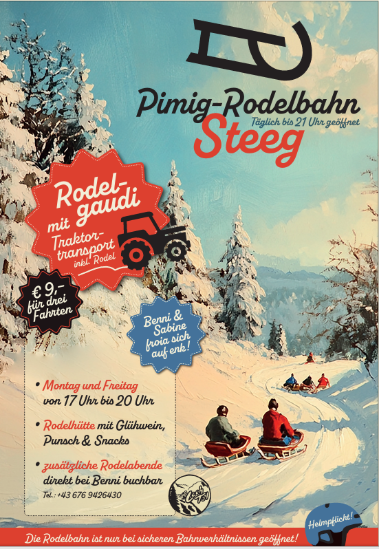 Rodelgaudi in Steeg auf der Pimig-RodelbahnPlace:Steeg:10. Mar 2026 - 20. Mar 2026:see the eventsee the event: Rodelgaudi in Steeg auf der Pimig-Rodelbahn